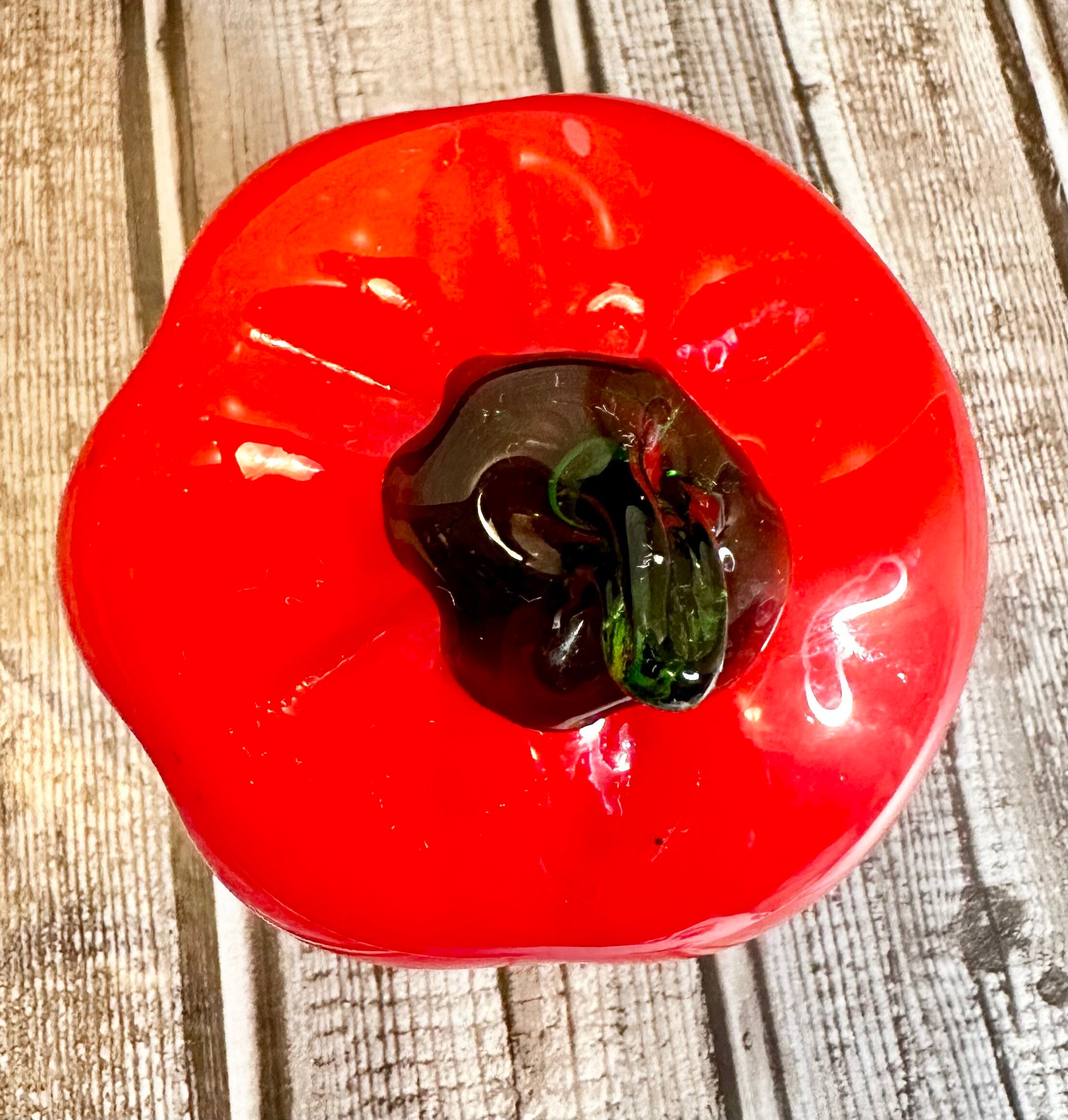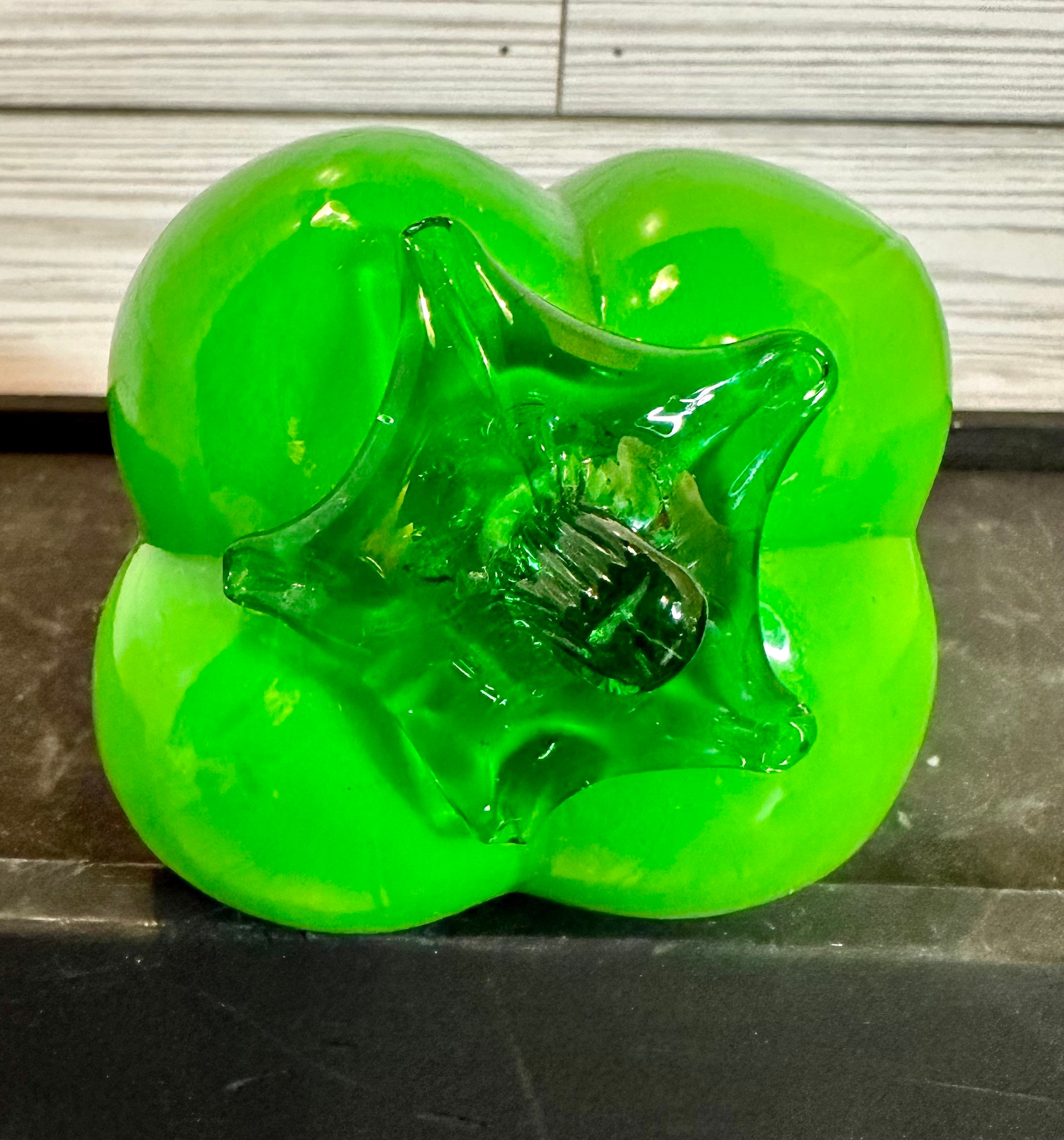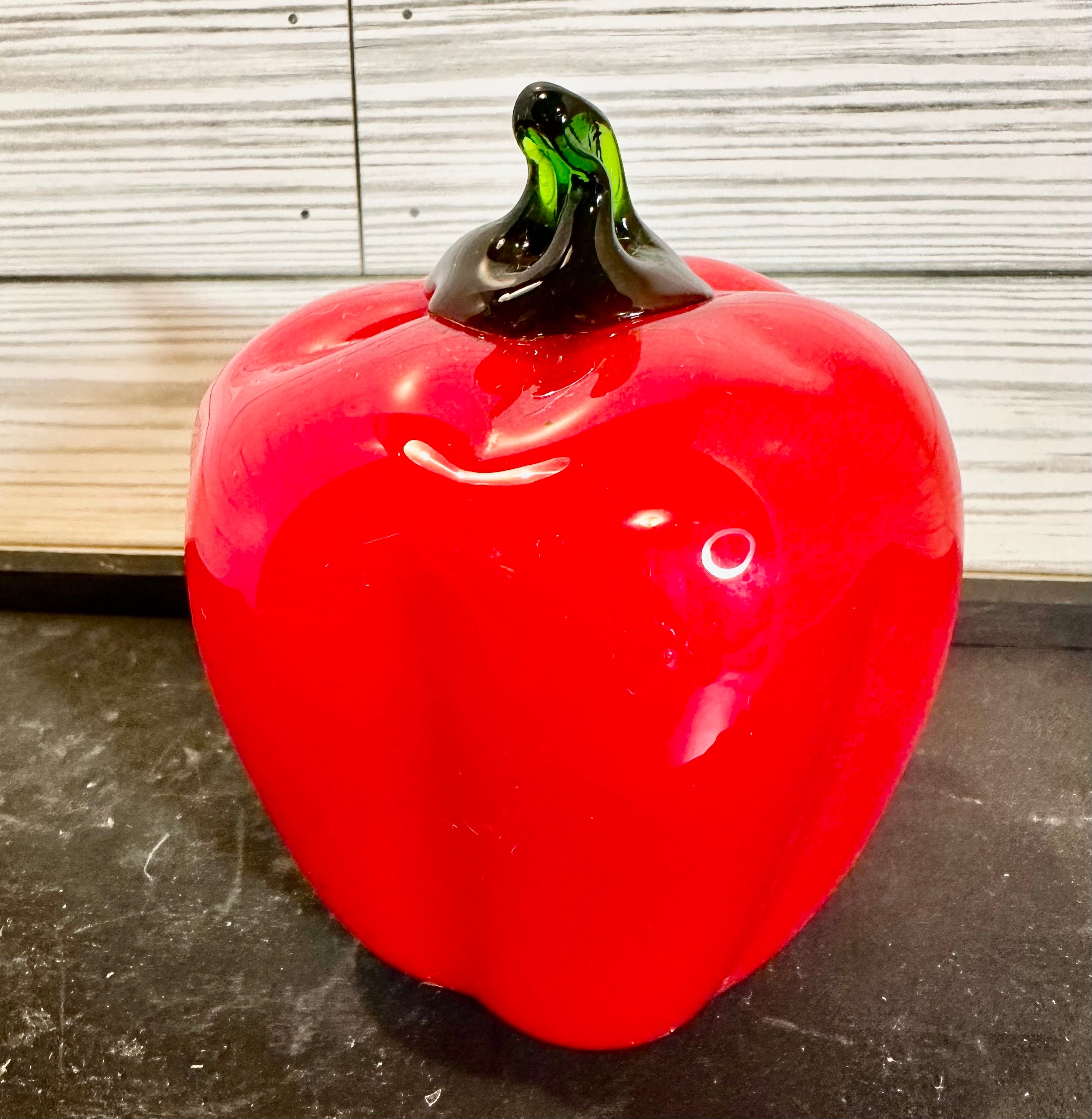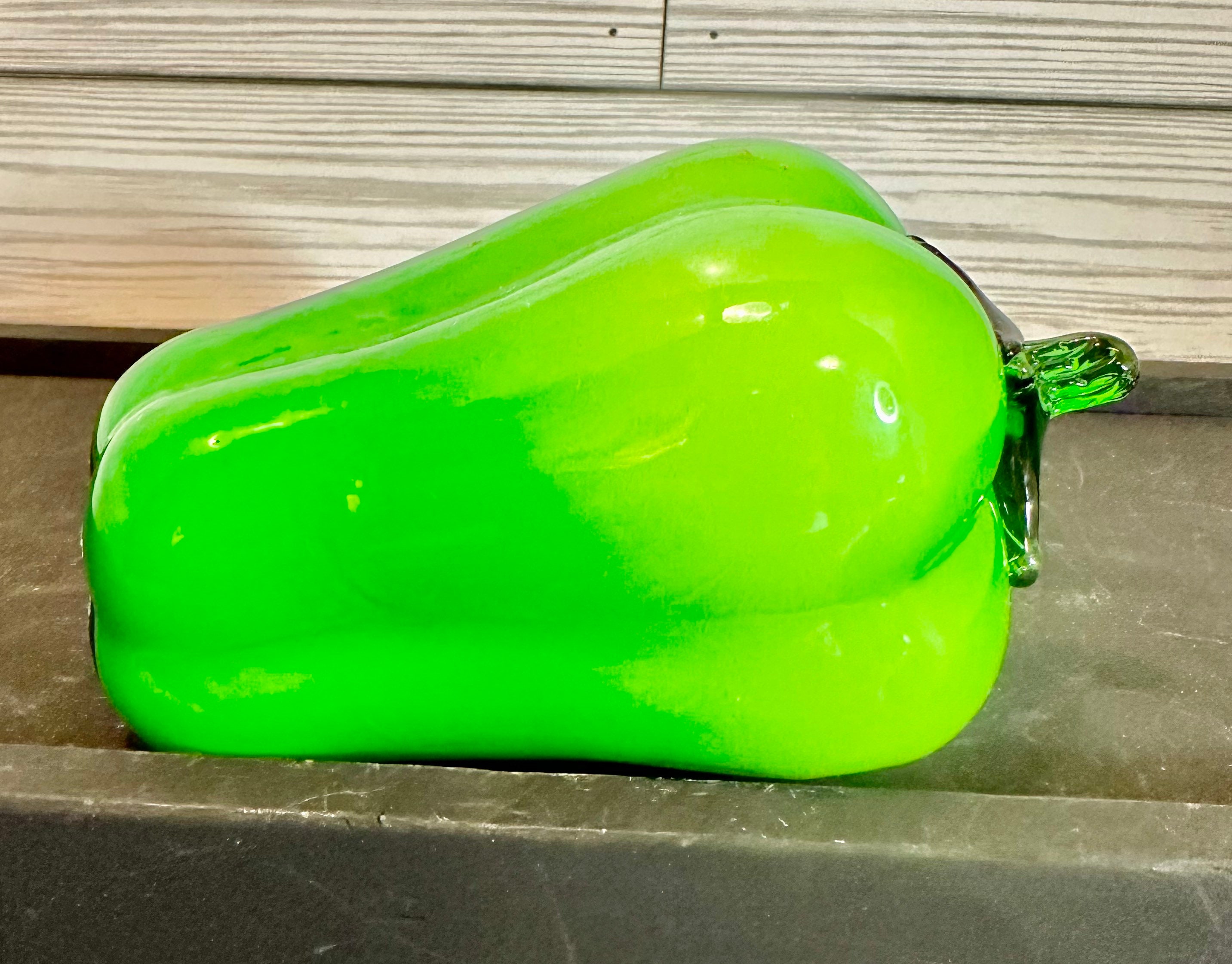 Hand blown art glass. Green and red pepper and a peach. Good condition. Green pepper does have a line in glass. See pics.