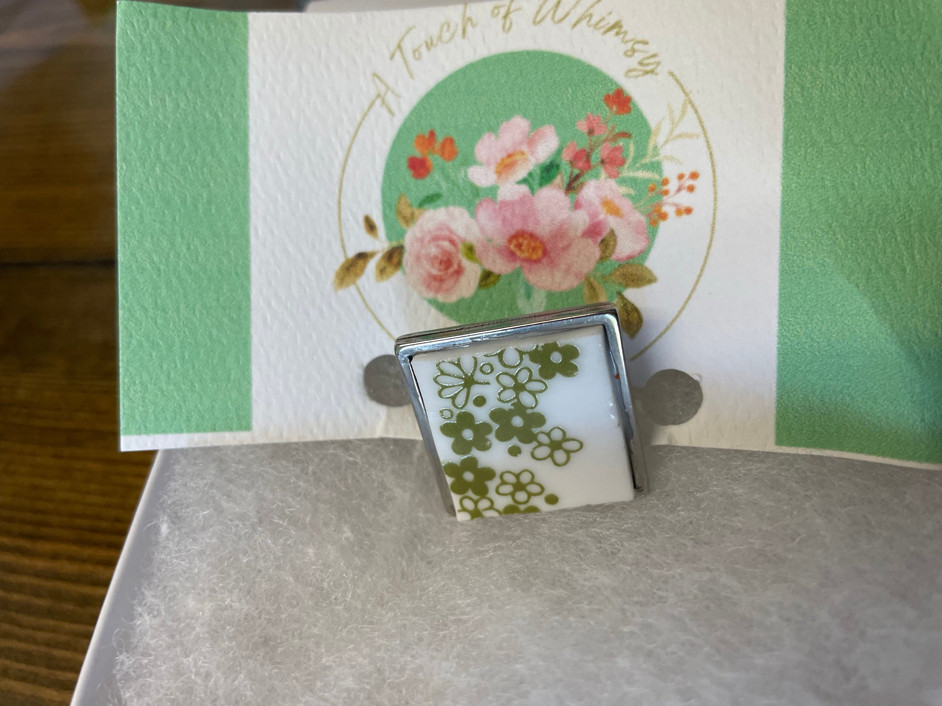 Discover this one-of-a-kind hand crafted statement ring made from a beautiful vintage 1970s Corningware plate featuring the charming “Spring Blossom” pattern. Each piece is lovingly handmade and thoughtfully repurposed, ensuring that you possess a truly unique accessory that is sure to spark conversation.