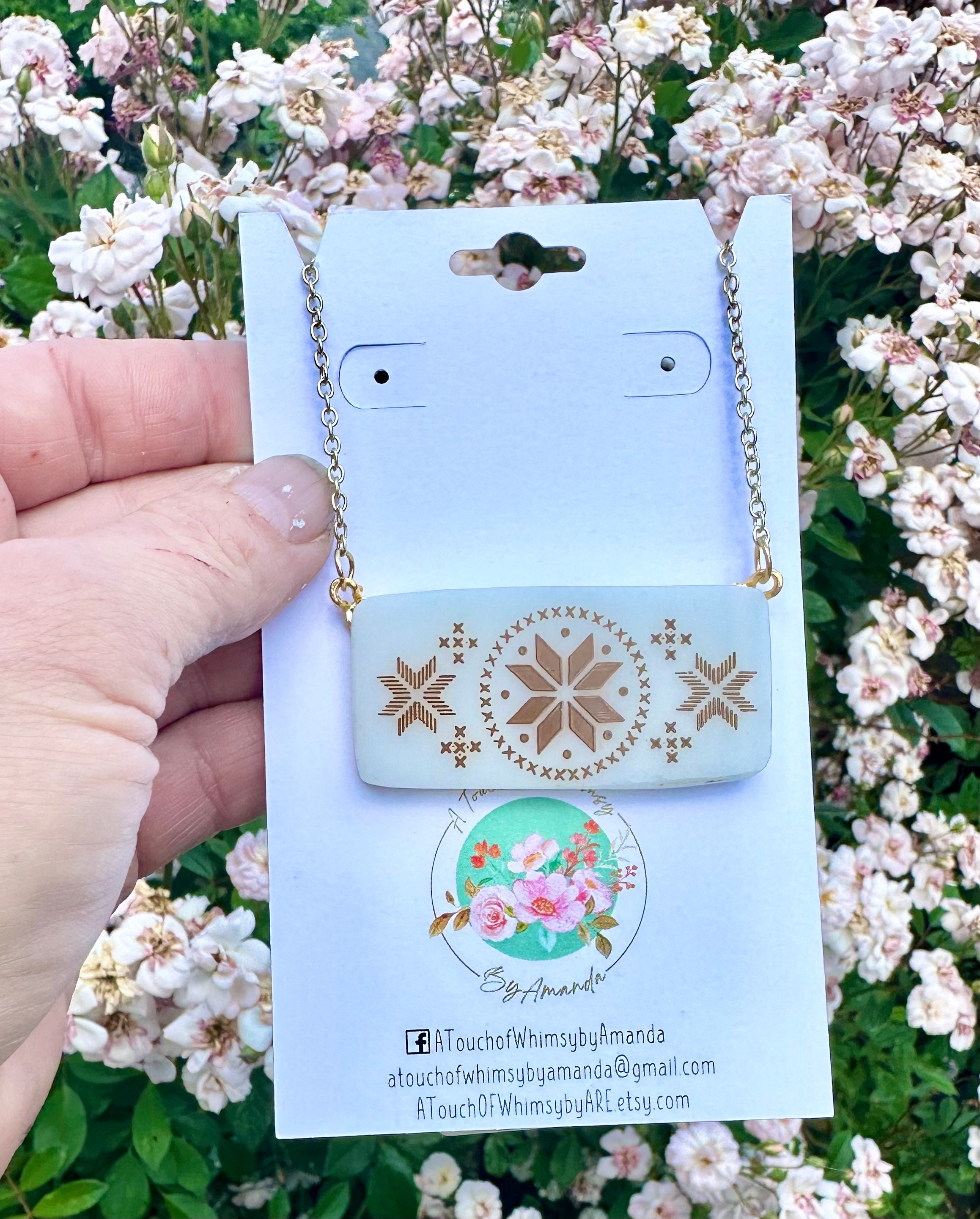 This one-of-a-kind statement piece is handmade and repurposed using a vintage Town and Country Pyrex refrigerator dish. The edges have been carefully cut and filed down for a smooth finish, while the back of the pendant is gold-leafed and resin is applied for an added touch of sophistication. If you’re interested, a matching earrings can be found in another listing.