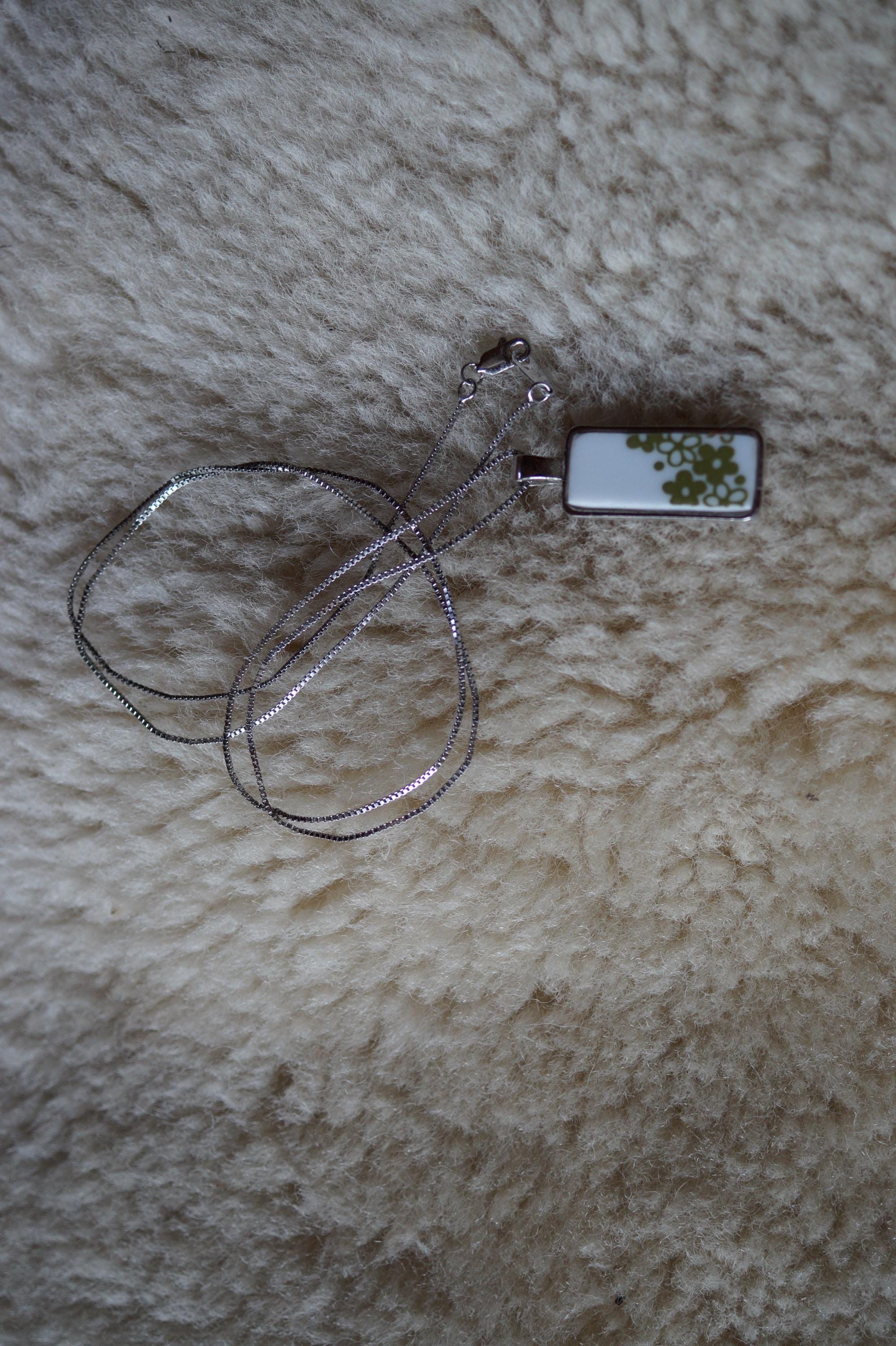 - **Material:** Silver alloy, gold alloy, stainless steel, or sterling silver coated bezel and stainless steel findings, repurposed vintage dinner plate. Alloy and Stainless steel will come in stainless steel cable necklace, sterling silver will come on a sterling silver coated necklace