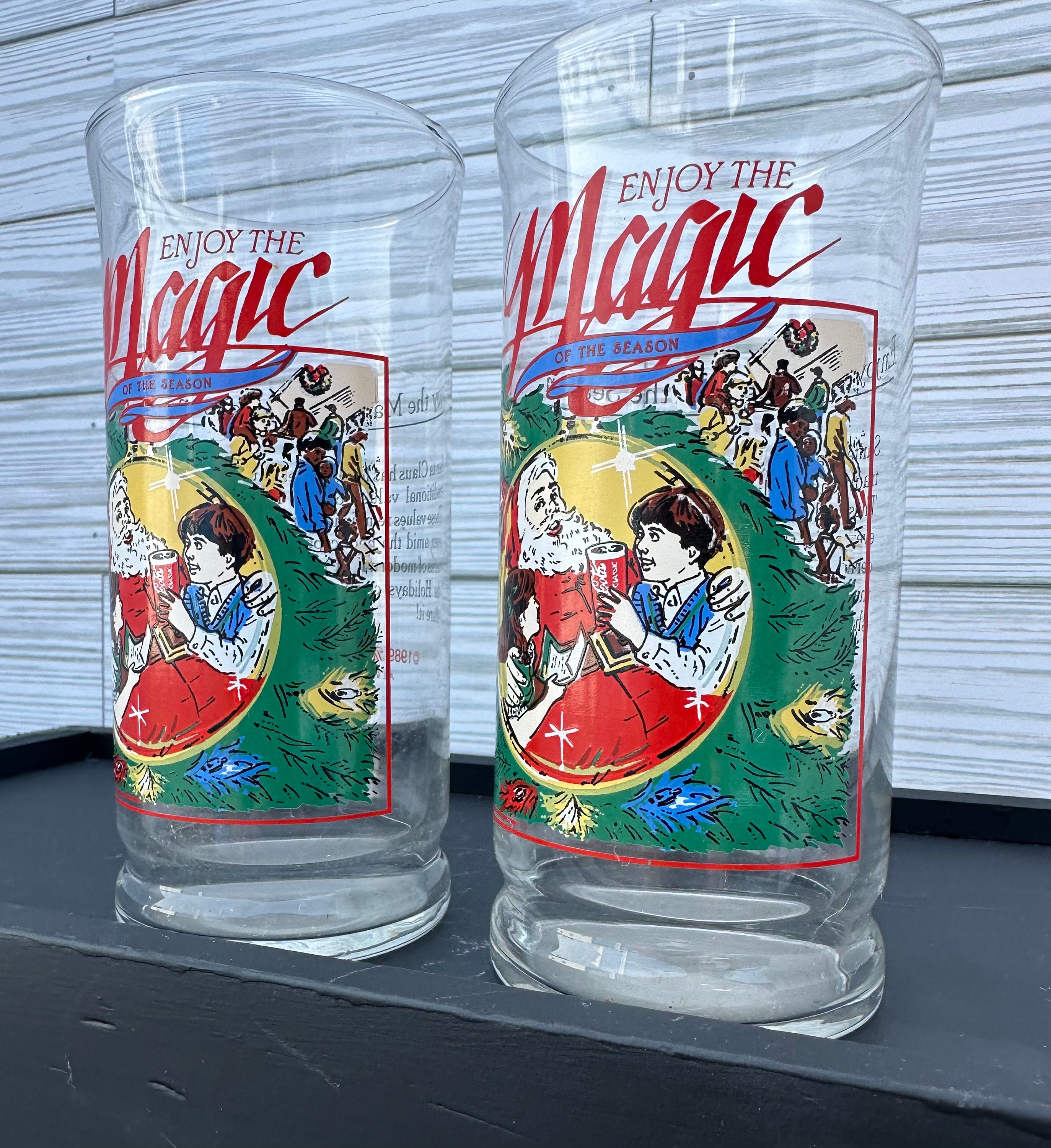 2 Collectible Vintage Coca Cola Glass Tumblers "Enjoy the Magic of Christmas" 1989 In good condition. The glasses have no chips or cracks and the paint is also in good condition. Glass tumblers with painted Coca Cola advertising Smooth rounded top rim Painted advertising "Enjoy The Magic of the Season" on top on front and back A girl and boy are pictured sitting on Santa's lap with the boy holding a glass of Coca Cola. "Santa Clause has long represented the traditional values of the Holidays. These values remain important today; even amid the hectic pace and concerns of modern living. The magic the Holidays continues...enjoy it; share it! These words hold true today." is written on the other side. Copyright 1989 Approx. 6 inches tall Approx. 2 7/8 inches across the top rim outer edges Approx. 2 3/4 inches across glass bottom Weighs approx. 7.6 ounces Holds approx. 16 liquid ounces filled to the top The last 2 photos were taken with white paper inside the glass to better show the writing.