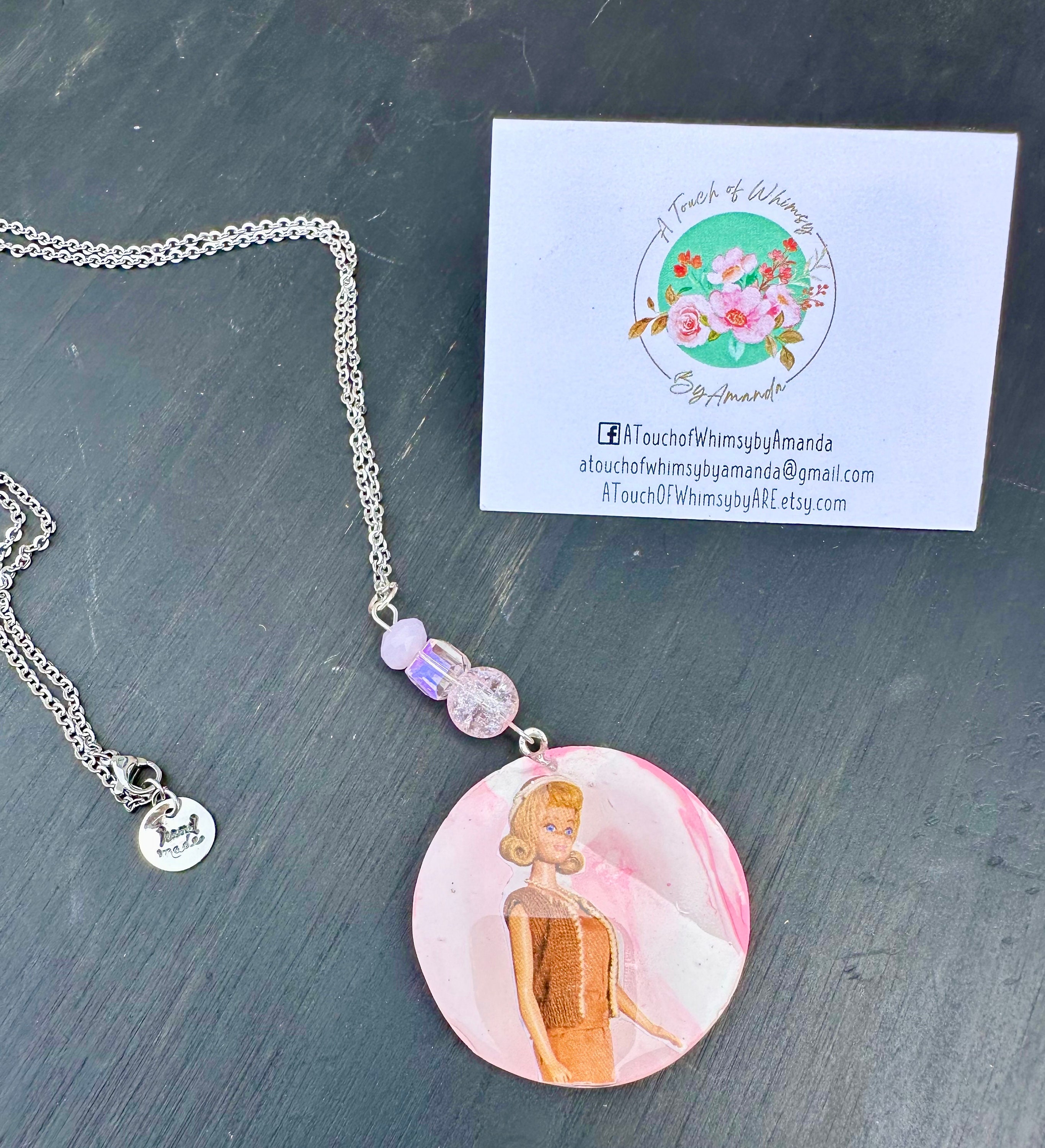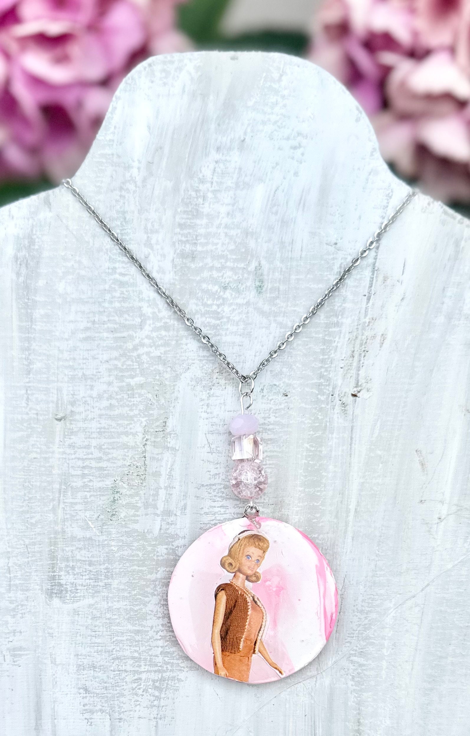 This one-of-a-kind Barbie Midge necklace is sure to make a bold statement! Featuring 1960s original Midge photograph. Mounted and coated in resin on an circle polymer clay pendants. This unique piece is mounted on a 22" stainless steel necklace. You will be sure to get plenty of compliments when wearing it!************************ A Touch of Whimsy by Amanda Specializing in one of a kind pieces since 2006.