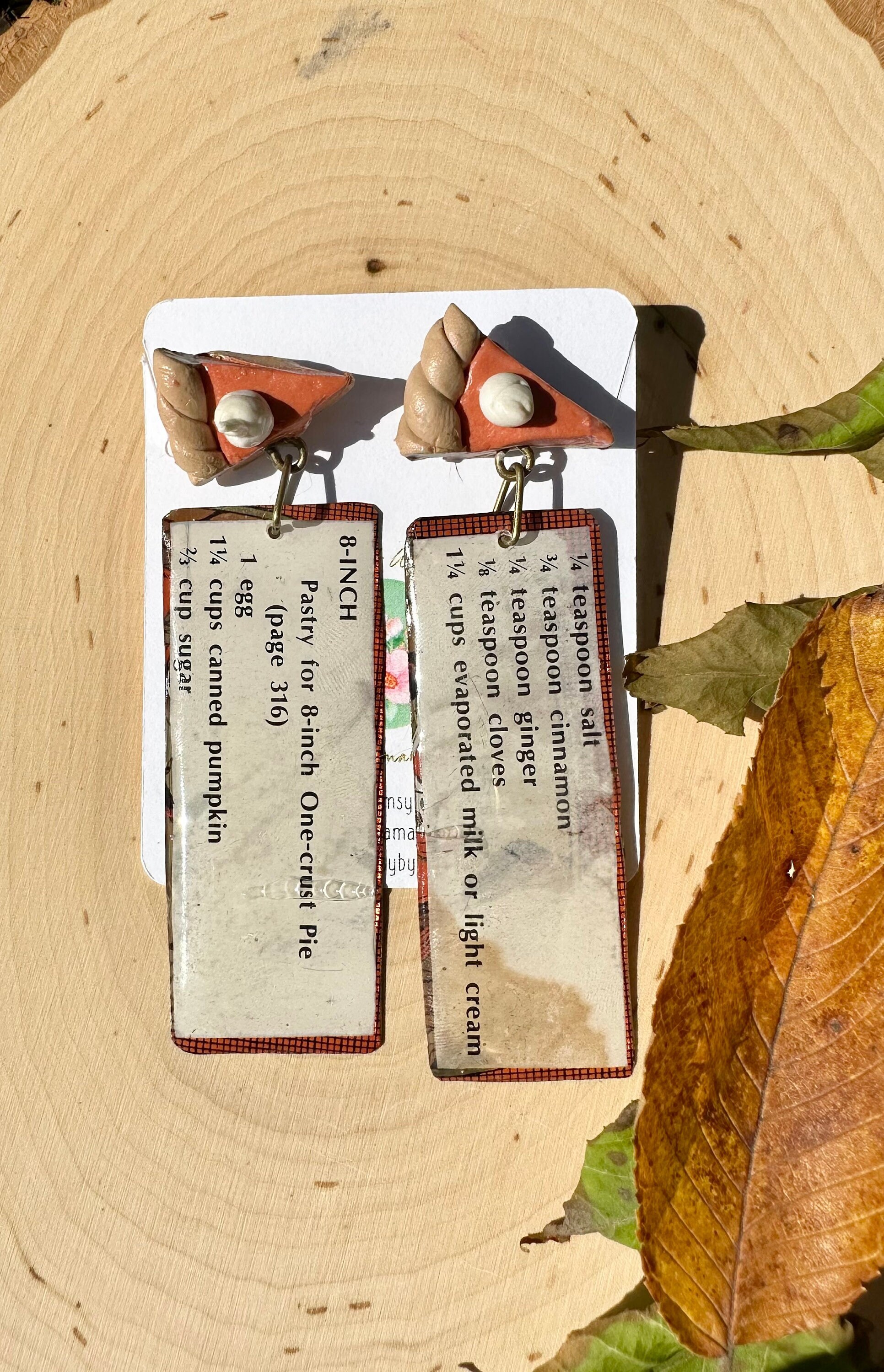 The earrings feature a pumpkin pie recipe, complete with all the smudges left from the original owner that only add to their charm. I hand molded the pumpkin pies and whipped cream out of clay and then added a post to the back. The recipe is mounted on a vintage tin canister, which I cut down, filed, and hammered to make it smooth. I then sealed the recipe with a protective layer of resin.