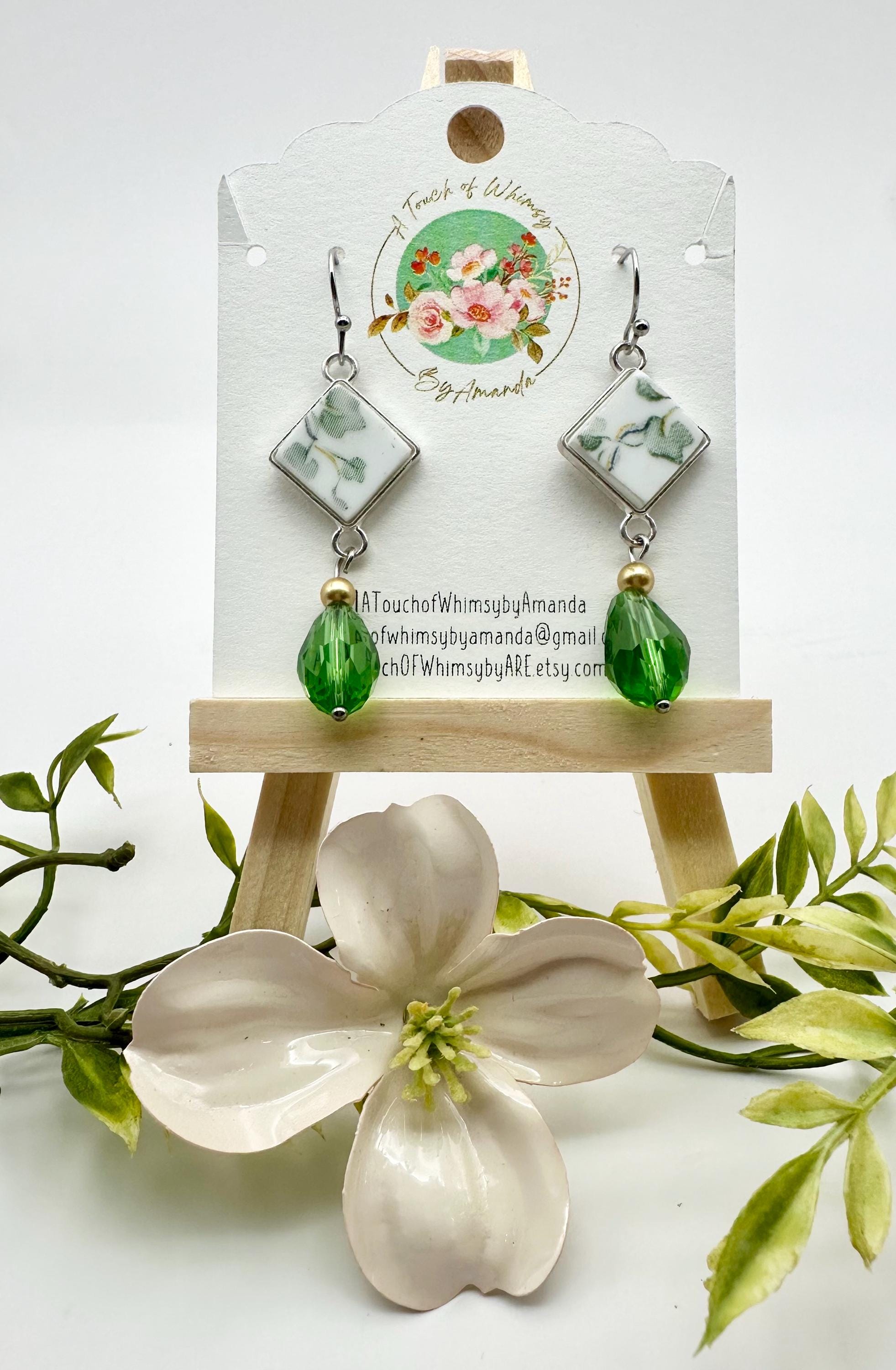 Beautiful Vintage Correlle Callaway Green Ivy broken china earrings with glass iridescent green beads