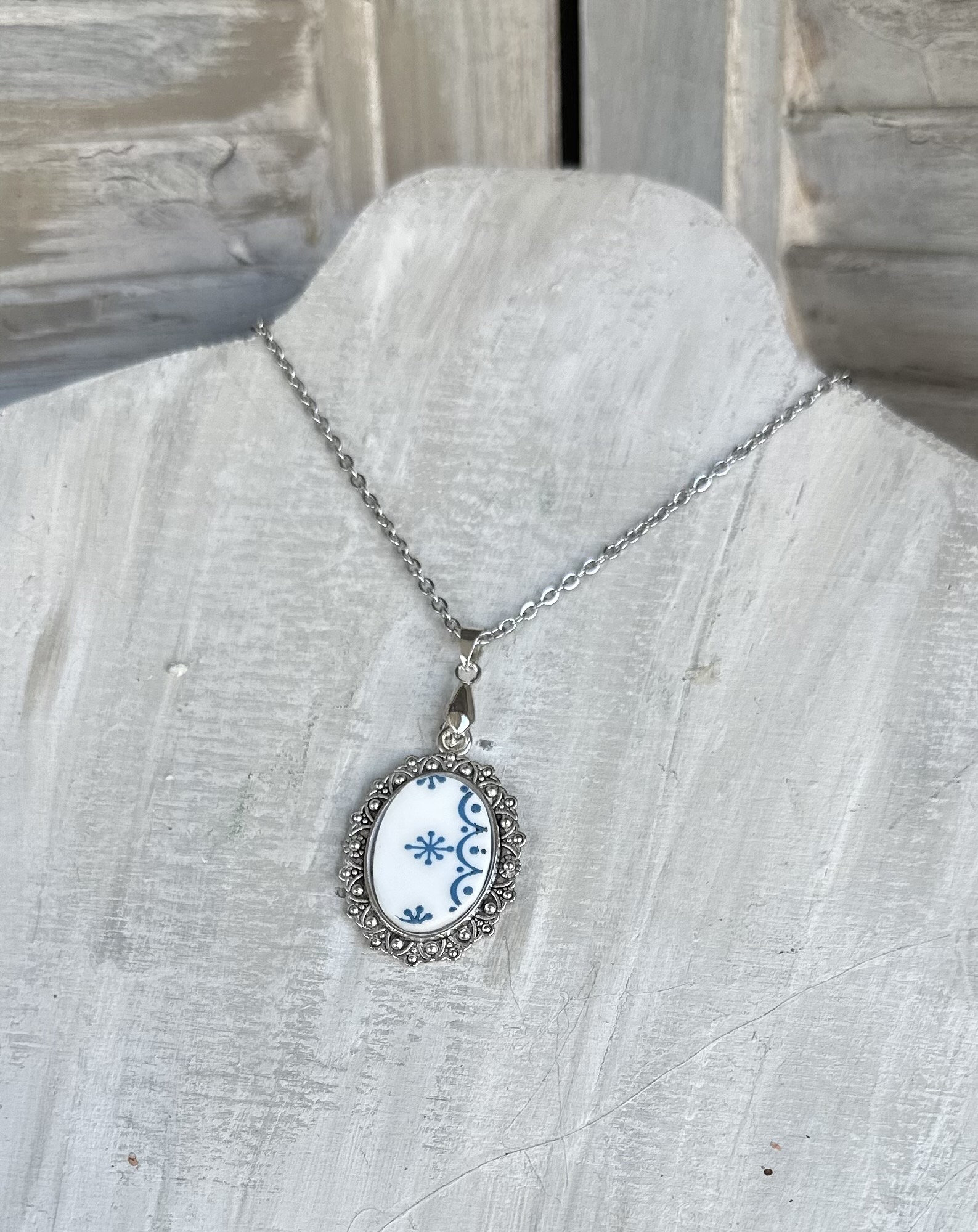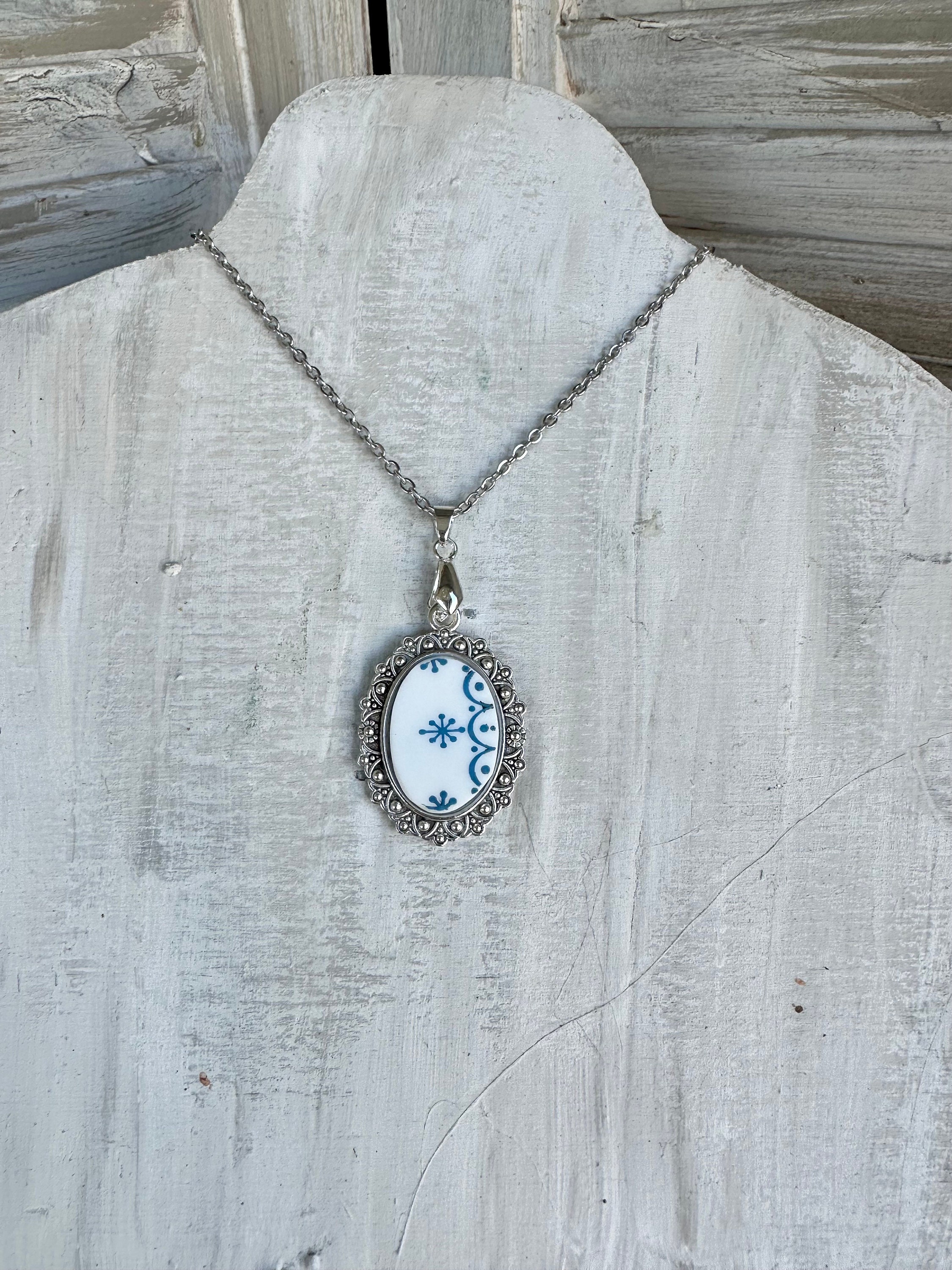 My broken China Jewelry, made out of a vintage 1970s Correlle plate “Snowflake Blue”, is sure to be a conversation starter. This one of a kind necklace is crafted with love and attention to detail. The piece of Correlle is cut and grinded smooth on edges, then set on a silver bezel and matching findings.