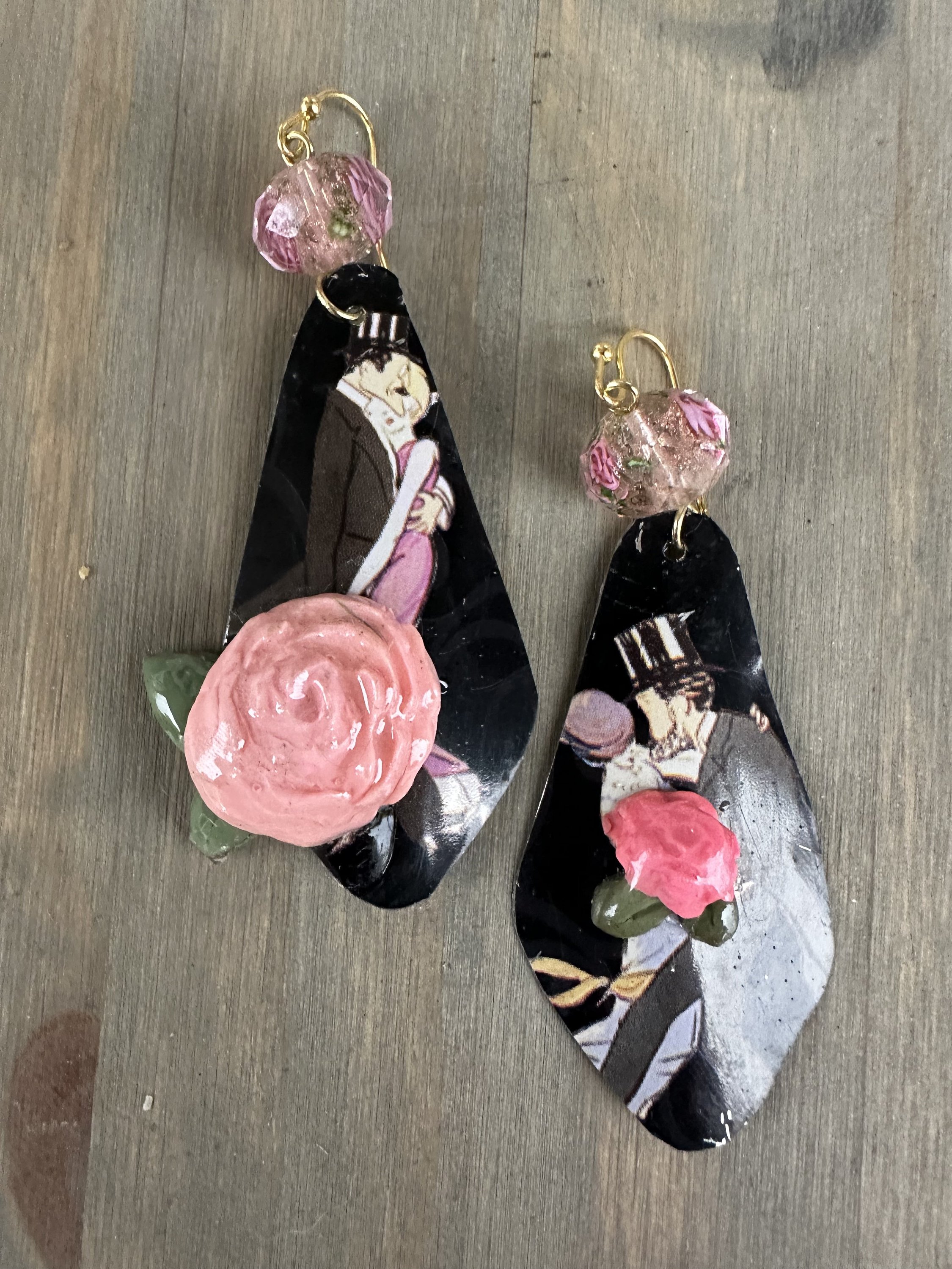This unique tin piece has been meticulously hand-crafted by me, using a vintage chocolate tin. It is then carefully attached to elegant gold findings, creating a stunning contrast. The exquisite design depicts men and women dressed in their finest attire, gracefully dancing. To enhance its beauty, I have embellished the piece with clay flowers coated in resin, adding an extra touch of charm. The overall look is completed with crystal rose embedded beads, adding a touch of sophistication to this one-of-a-kind creation.