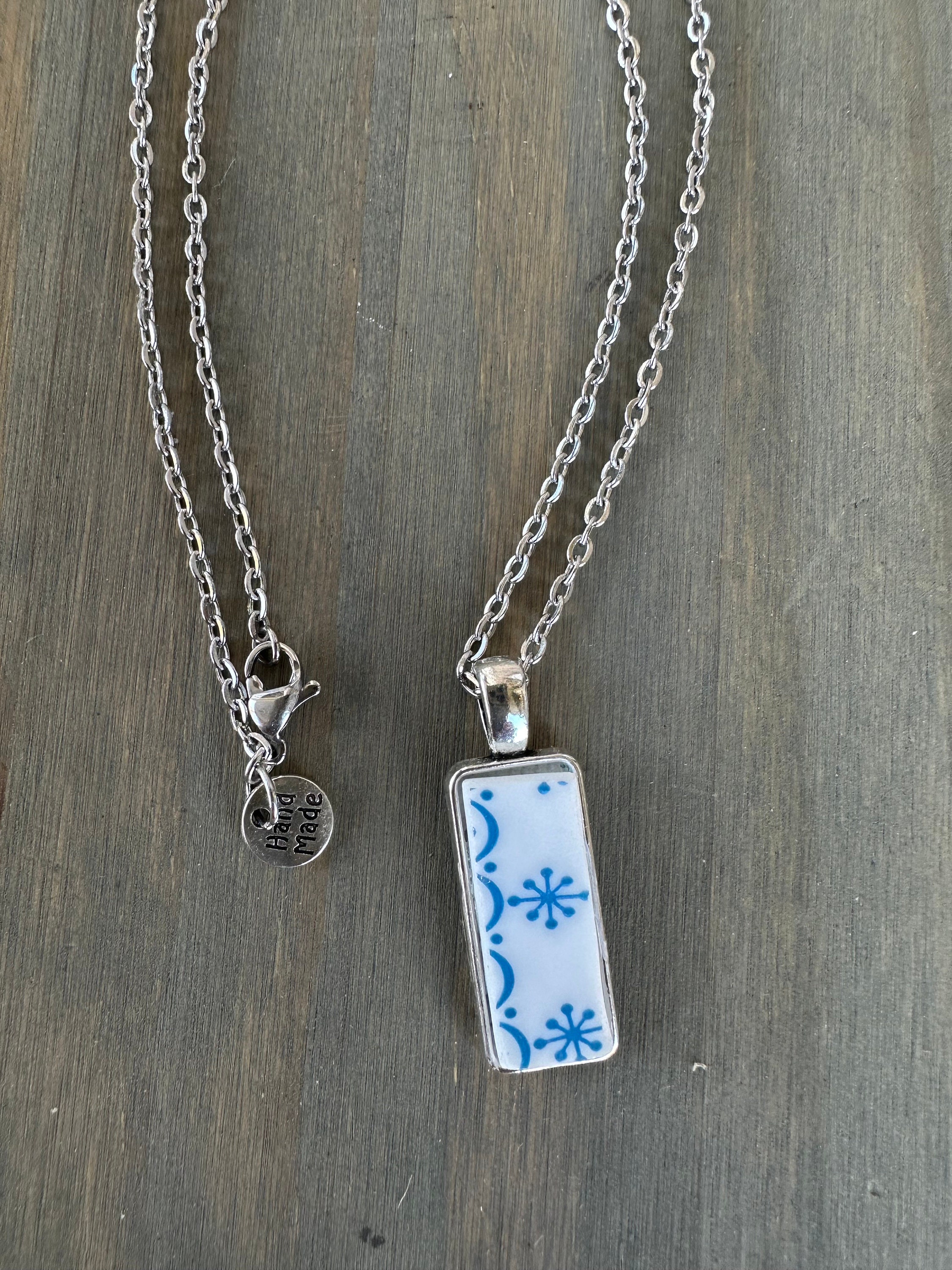 My broken China Jewelry, made out of a vintage 1970s Correlle plate “Snowflake Blue”, is sure to be a conversation starter. This one of a kind necklace is crafted with love and attention to detail. The piece of Correlle is cut and grinded smooth on edges, then set on a silver bezel and matching findings.