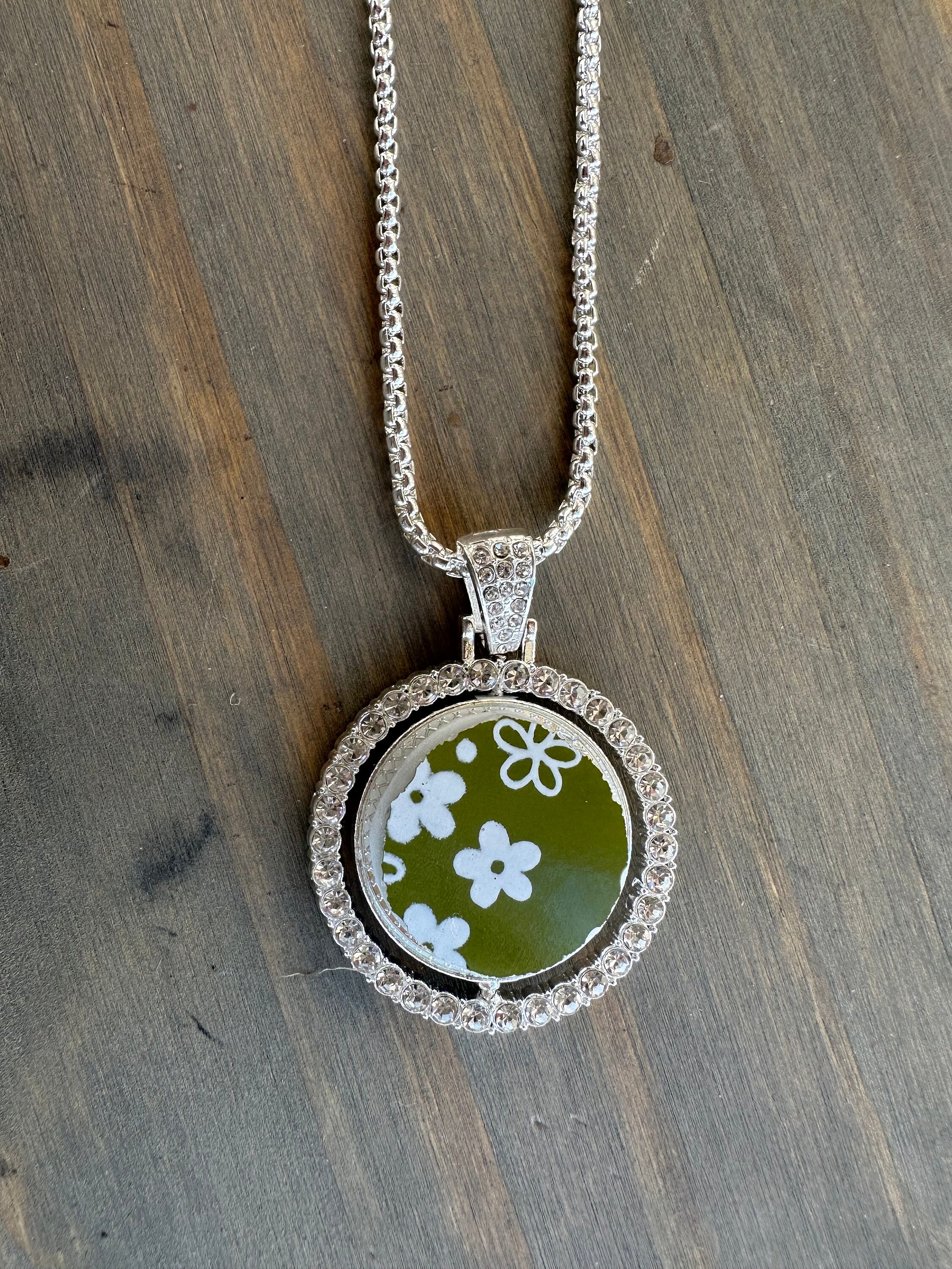 My broken China Jewelry, made out of a vintage 1970s Pyrex Casserole dish “Spring Blossom”, is sure to be a conversation starter. This one of a kind necklace is crafted with love and attention to detail. I was inspired to make the first one to honor my mother, who had the same pattern. The piece of Pyrex is cut and grinded smooth on edges, then set on a silver bezel and matching findings.