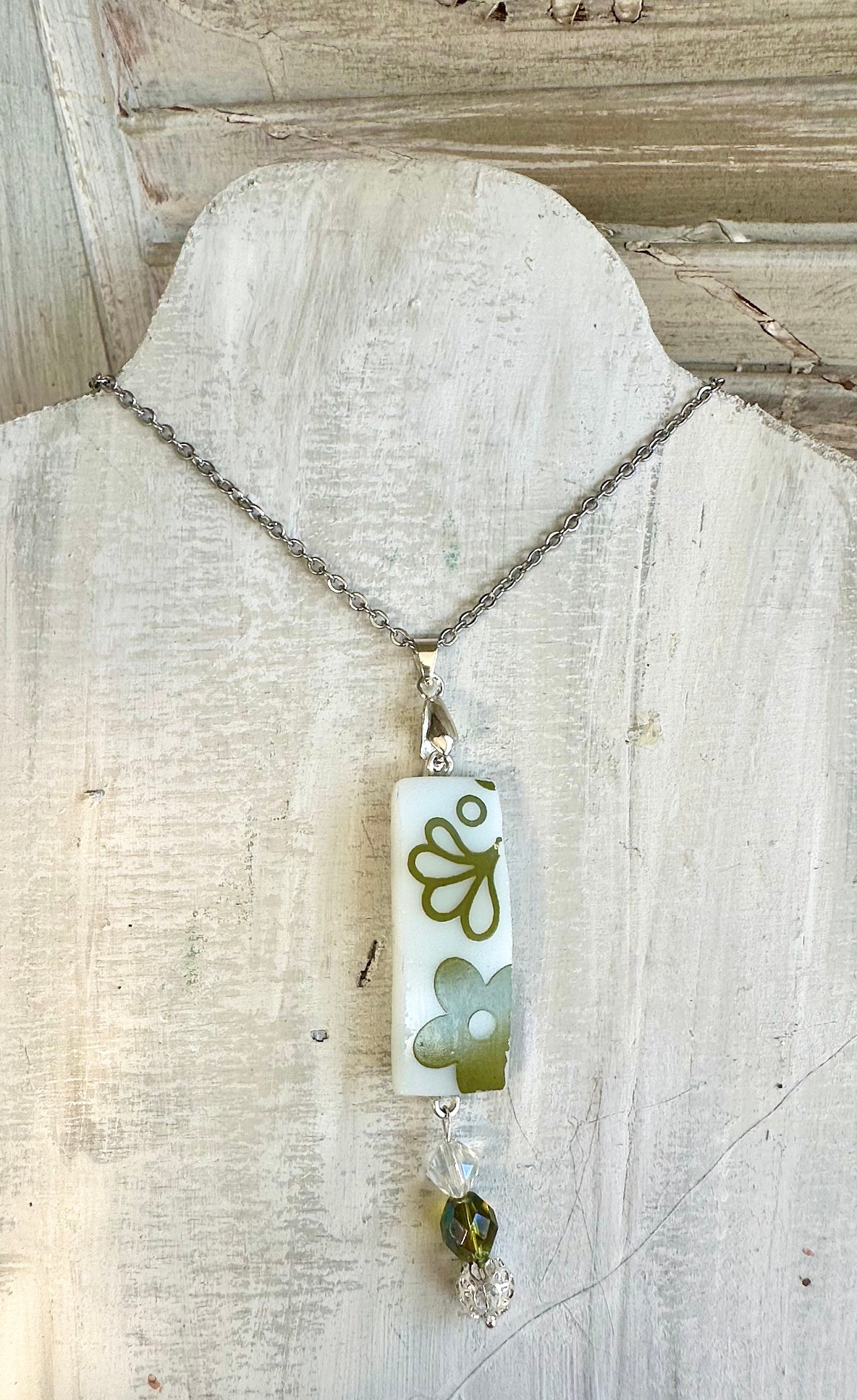 My broken China Jewelry, made out of a vintage 1970s Pyrex bowl “Spring Blossom”, is sure to be a conversation starter. This one of a kind necklace is crafted with love and attention to detail. I was inspired to make the first one to honor my mother, who had the same pattern. The piece of Pyrex is cut and grinded smooth on edges, then set on a silver bezel and matching findings.