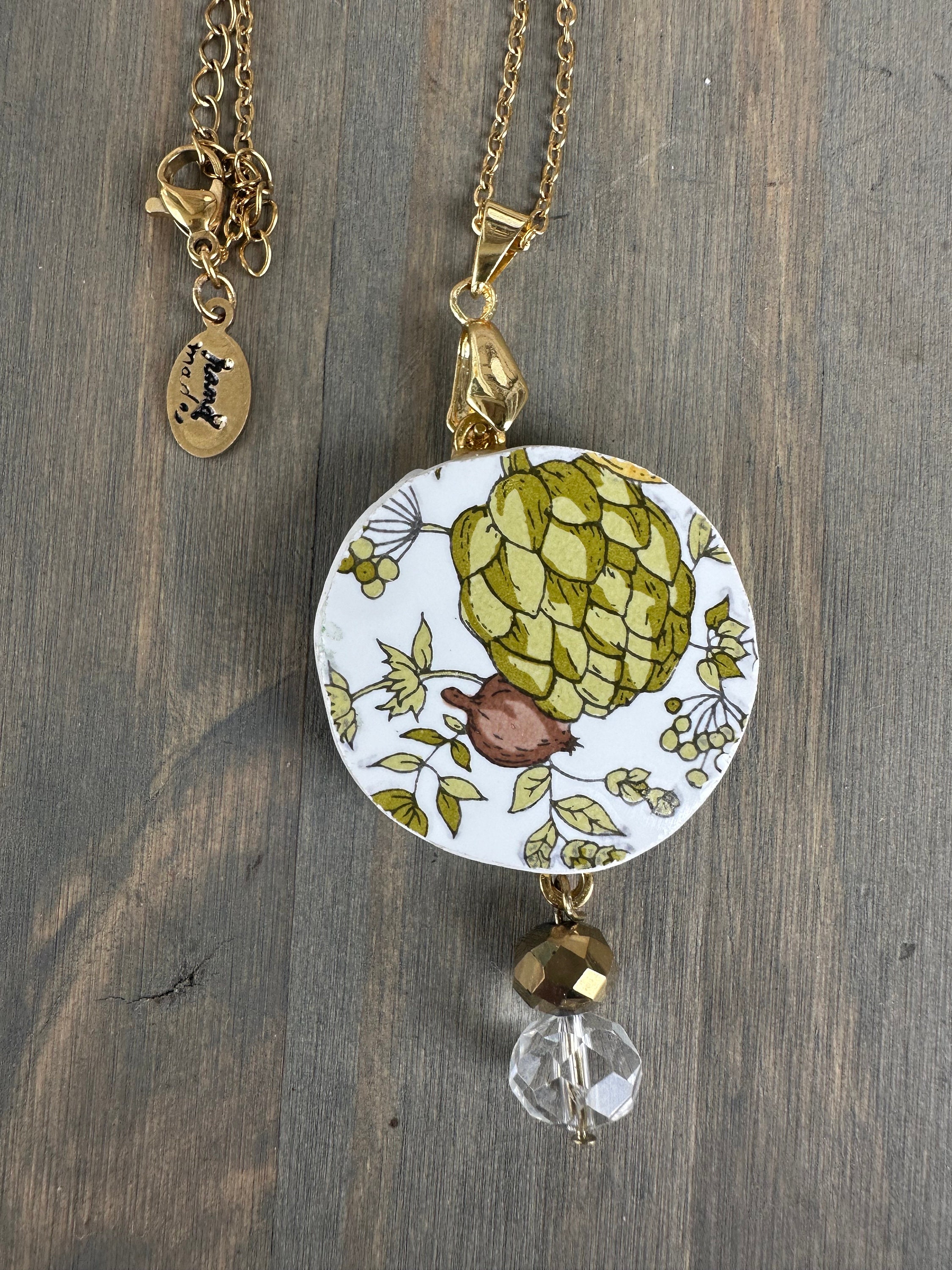 Pendant piece back metallic leafed and covered in resin. Iridescent beads compliment the colors in f the piece. Necklace measures 20” Made out of hypoallergenic stainless steel.