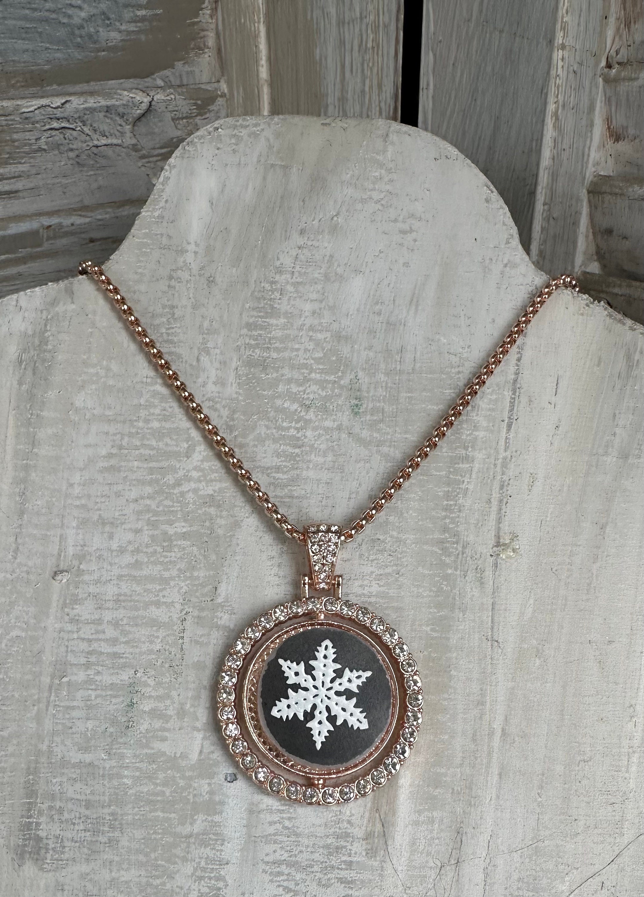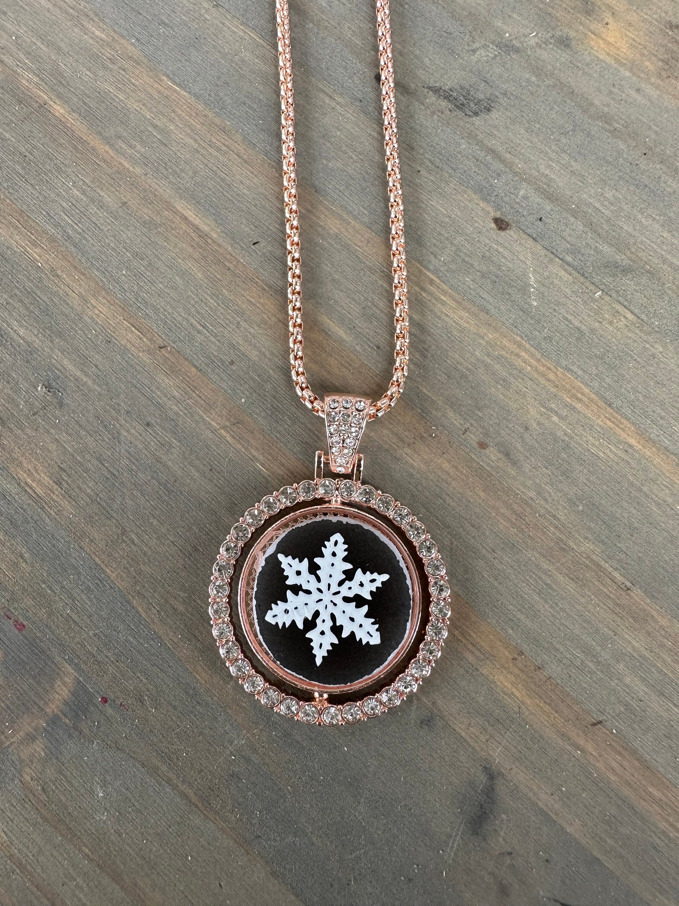 This one-of-a-kind statement piece is handmade and repurposed using a vintage Pyrex Snowflake on Charcoal casserole dish. The edges have been carefully cut and filed down for a smooth finish. Piece is set on rose gold rhinestone bezel with thick matching necklace.