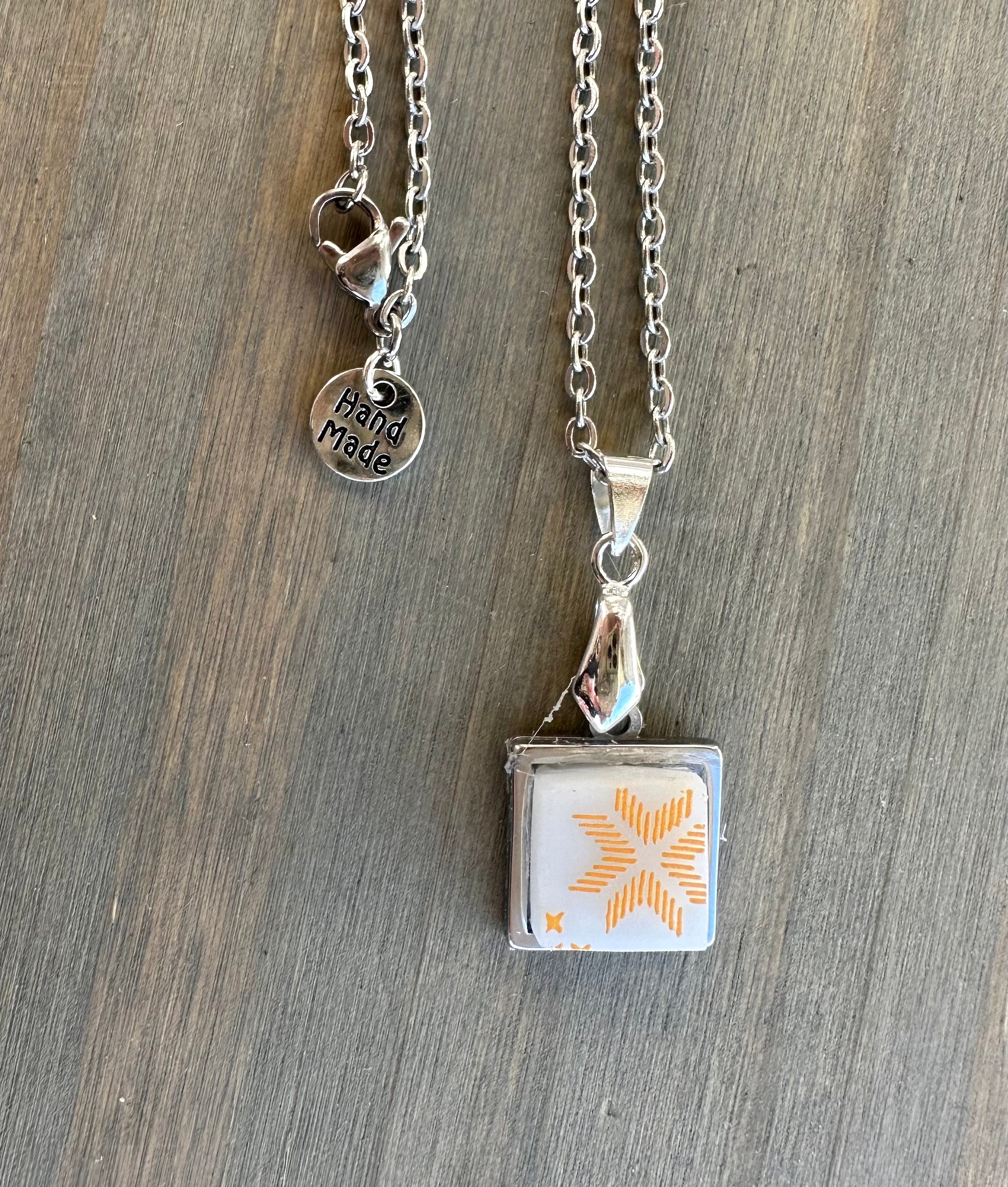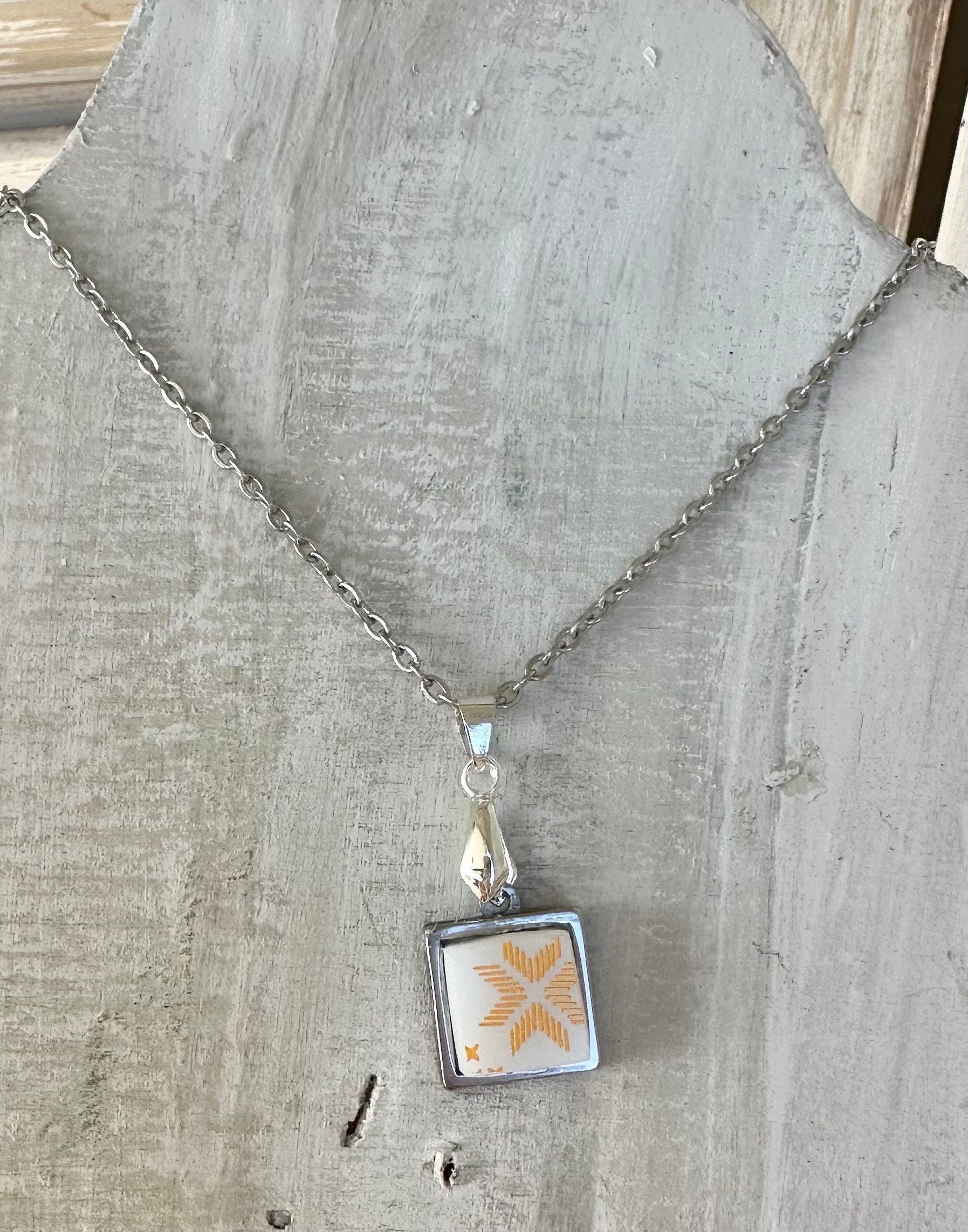 This one-of-a-kind statement piece is handmade and repurposed using a vintage Gold Town and Country Pyrex refrigerator dish. The edges have been carefully cut and filed down for a smooth finish. Piece is set on stainless steel 10mm stainless steel bezel and 20in stainless steel necklace.