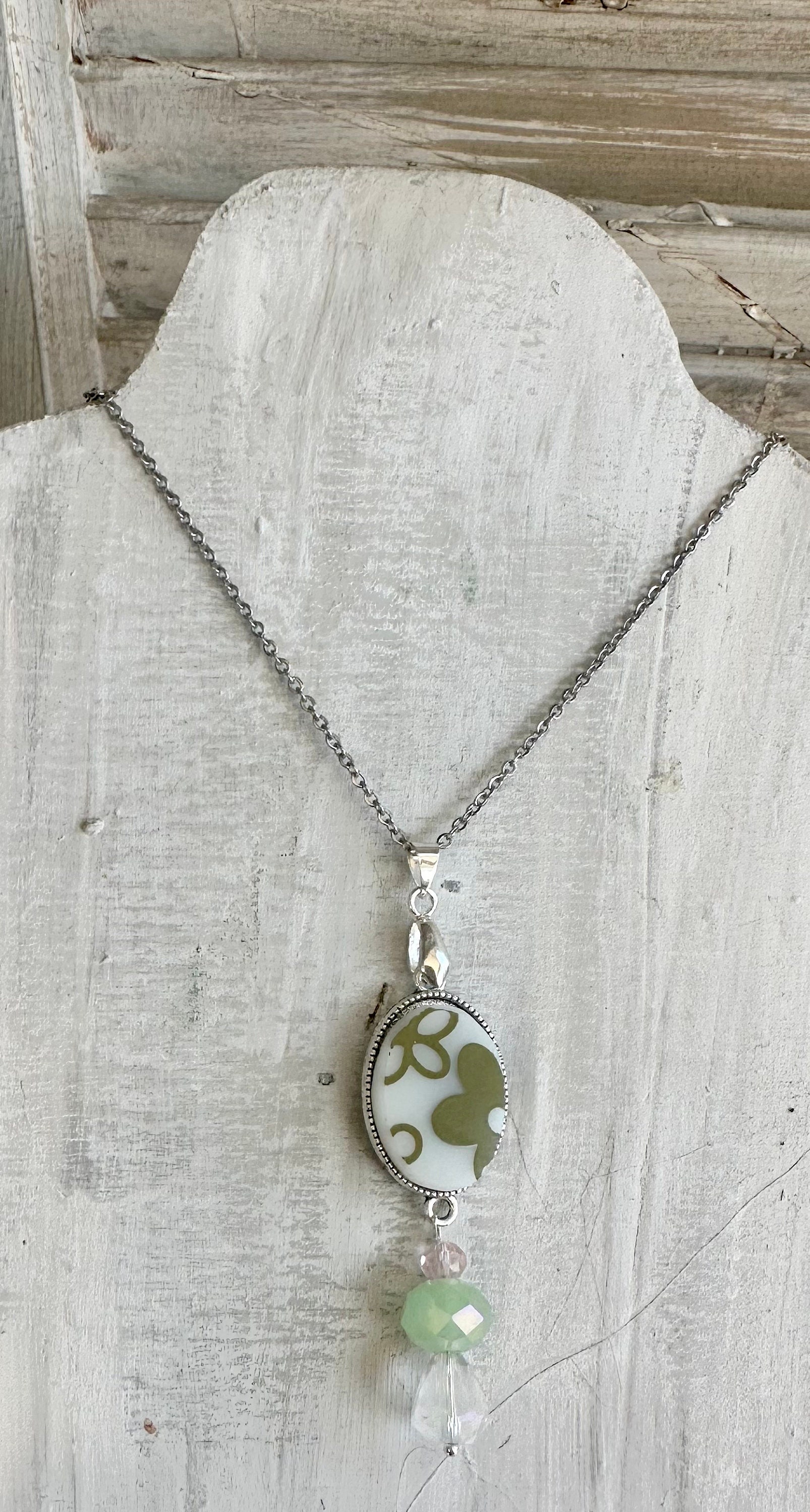 My broken China Jewelry, made out of a vintage 1970s Pyrex Casserole dish “Spring Blossom”, is sure to be a conversation starter. This one of a kind necklace is crafted with love and attention to detail. I was inspired to make the first one to honor my mother, who had the same pattern. The piece of Pyrex is cut and grinded smooth on edges, then set on a silver bezel and matching findings.