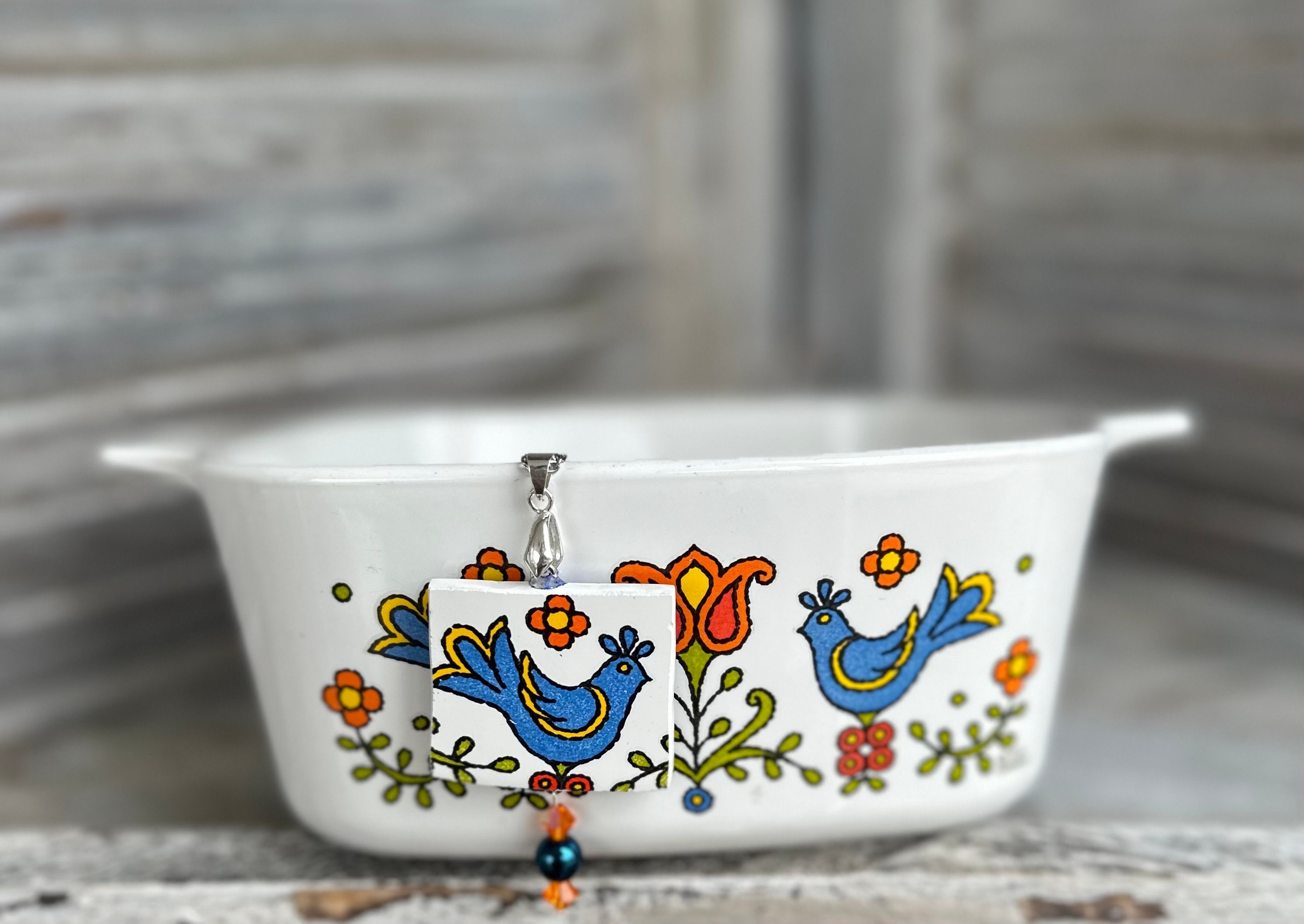 Show off your unique style with this stunning, one-of-a-kind pendant statement necklace! Crafted from a classic Corningware Country Festival casserole dish, it features silver-toned finders and a 20” stainless steel chain. This necklace is sure to be a beautiful addition to any outfit - and make for some great conversation starters!