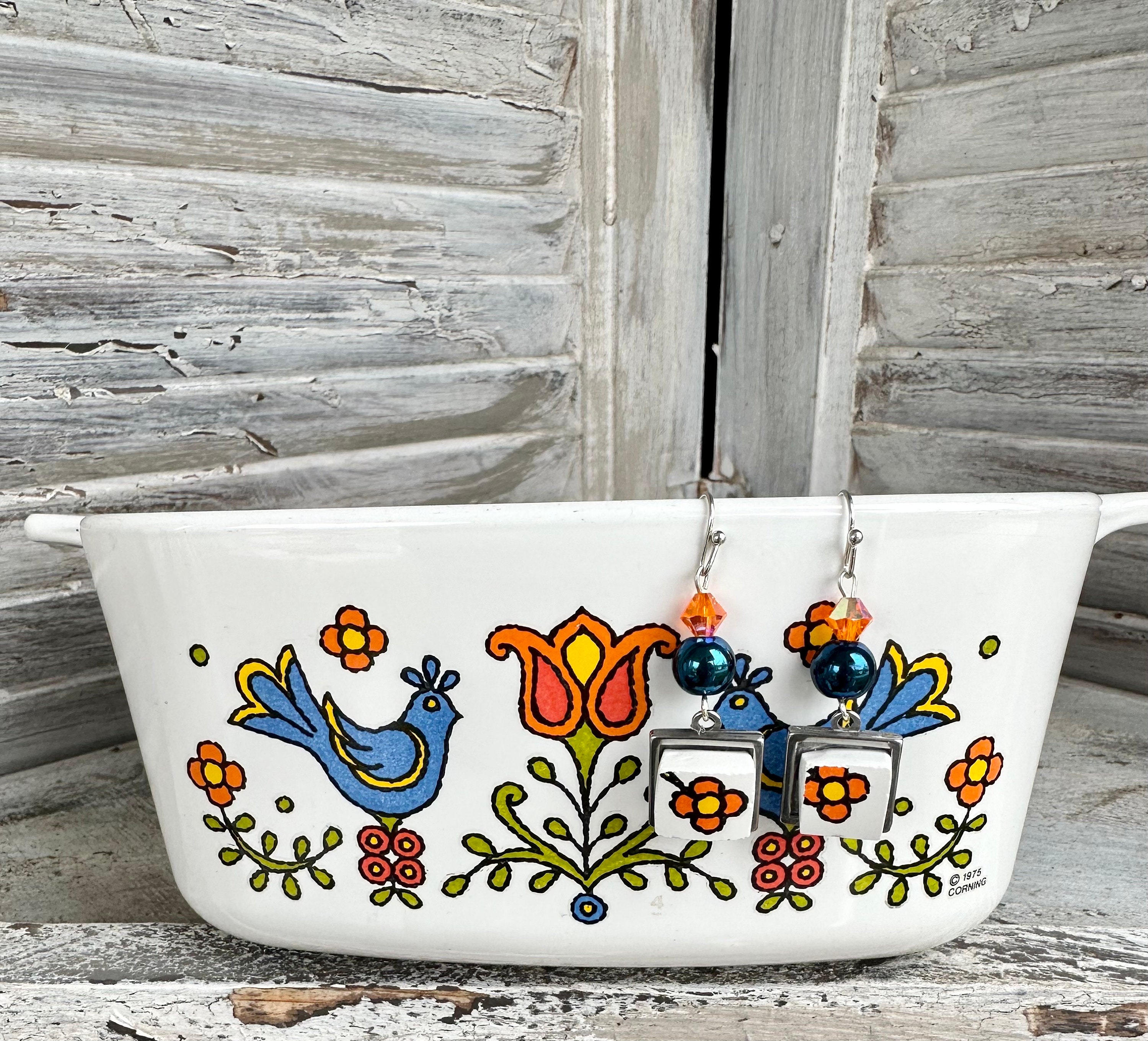 Show off your unique style with these gorgeous one-of-a-kind drop earrings. Crafted from a classic Corningware Country Festival casserole dish, they feature stainless steel silver bezel and fish hook findings. With a hint of nostalgia and a lot of charm, these drop earrings are sure to be a beautiful addition to any outfit - plus, they make for great conversation starters!