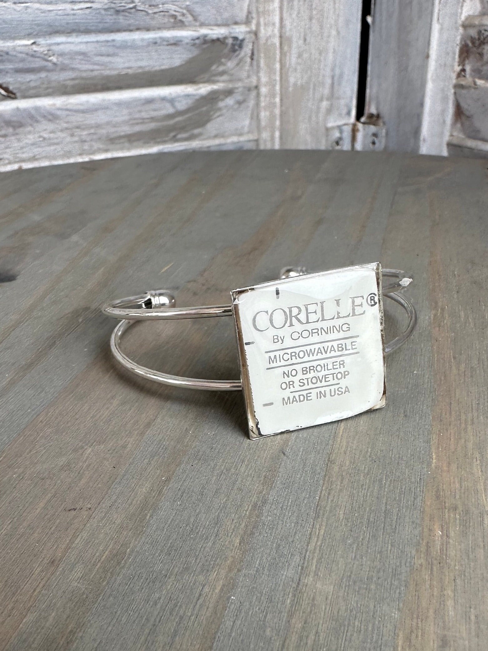 This silver square bezel cuff is handmade and repurposed using a vintage Correlle Sunblossoms plate logo. The piece of Correlle has been grinded and polished smooth. Top coated with resin for durability. This is a beautiful, one-of-a-kind piece sure to start conversations.