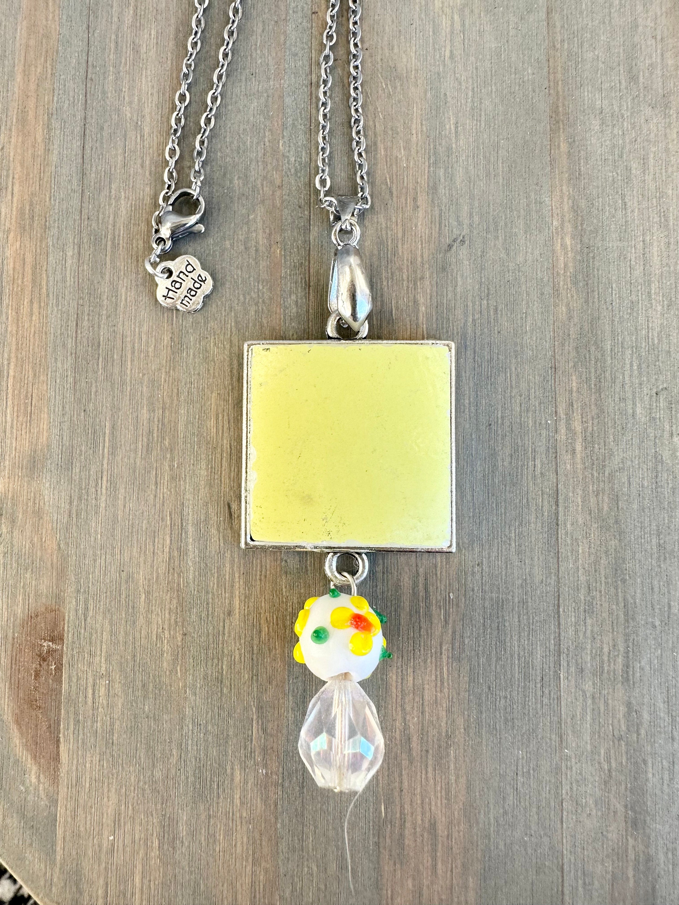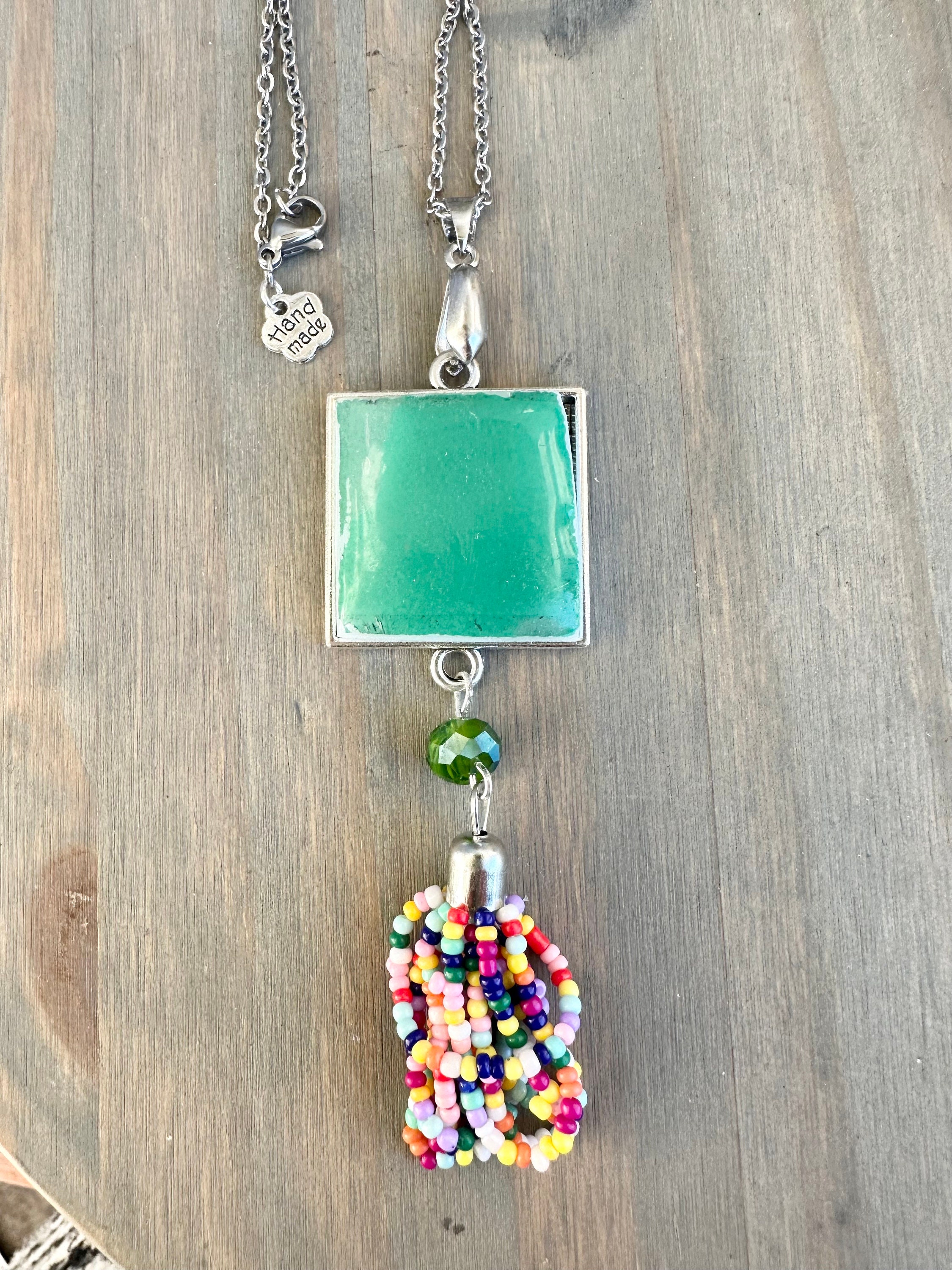 This gorgeous pendant is handmade and repurposed using a vintage 1970s Pyrex dish . The piece has been grinded smooth and set in silver square bezel that measures 25mm by 25mm. Pyrex piece covered in resin for durability. Necklace is 20-inches but can be customized according to your request at the time of ordering. Coordinating beads and colorful tassel make it a beautiful, one-of-a-kind piece sure to start conversations.