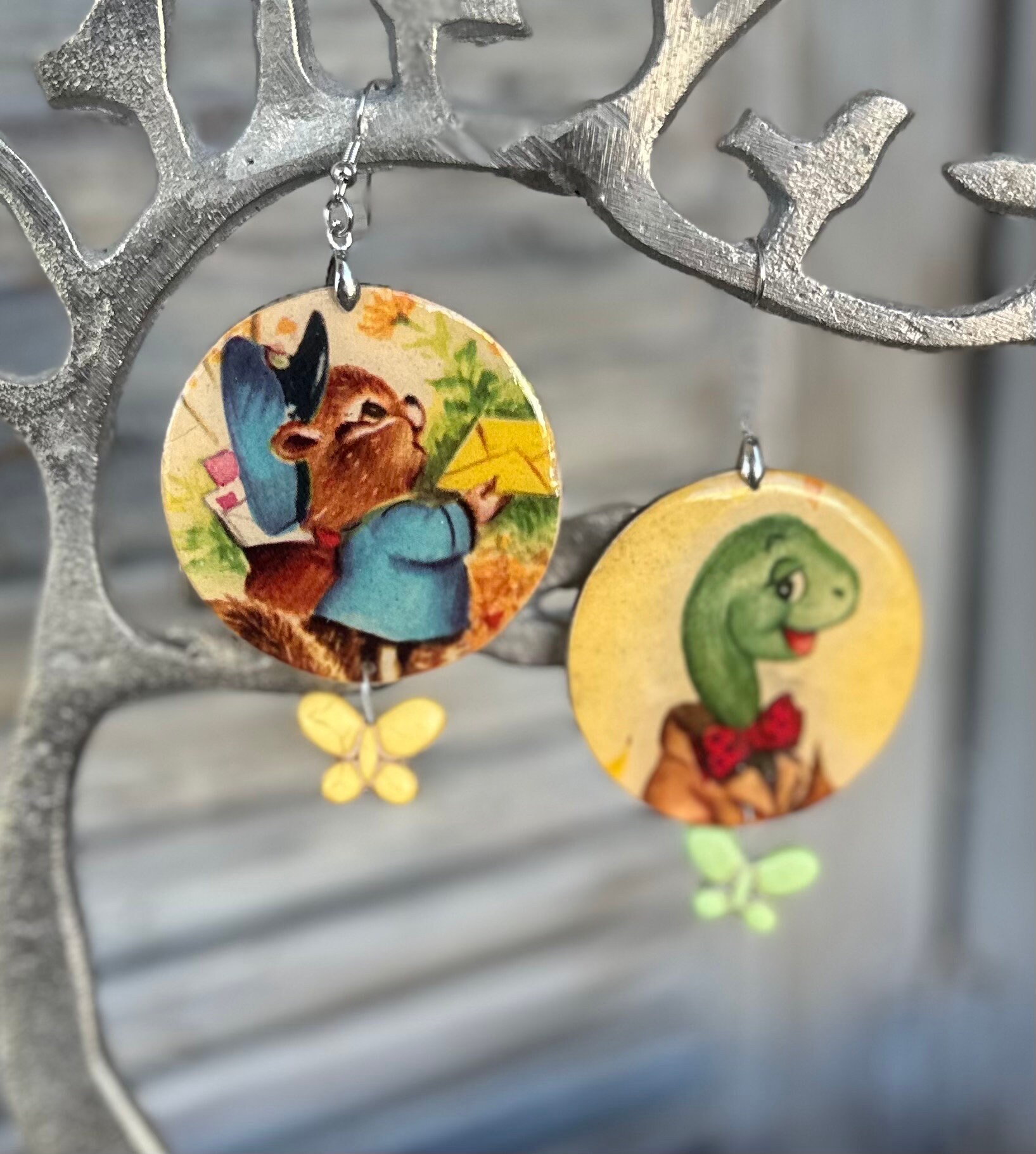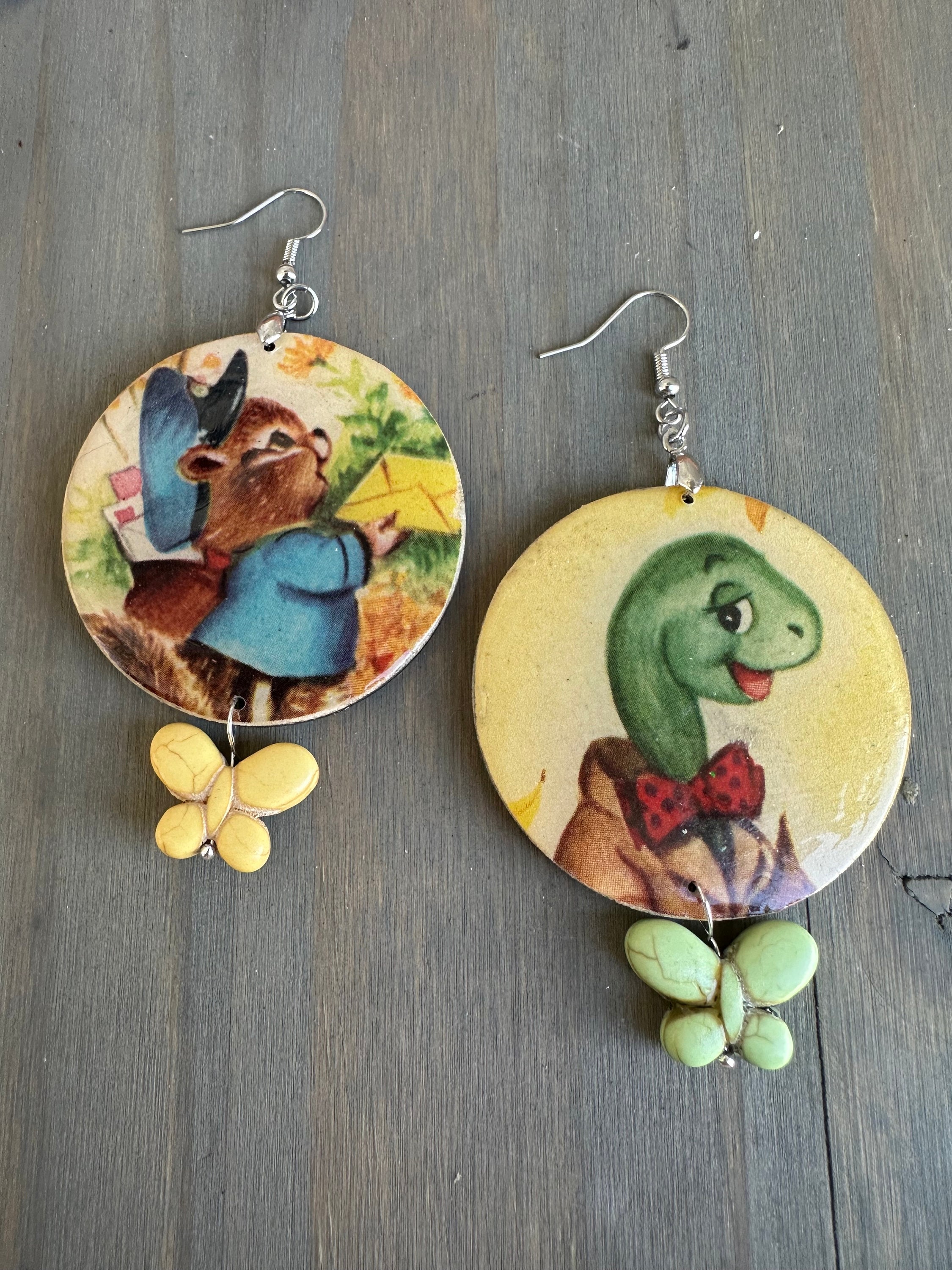 One of king Vintage Children’s book earrings. Image has been decoupaged and covered in a layer of resin for durability. Silver stainless steel fish hook findings. Light weight and perfect for Spring.