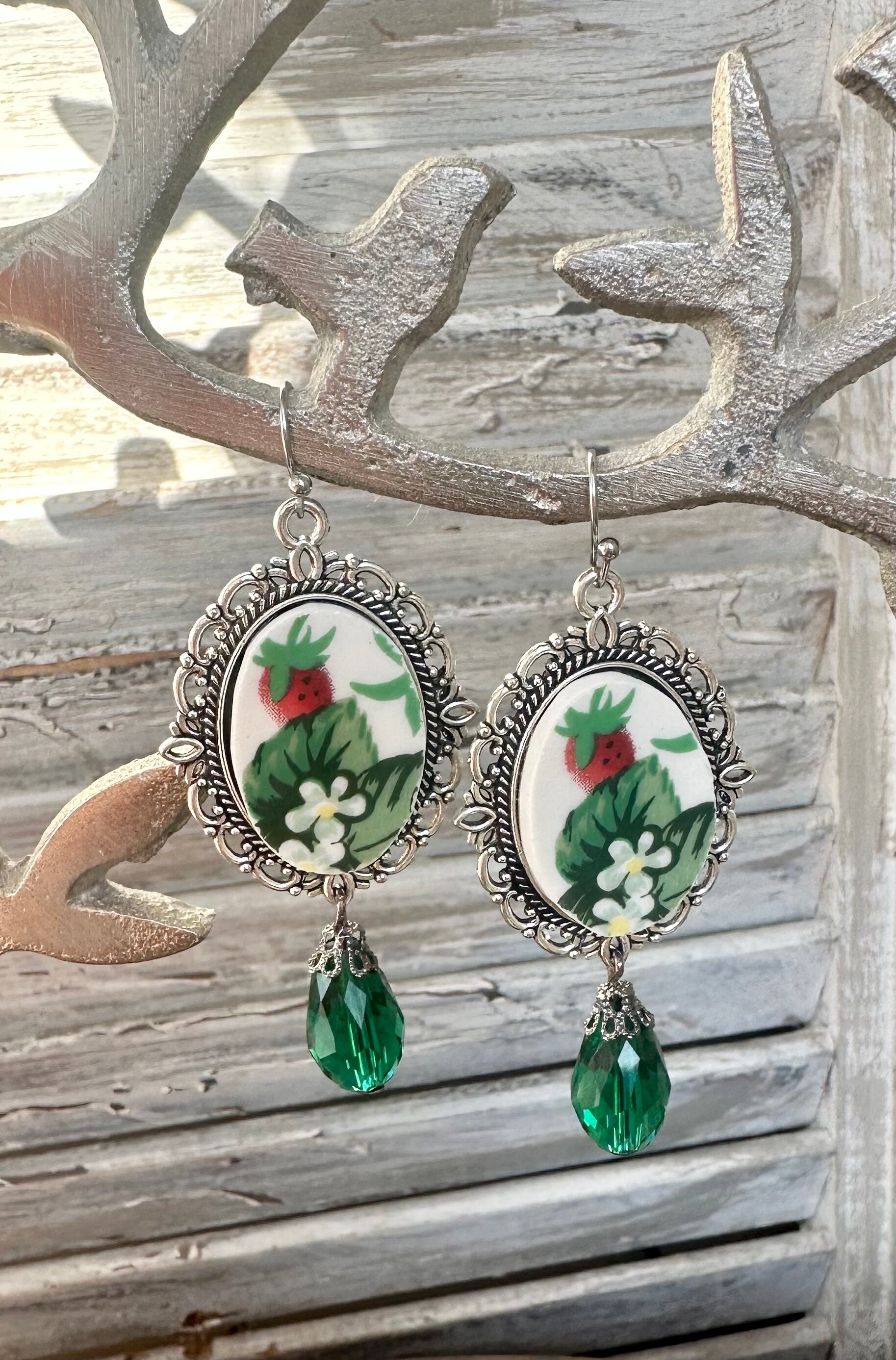 Get ready for summer with these stunning Vintage Tabletops Unlimited Very Strawberry broken china earrings! Each delicate piece of china has been carefully cut, smoothed, and placed in a beautiful antique silver bezel. Embellished with glass beads, these earrings are truly unique and will add a touch of elegance to your jewelry collection. Don't miss out on the chance to own such a gorgeous and one-of-a-kind pair of earrings.