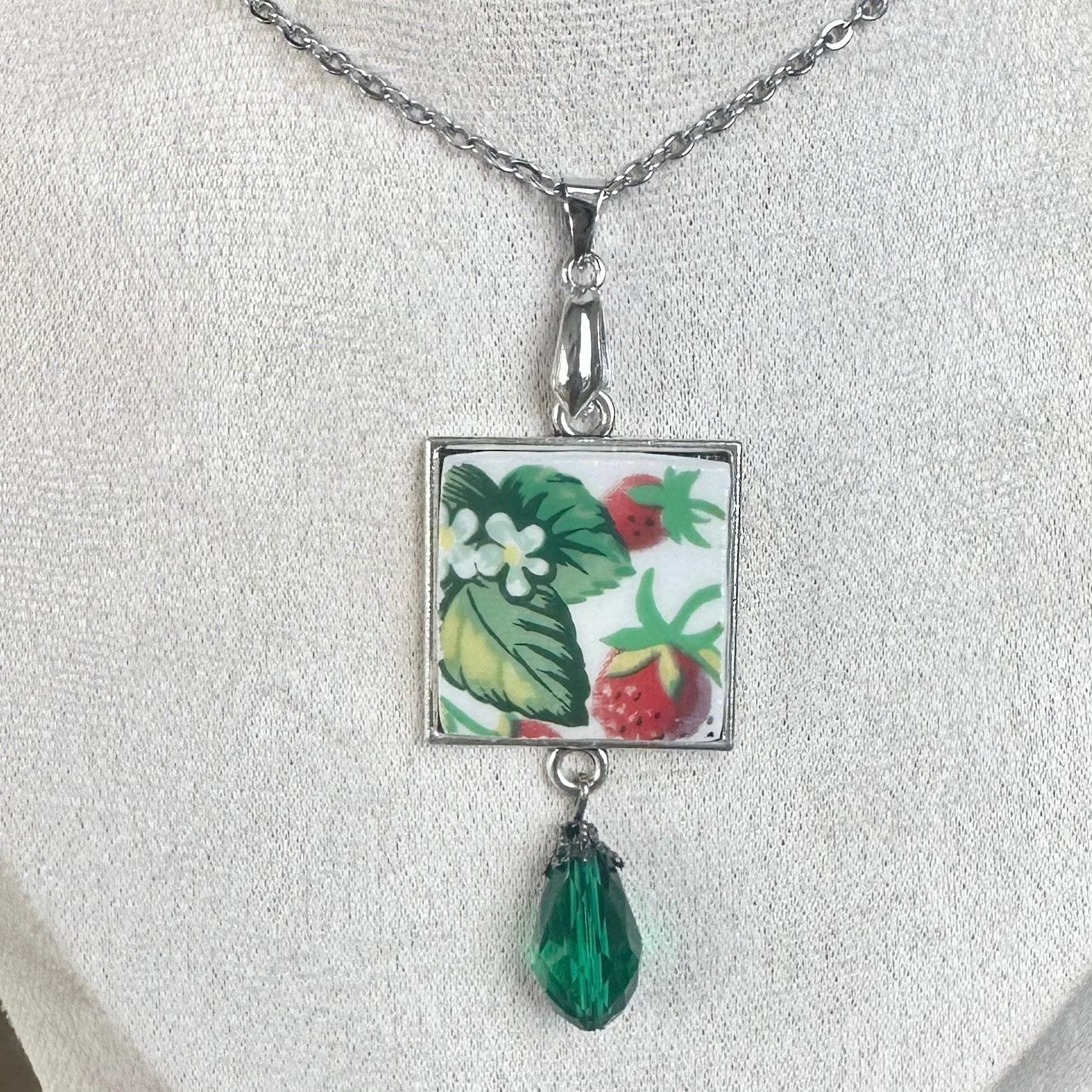 Get ready for summer with this stunning Vintage Tabletops Unlimited Very Strawberry broken china necklace! Each delicate piece of china has been carefully cut, smoothed, and placed in a beautiful silver bezel. Embellished with small glass bead, this necklace is truly unique and will add a touch of elegance to your jewelry collection. Don't miss out on the chance to own such a gorgeous and one-of-a-kind pair of earrings.