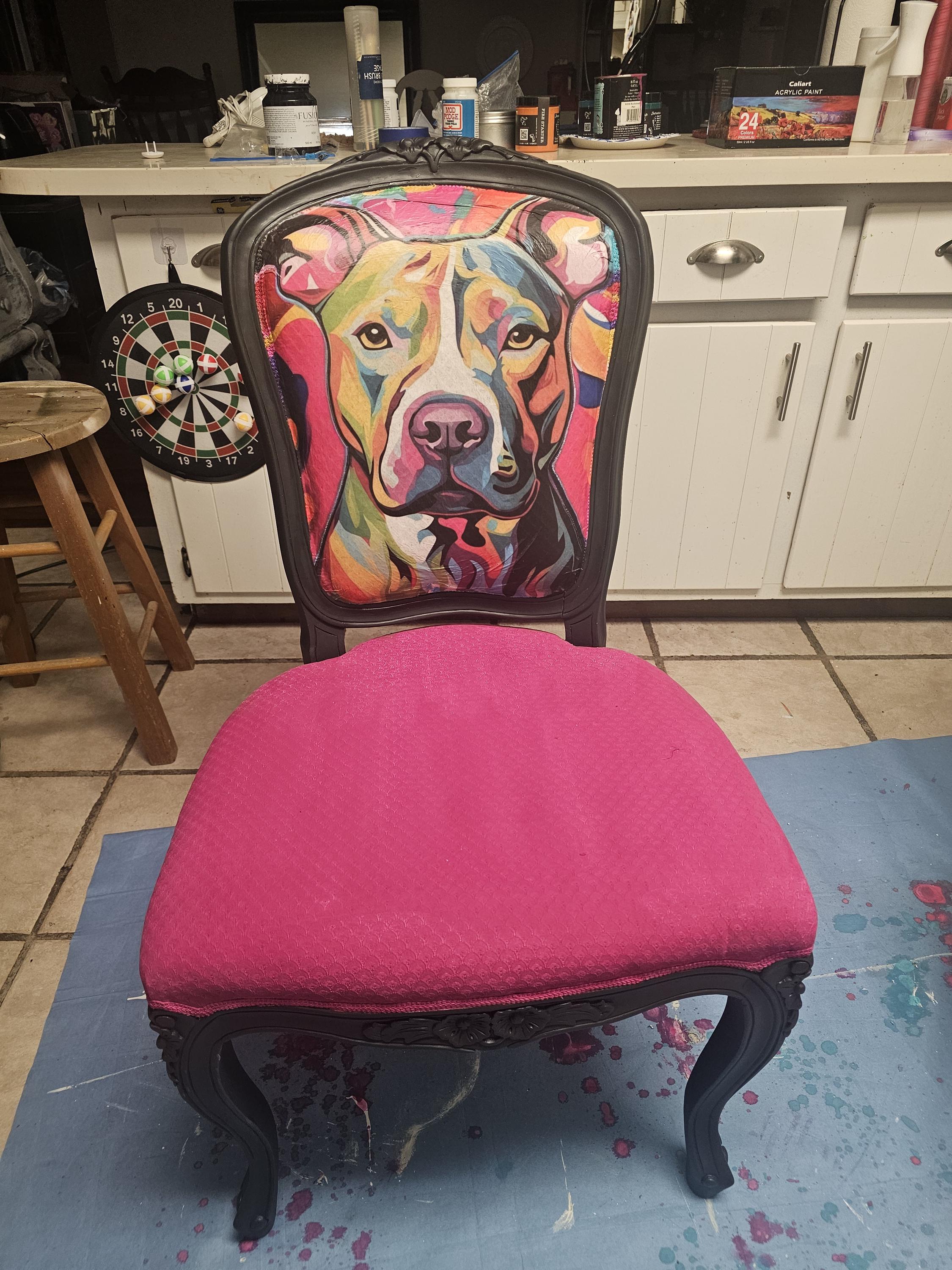 In this striking decoupage piece, a vibrant pitbull bursts to life in a riot of colors and dynamic graffiti-style patterns. The energetic composition captures the essence of urban artistry, with the canine subject exuding charisma and personality. This fusion of pop art and graffiti elements creates a visually stimulating and captivating portrayal of the pitbull, making it a true standout piece that embodies the spirit of creativity and individuality.