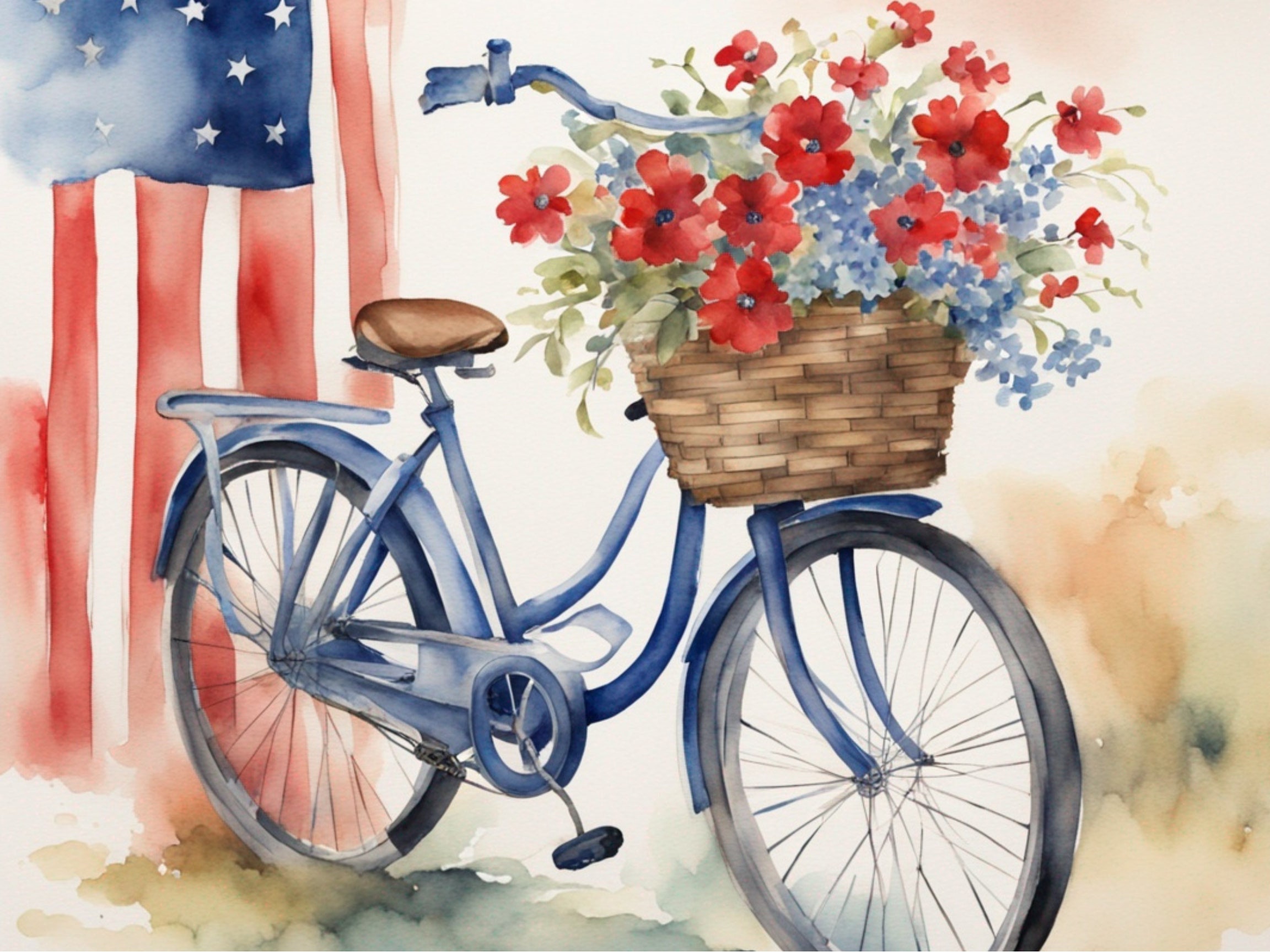 Immerse yourself in a nostalgic journey with our exquisite decoupage paper featuring a whimsical bicycle adorned with vibrant flowers, all set against a patriotic backdrop. This watercolor masterpiece beautifully combines classic charm with a touch of patriotism, ideal for enhancing your crafting projects with a unique and artistic flair.