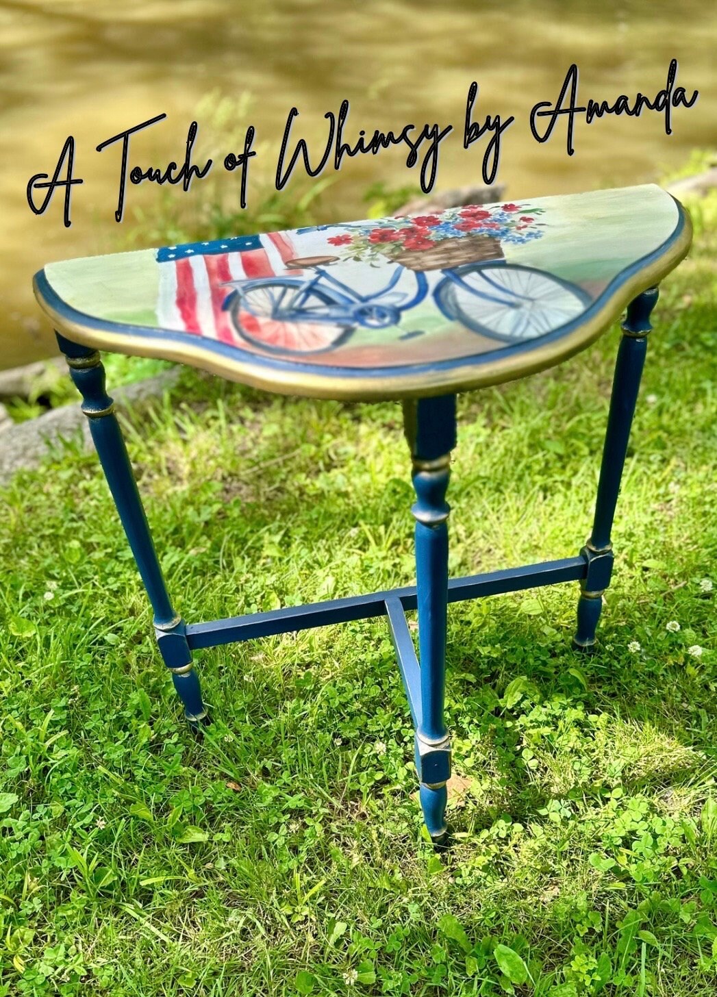 Last week, I was lucky enough to find 2 Vintage half moon tables at the thrift store. I couldn't resist using one for my new patriotic decoupage papers. The table I chose showcases a charming bicycle adorned with striking red and blue florals and an American flag. Base was painted in a deep navy blue and delicately gilded with shimmering gold accents.