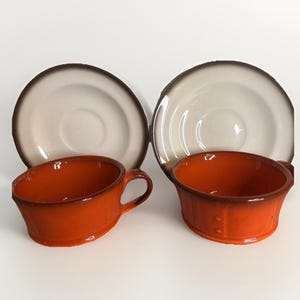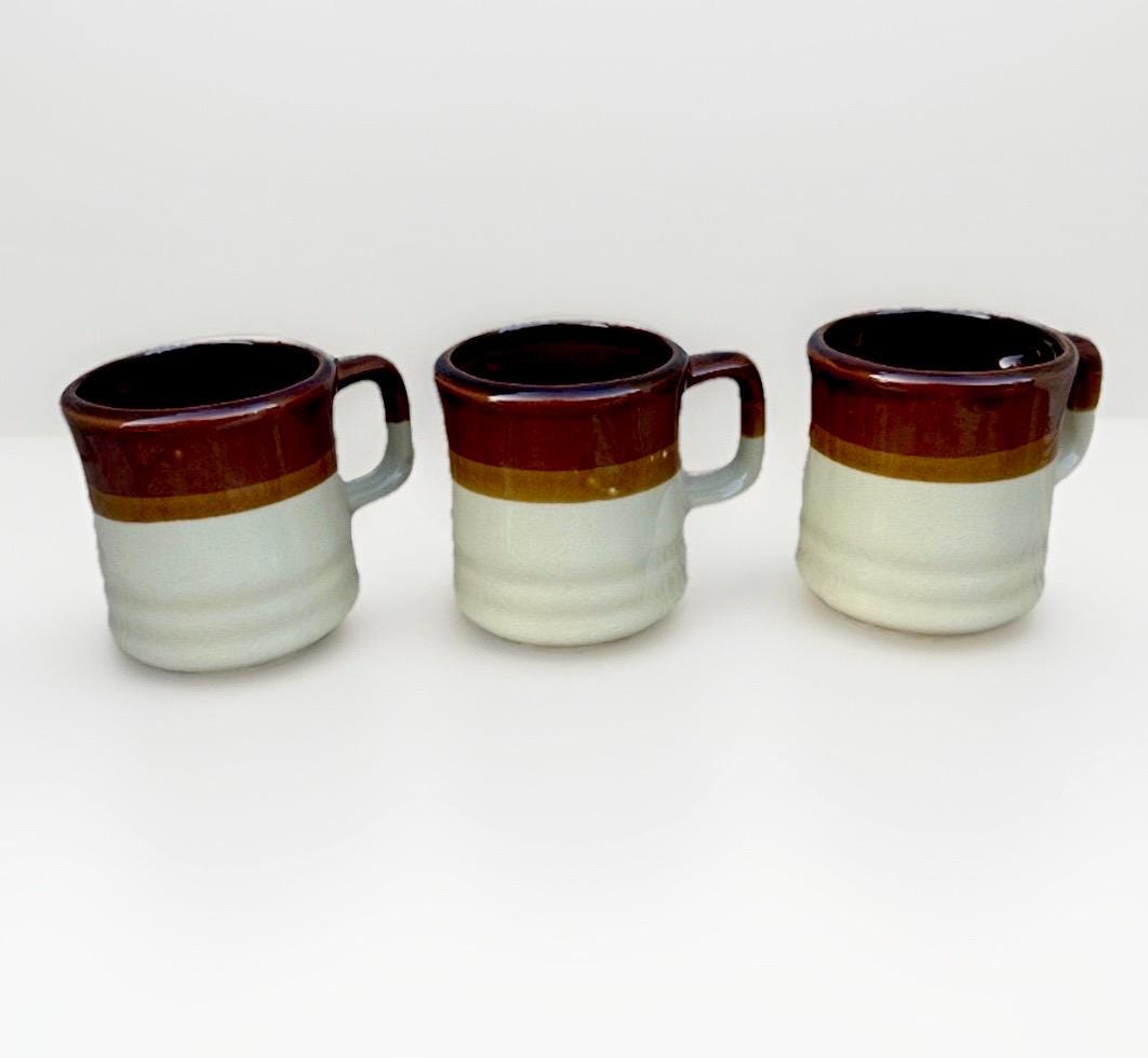 Enjoy your hot or cold beverage in style with these three vintage stoneware coffee mugs. Made in Taiwan, these mugs are perfect for a mid-century look. Each mug has a diameter of 3 inches and stands at 3 1/2 inches tall. The multicolor design adds a pop of color to your kitchen or dining room.