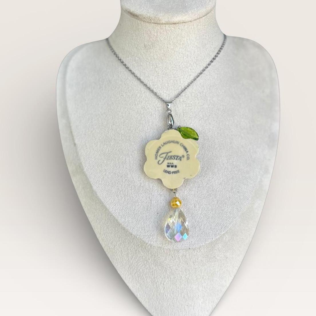 Wear a piece of pottery history with this authentic Yellow Fiestaware Pendant . Hand-carved from a vintage Homer Laughlin plate, this piece is a dream for collectors because it preserves the soul of the china: the maker's mark.