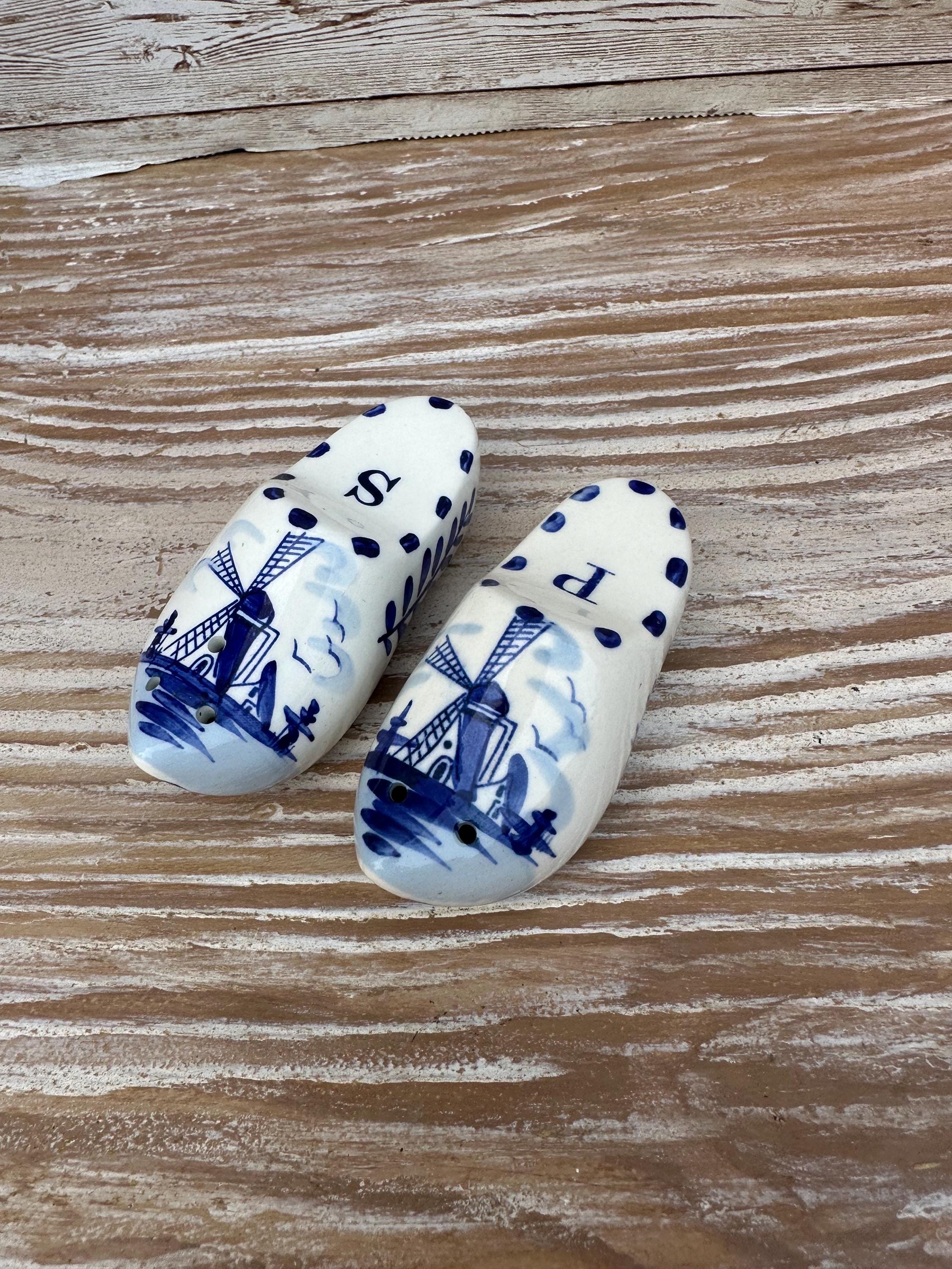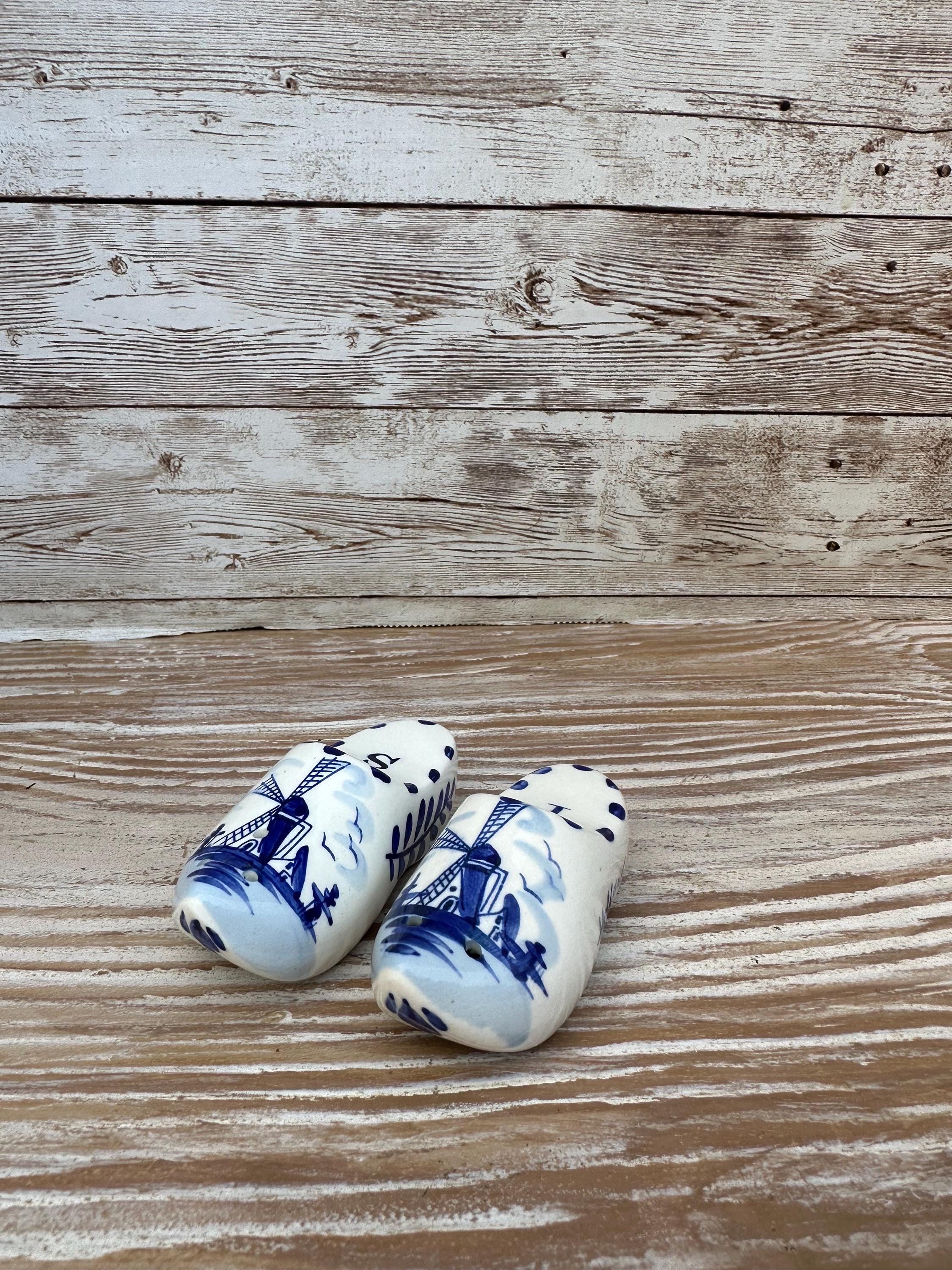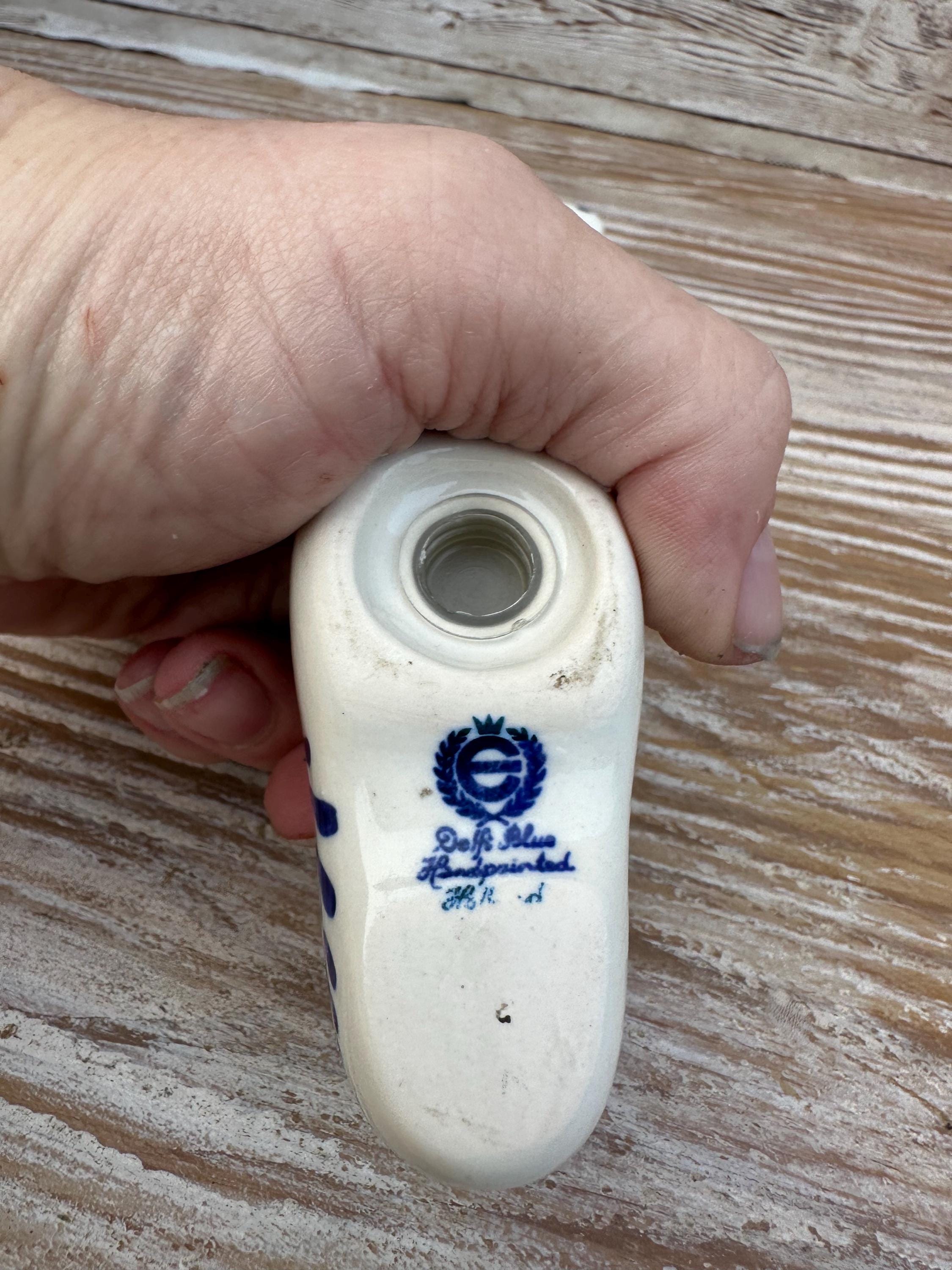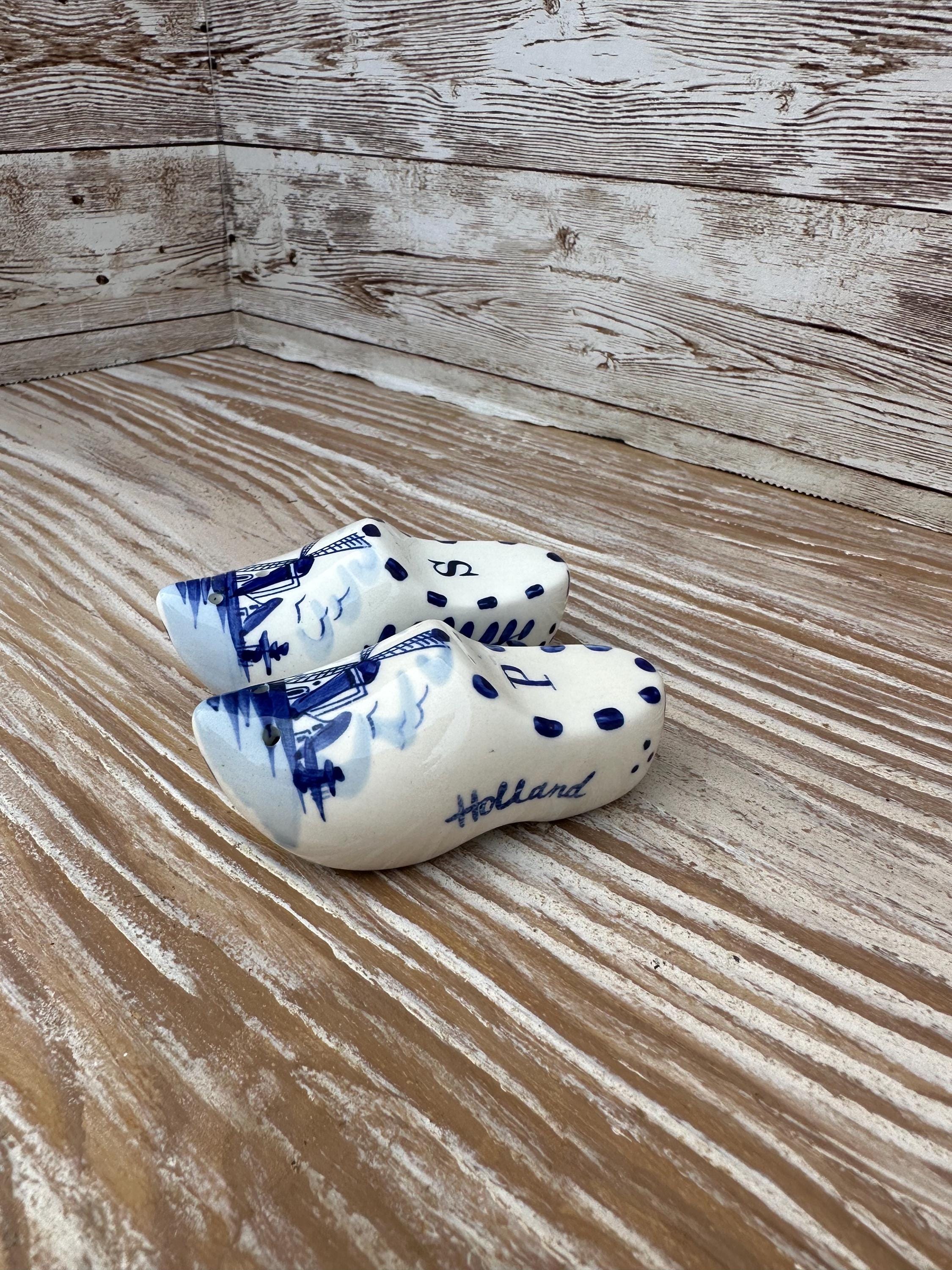 This antique pair of shoes is a beautiful addition to any collection. Crafted in the Netherlands by Holland Delft, these shoes feature a classic blue and white design with a windmill on the side. Measuring 3 inches in length and 1 inch in width, these shoes are made of high-quality ceramic and porcelain materials. They are an original piece and perfect for decorative purposes. Add a touch of Dutch charm to your home with this unique collectible.
