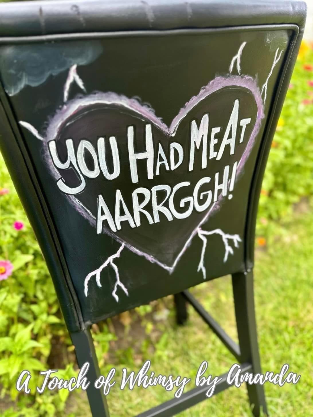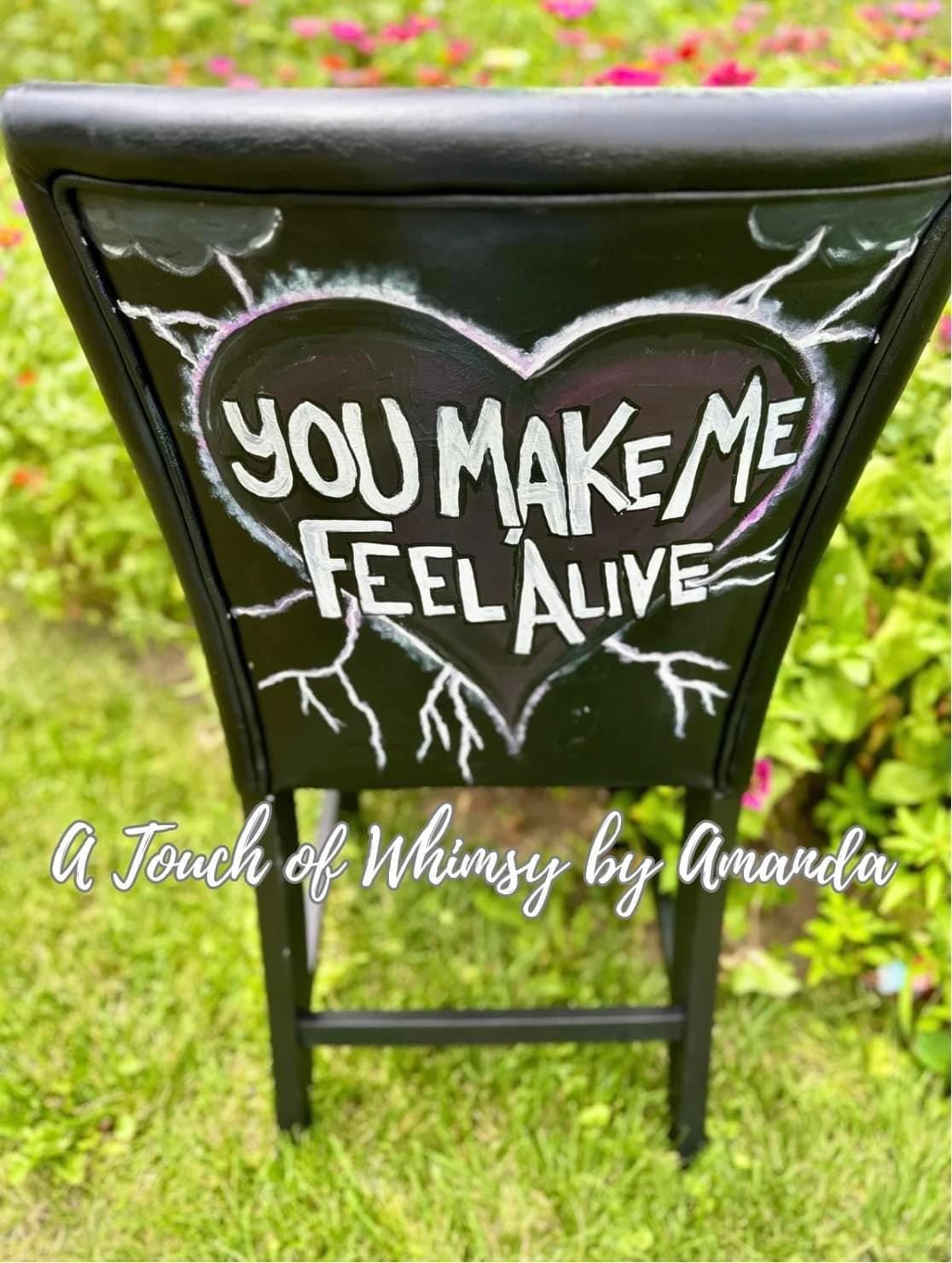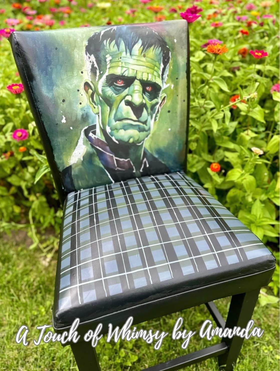 Pleather chairs have been decoupaged with original artwork I created. Then I paint the chairs to blend the artwork seamlessly onto the piece. Seat was painted with a gothic color tartan plaid. Back quotes and lighting glow in the dark. Seal 3x with a triple thick poly acrylic.