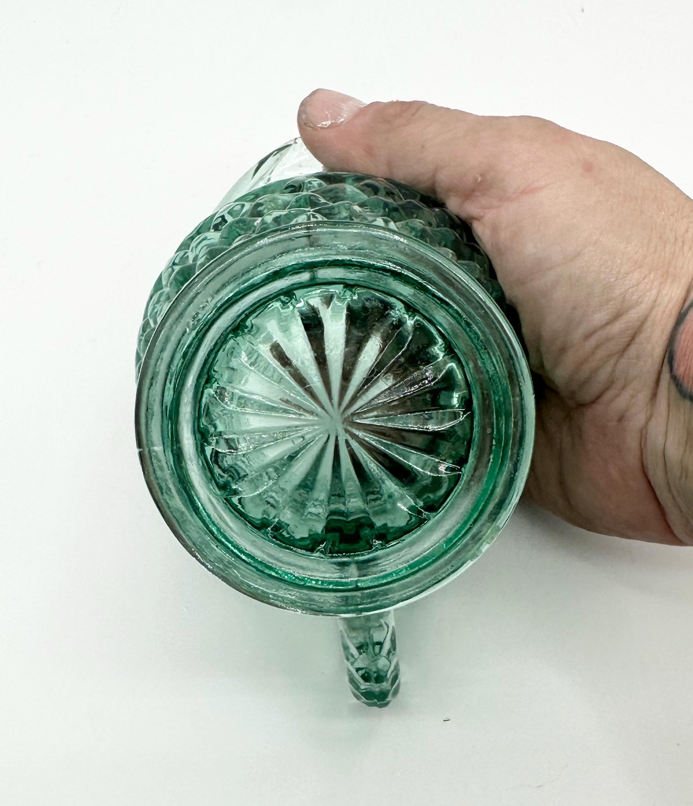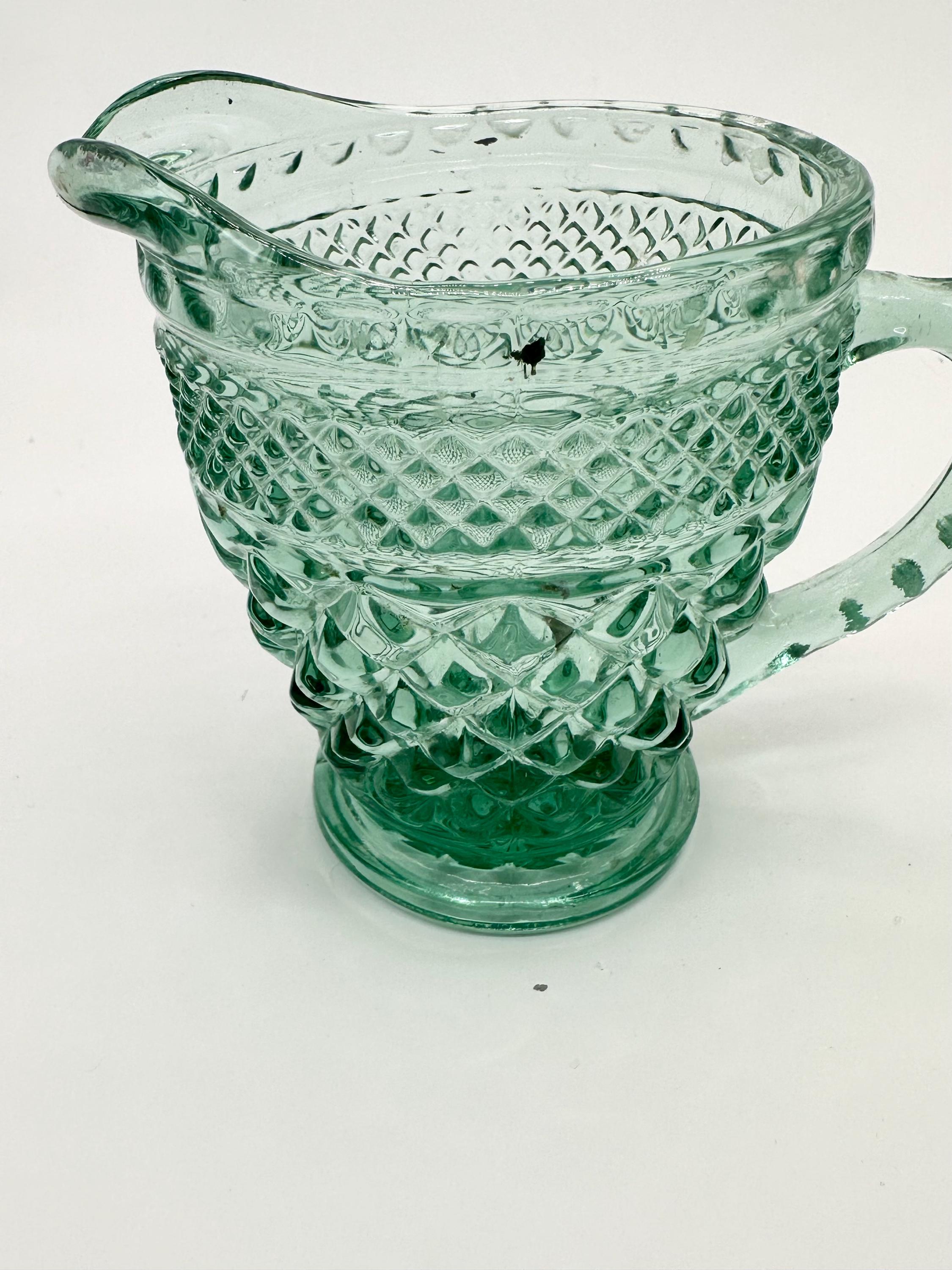 Add a touch of Mid-Century Modern charm to your table with this vintage Anchor Hocking "Wexford Green" glass creamer. The criss cross pattern and diamond design on the creamer's surface make it a beautiful addition to any collection. Crafted from pressed glass, this creamer is durable and has handles for easy pouring.