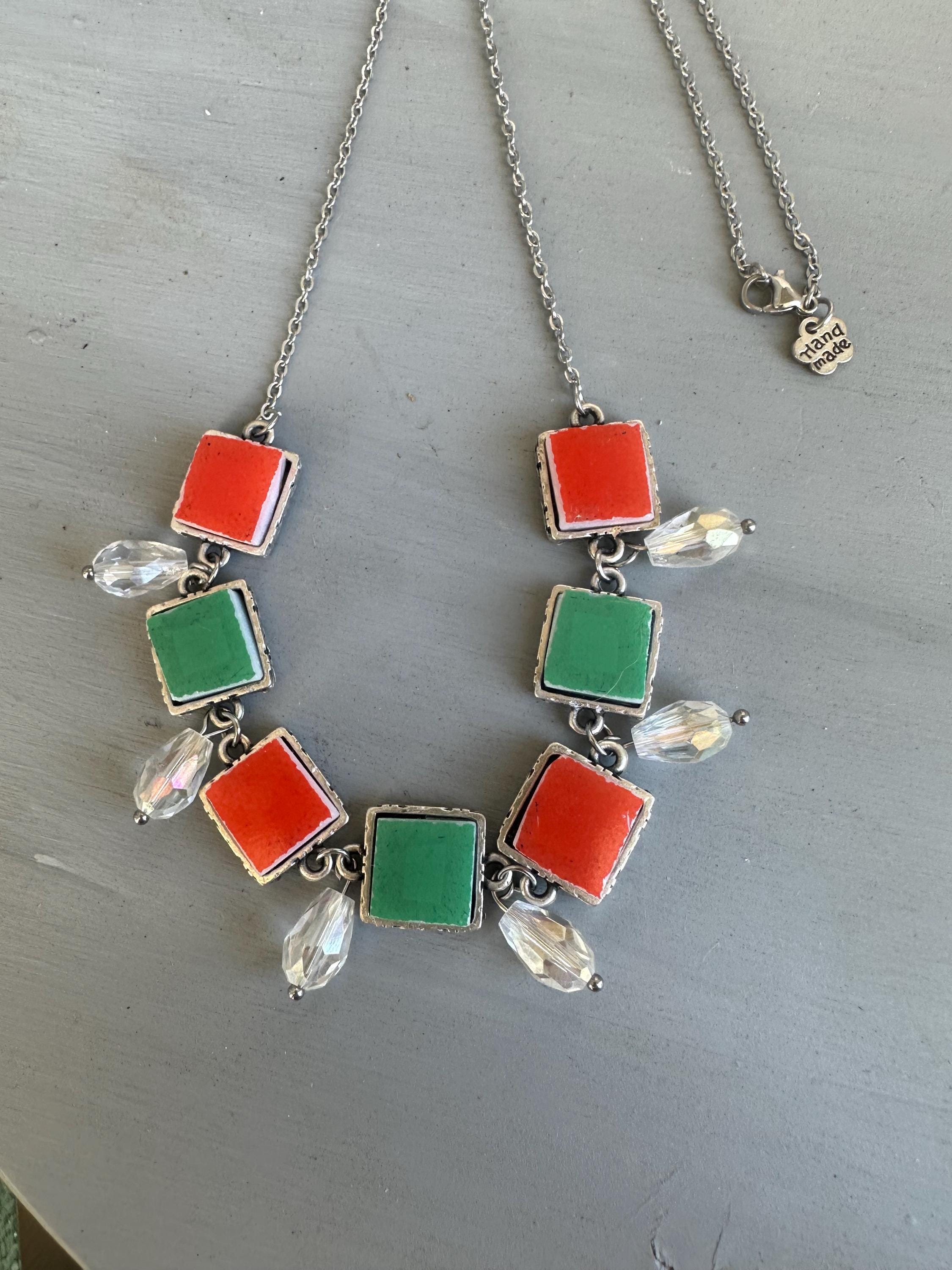 Exquisite and rare, this Vintage Pyrex bezel necklace is a true work of art. Each tile has been expertly cut, ground, and polished, resulting in a stunning combination of primary green, and red . The 22" stainless steel chain can be sized at time of order. Adorned with elegant drop iridescent crystals. This necklace is sure to turn heads and spark this holiday season and start many conversations.