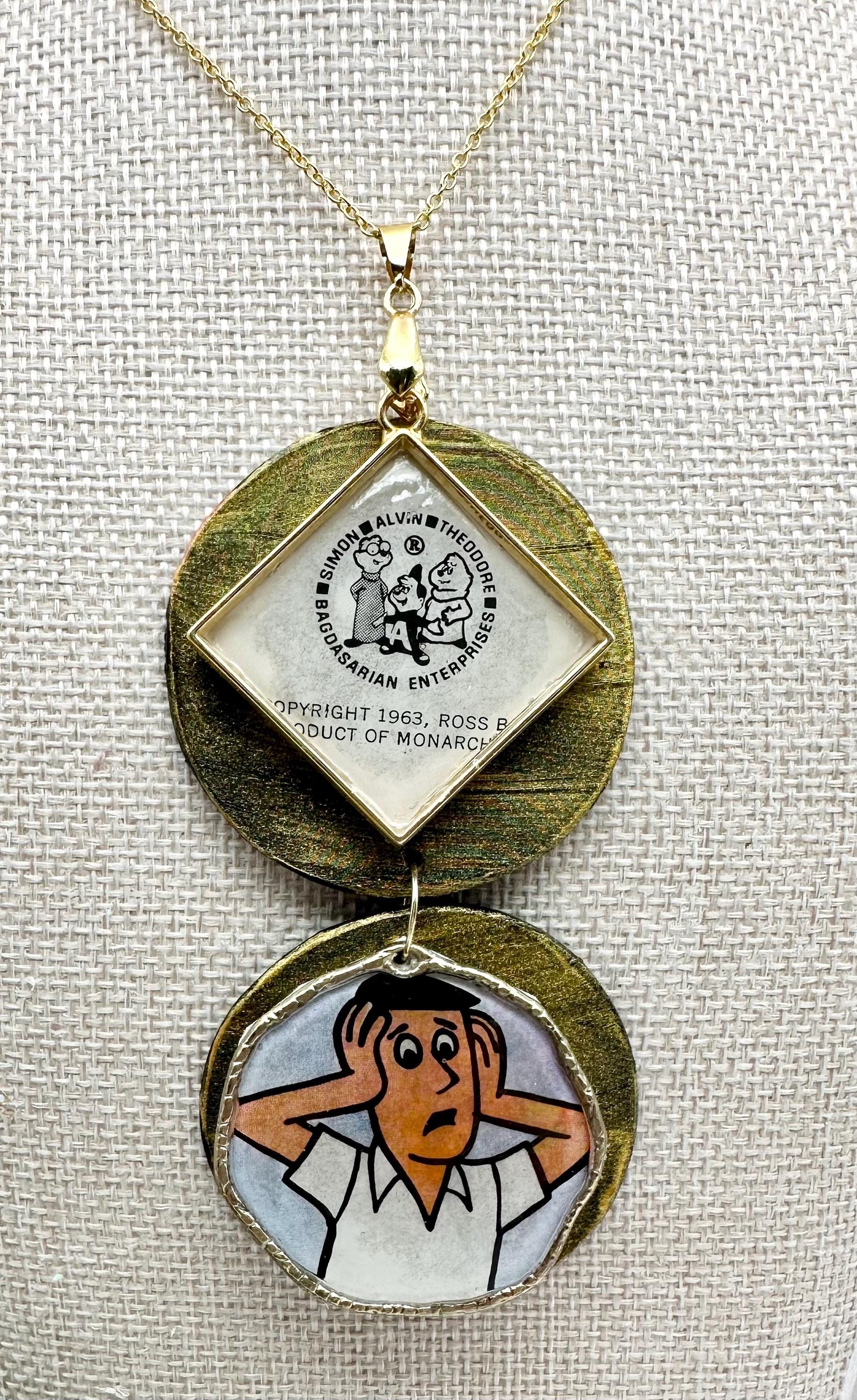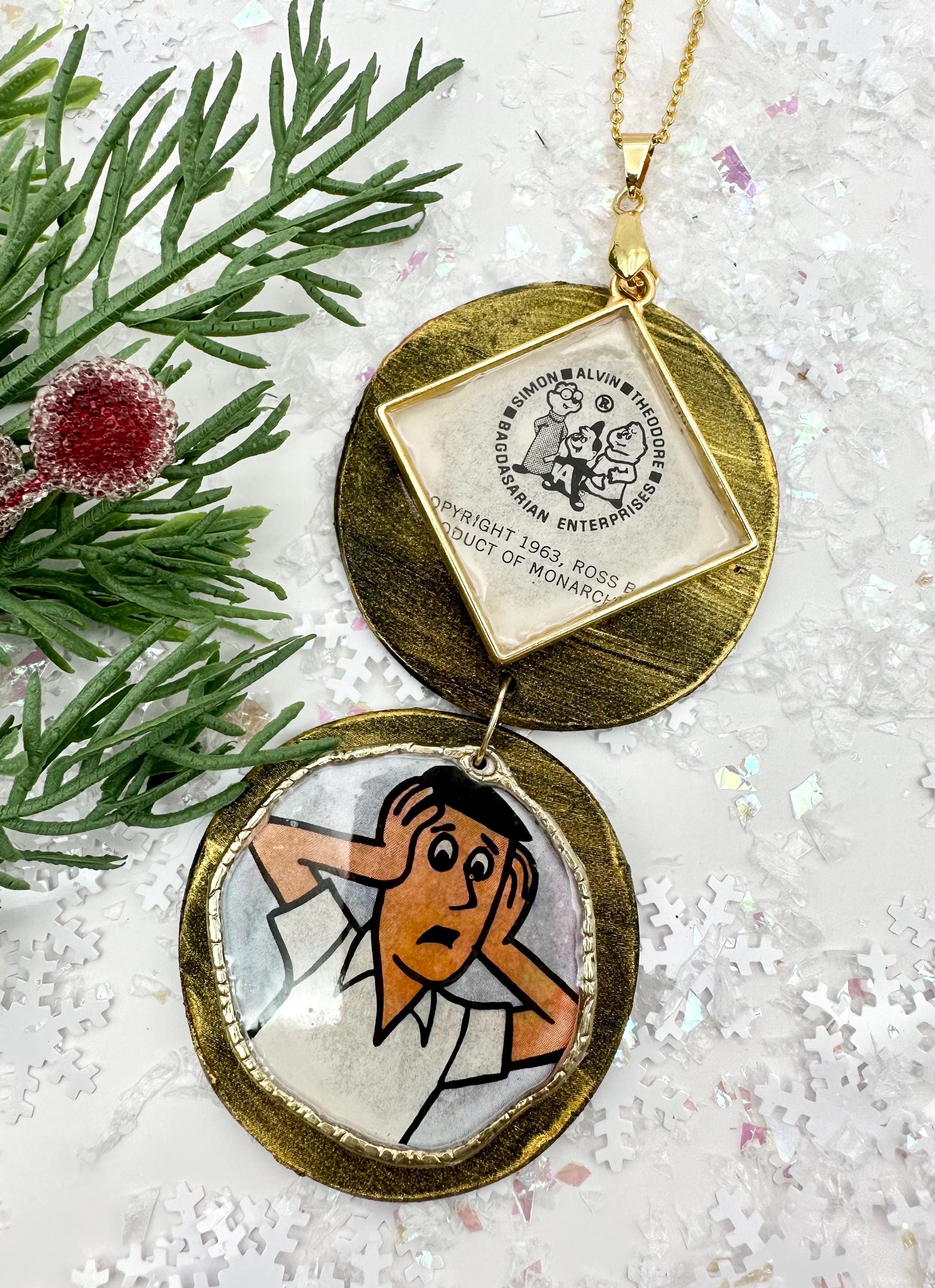 Featuring the beloved character Dave and the label of the record featuring date and the 3 chipmunks, the necklace is not only a stylish accessory but also a nostalgic piece that will surely spark fond memories. images is set in golden bezel and finished with a durable resin coating then I paired with a piece of the actual record that I cut, filed sanded, and then coated it with a beautiful gold paint.