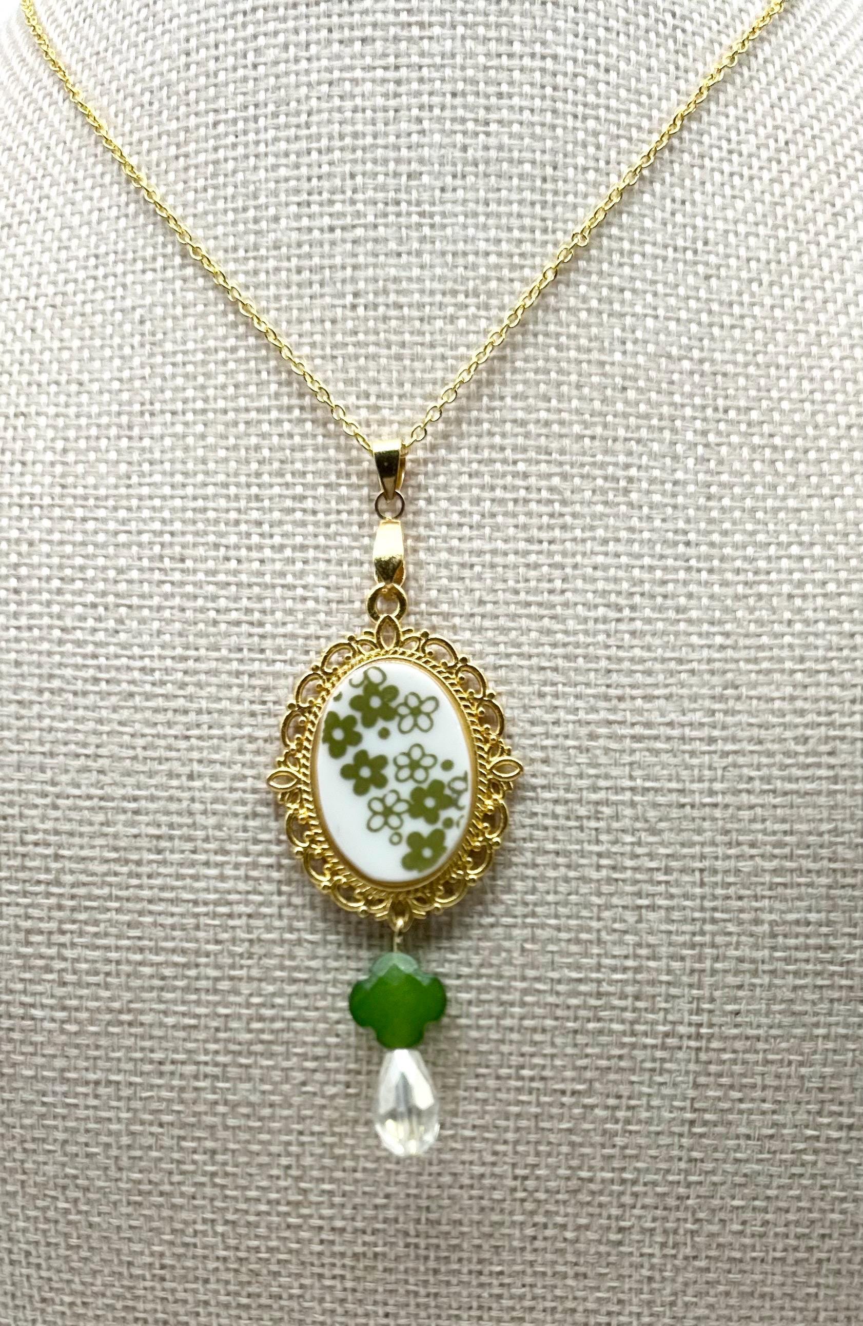 Make a statement with this unique, one of a kind Broken China Jewelry Necklace! Crafted from a Vintage 1970s Correlle Plate featuring the “Spring Blossom” pattern, this eye-catching piece will be sure to start a conversation. The bezel is gold alloy. Chain and findings are stainless steel. Don’t forget to also check out the matching plate pattern earrings in another listing!