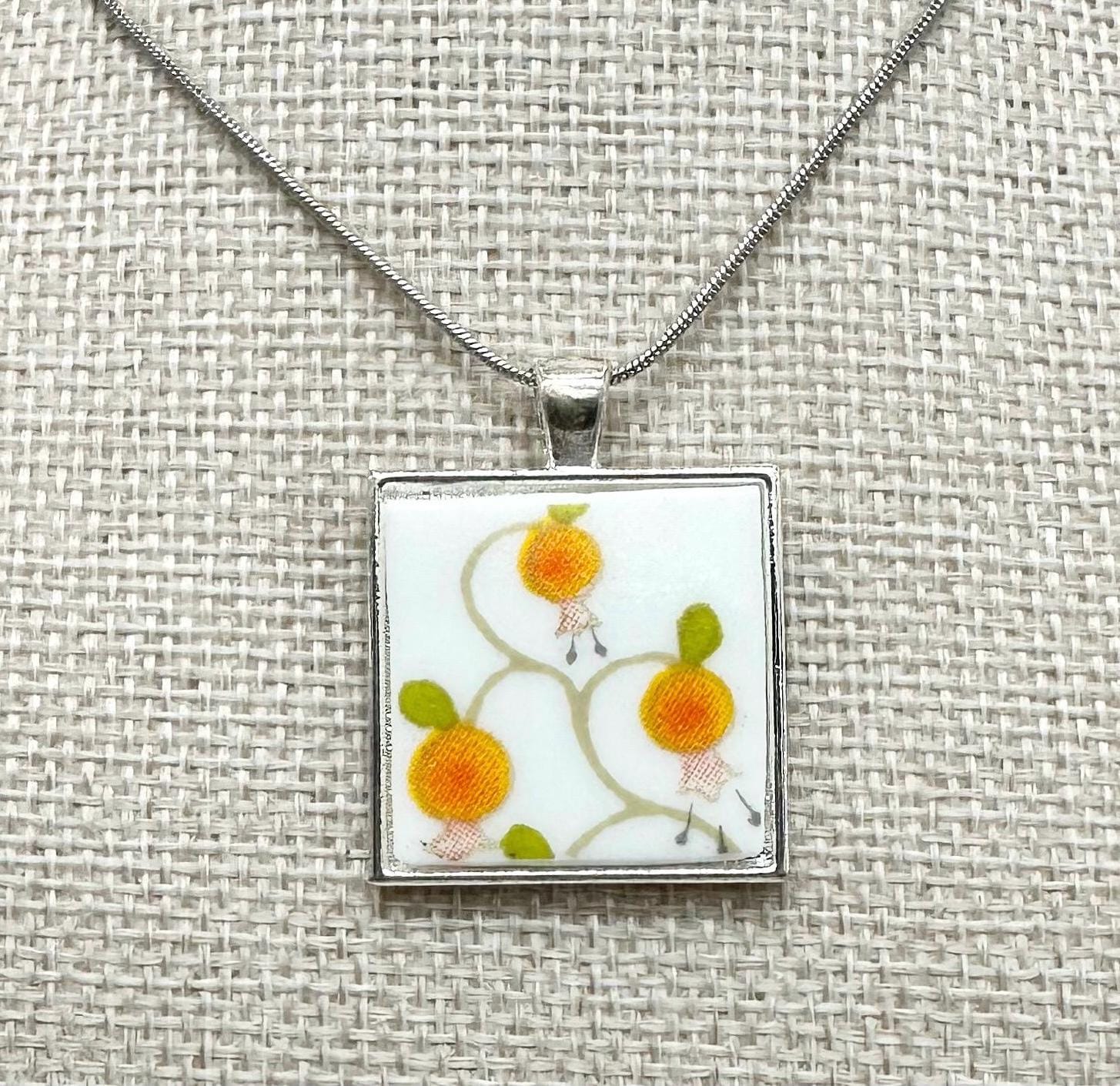 This exquisite pendant is meticulously handcrafted from a vintage 1970s Correlle "Wildflower" plate, adding a touch of nostalgia to its unique design. The plate has been finely ground to a smooth finish and elegantly set in a 25mm by 25mm coated sterling silver bezel. The necklace features a durable coated sterling silver snake chain, ensuring both style and durability. This one-of-a-kind piece is guaranteed to spark engaging conversations.