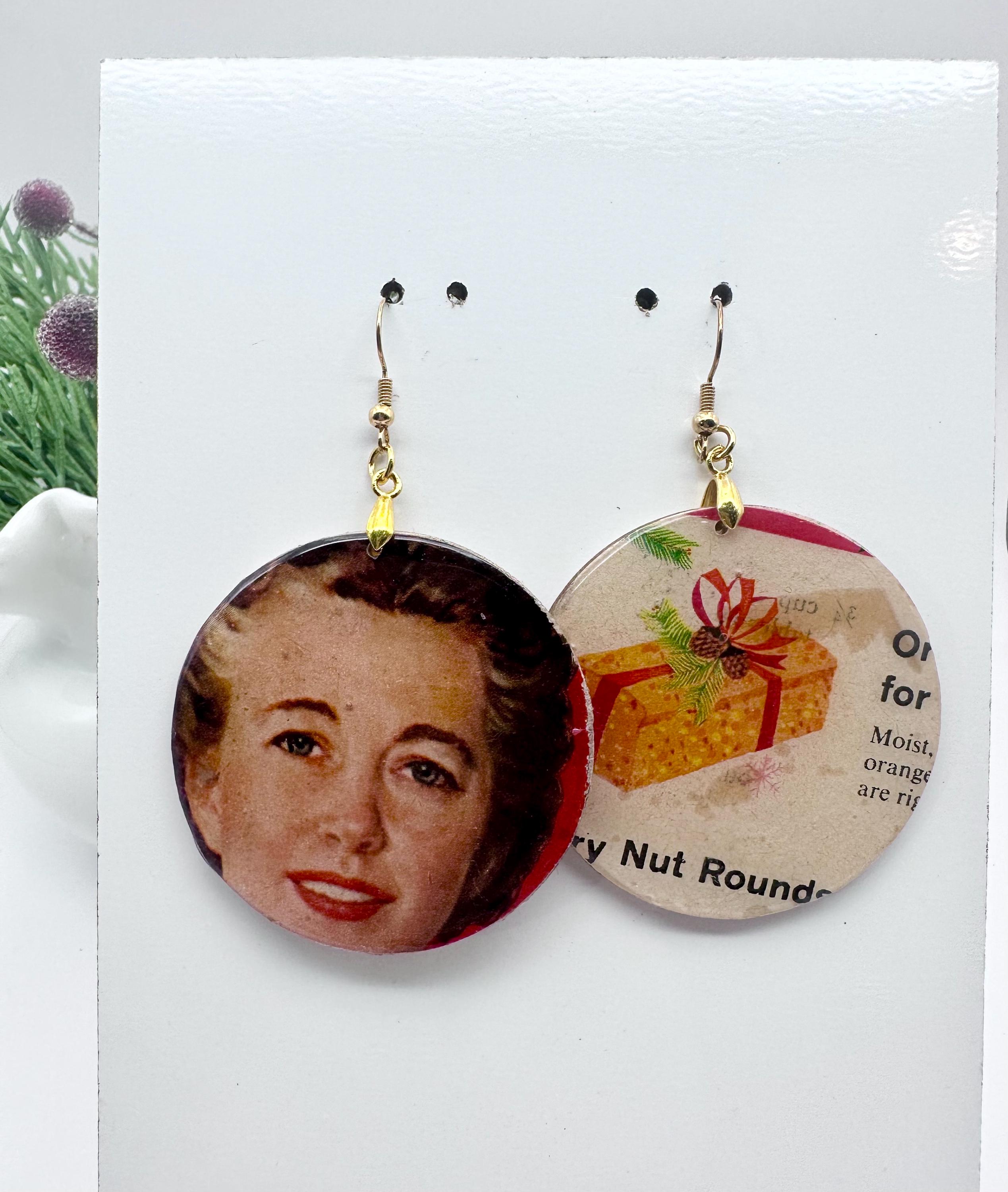 1958 Family Circle Christmas Earrings, Betty Crocker and Fruitecake