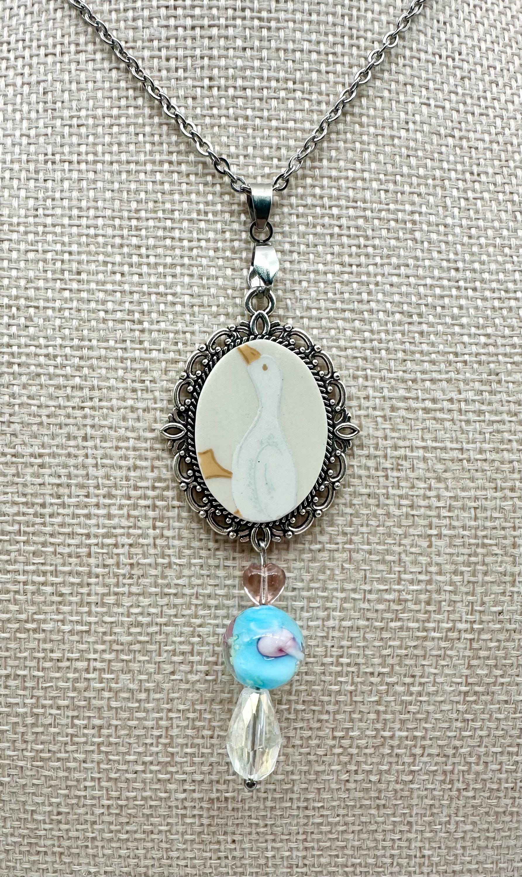 This necklace showcases larger goose image each set in a 15mm by 25mm silver alloy bezel. Each piece is unique, making it a truly special accessory. Accented by coordinating glass beads.