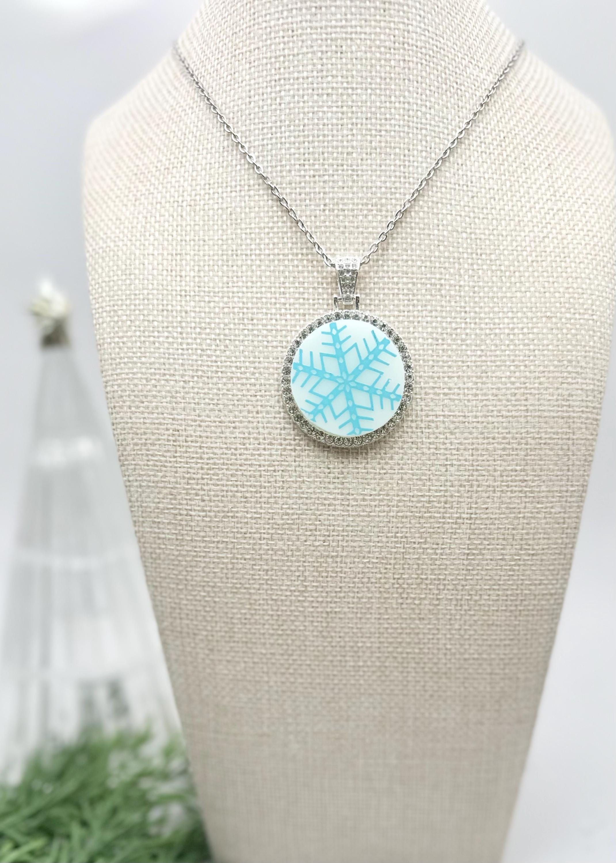 One of a kind 1956 Pyrex Snowflake Turquoise on on Rhinestone Round Pendant Necklace