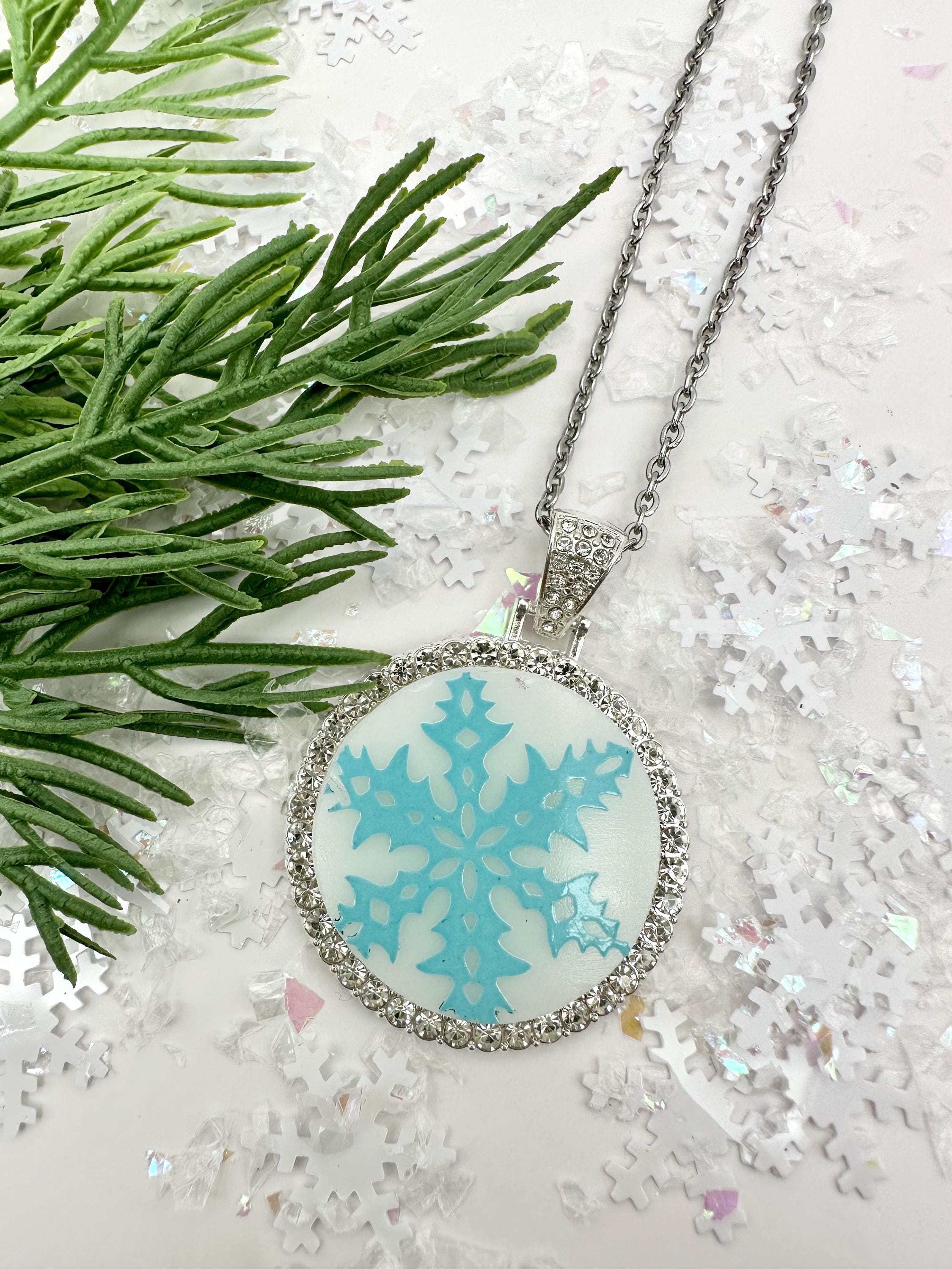 Introducing a truly unique statement piece that beautifully blends vintage charm with modern elegance! This handcrafted necklace is lovingly repurposed from a classic Pyrex Snowflake casserole dish in stunning turquoise on white. Each edge has been meticulously cut, filed, and polished to ensure a smooth, flawless finish.