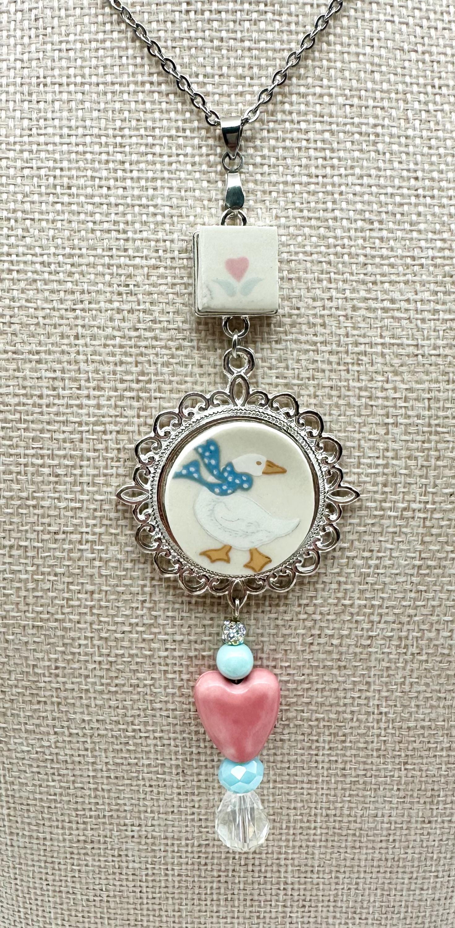 Embrace your whimsical side with this charming double pendant necklace, featuring the delightful playful goose image and adorable little pink hearts from a vintage 1990s "Aunt Rhody Blue Goose" plate. This unique piece captures the essence of nostalgia while adding a playful touch to your jewelry collection.