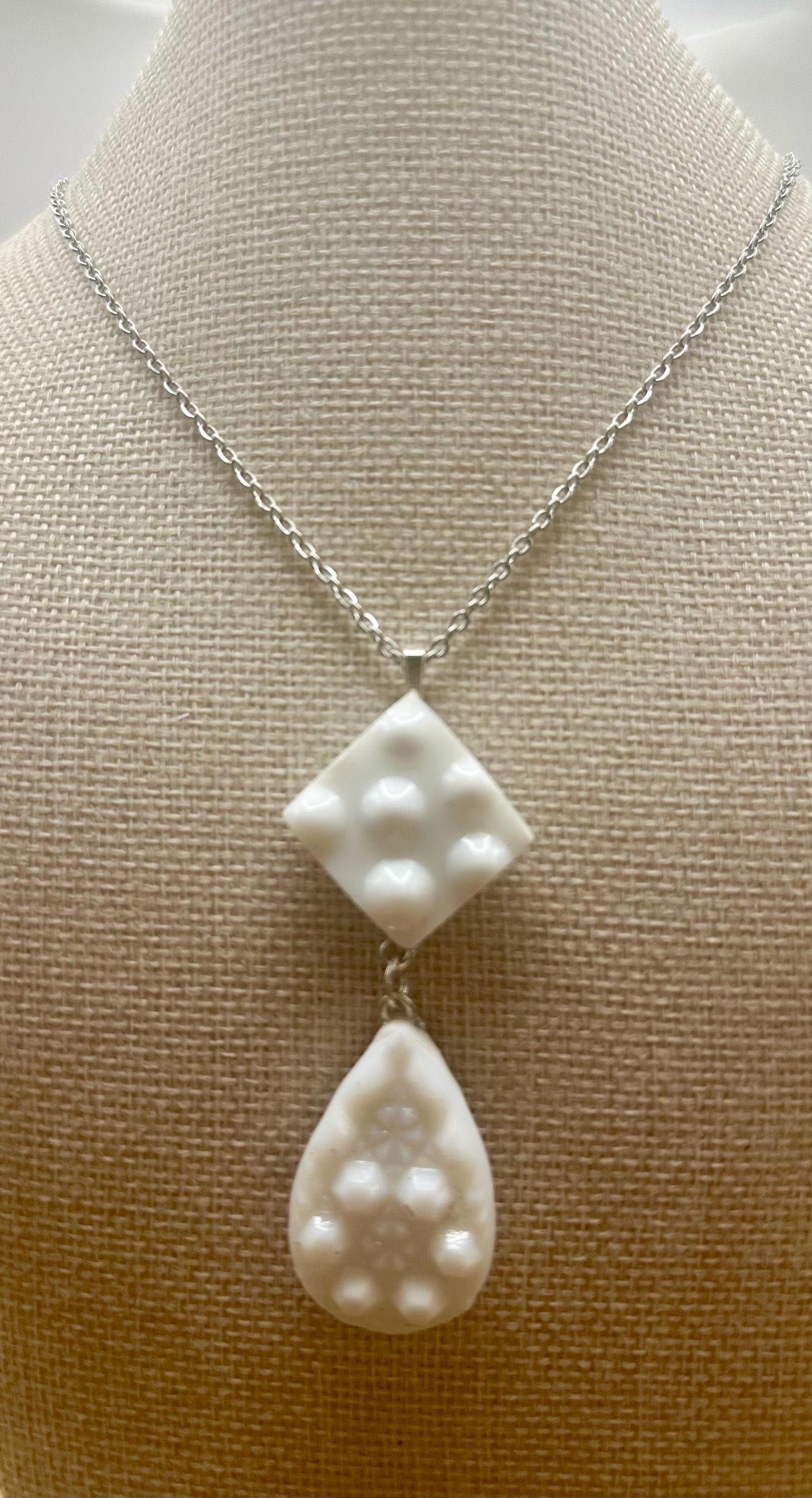 Discover the unique charm of our Handmade Fenton Candlestick Necklace, a stunning piece that seamlessly blends vintage elegance with contemporary design. Each necklace is meticulously crafted from a reclaimed Fenton candlestick, ensuring that no two pieces are alike. The pendant features hand-cut, ground, and polished details that showcase the intricate beauty of the original glass. The back of the pendant is adorned with luxurious gold leaf, adding a touch of opulence and sophistication. To enhance its durability, the entire piece is coated in a protective layer of high-quality resin, ensuring it withstands the test of time. This exquisite necklace hangs gracefully from a sturdy stainless steel cable chain, making it both stylish and versatile for any occasion. Elevate your jewelry collection with this one-of-a-kind statement piece that celebrates artistry and sustainability. Perfect for gifting or as a self-indulgence, the Handmade Fenton Candlestick Necklace is sure to turn heads and spark conversations.