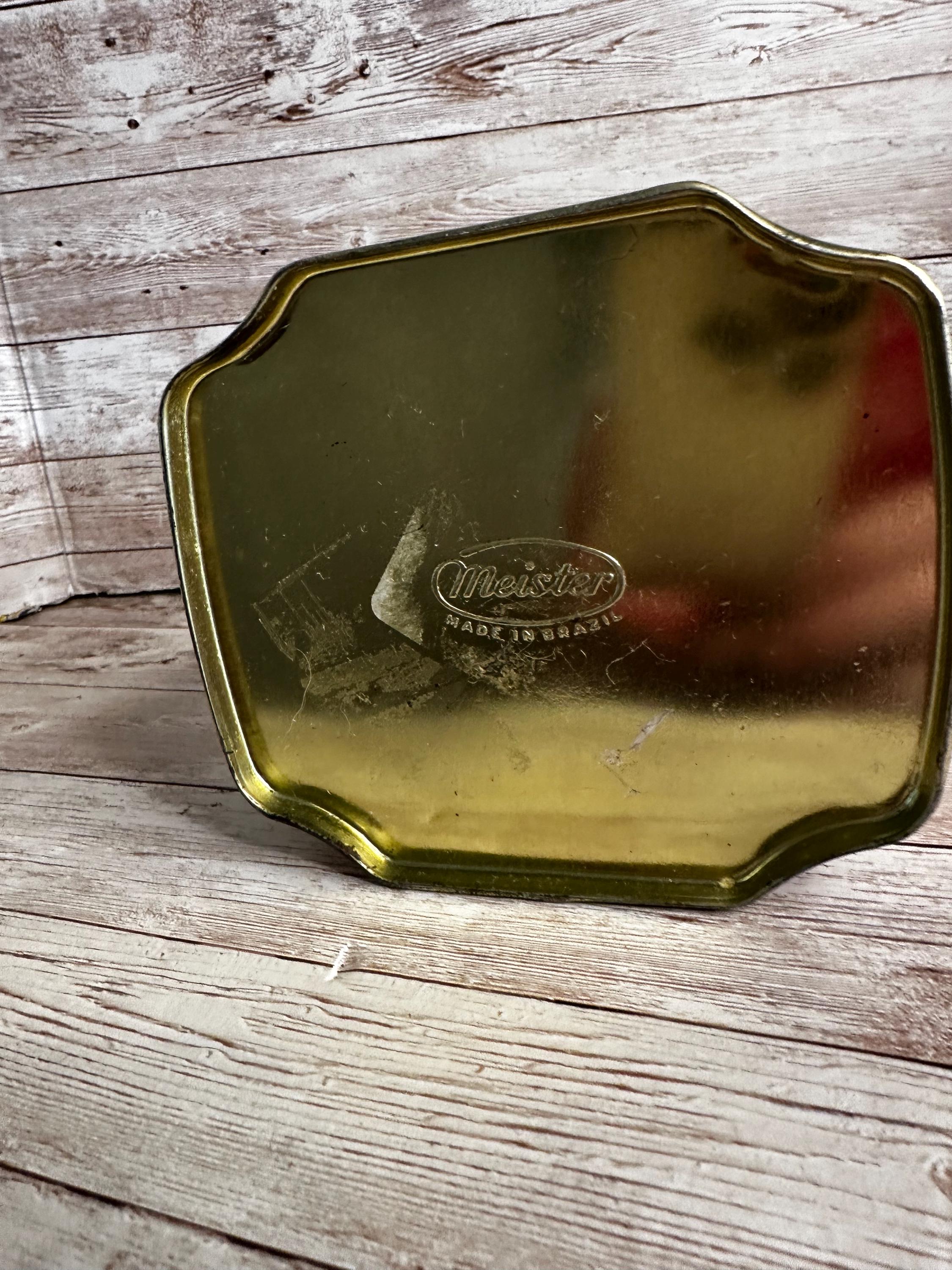 The vintage tin from Meister Brazil features a decorative lid with an intricate design of Cupid Cherubs in a garden setting. The tin is made of tin material and has a unique eight-sided shape. It is not handmade or modified. This collectible item showcases detailed artwork and craftsmanship, making it a charming addition to any collection.
