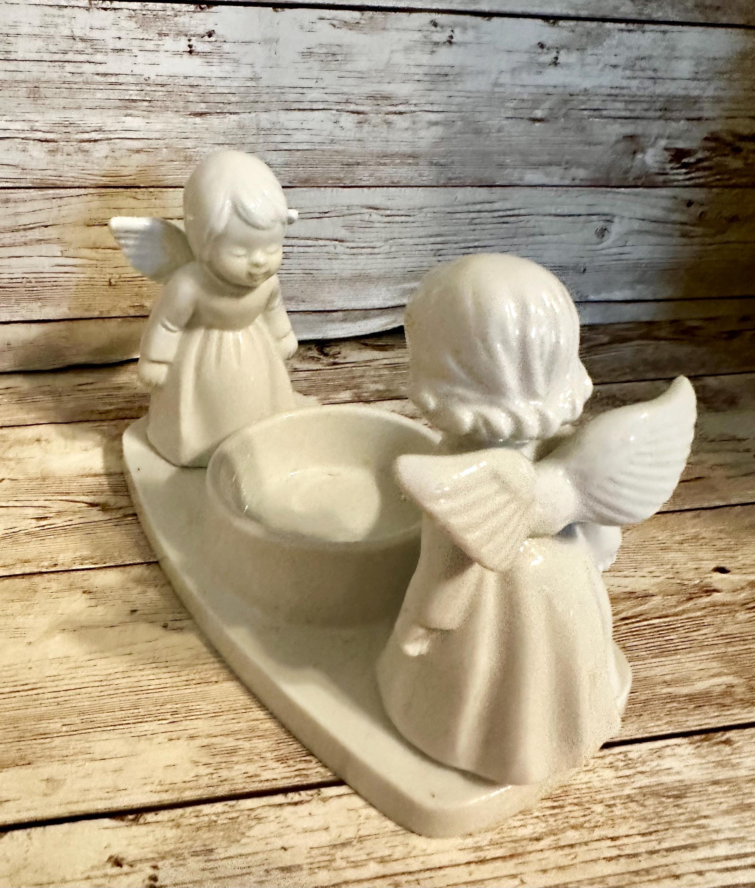 This vintage porcelain figurine features two small white and blue cherub angels kissing, doubling as a candle holder for tealights. The glossy finish adds a touch of elegance to the piece, which is from the 1980's and comes in its original box packaging. Made in China, this delicate Angel figurine is a lovely addition to any collector's display, with a theme of Angels, Christmas, and Love. Perfect for adding a whimsical and angelic touch to your home decor or for creating a peaceful ambiance with candlelight.
