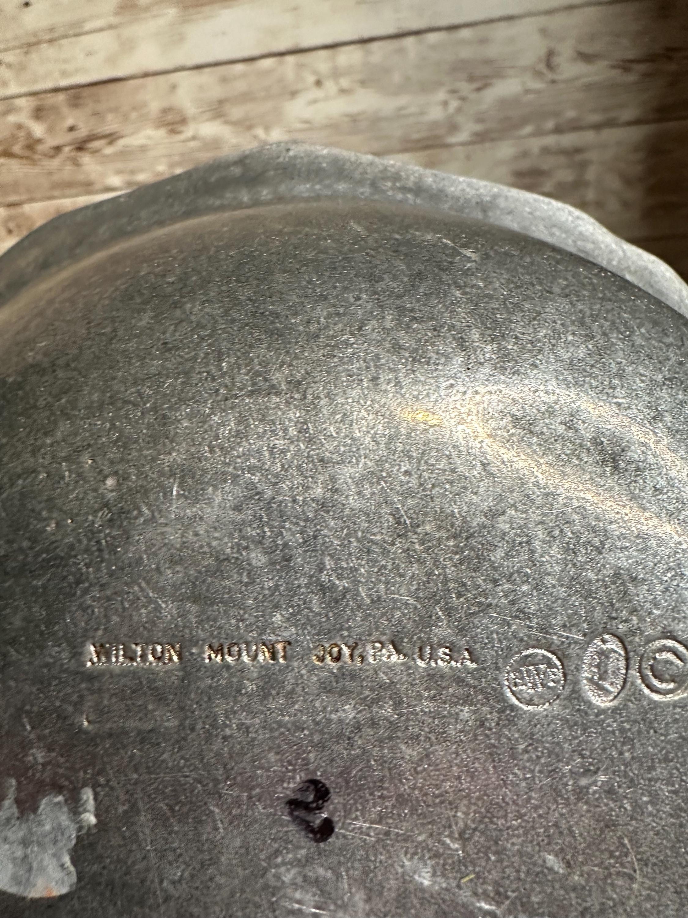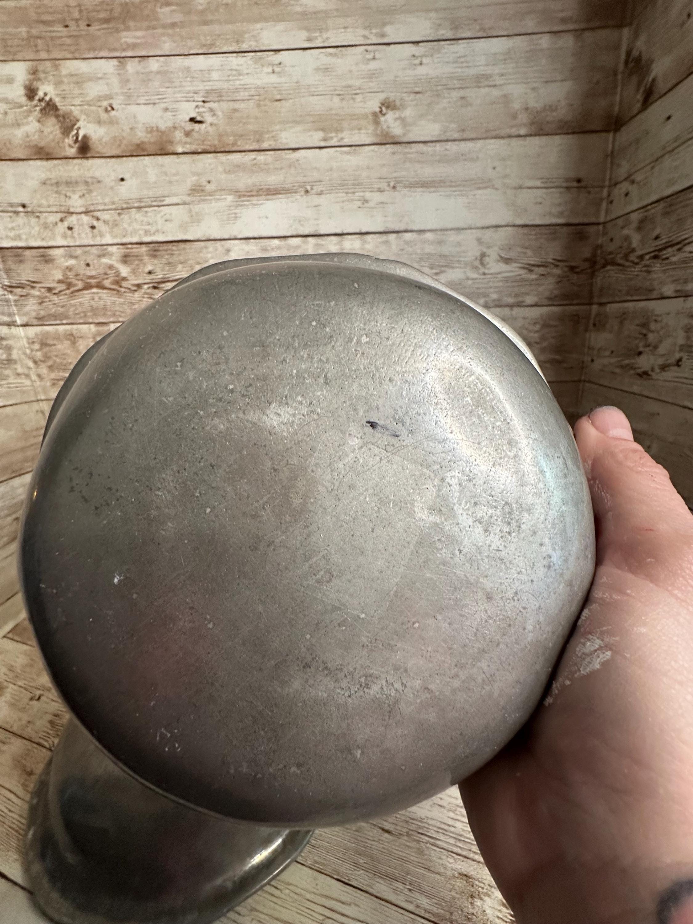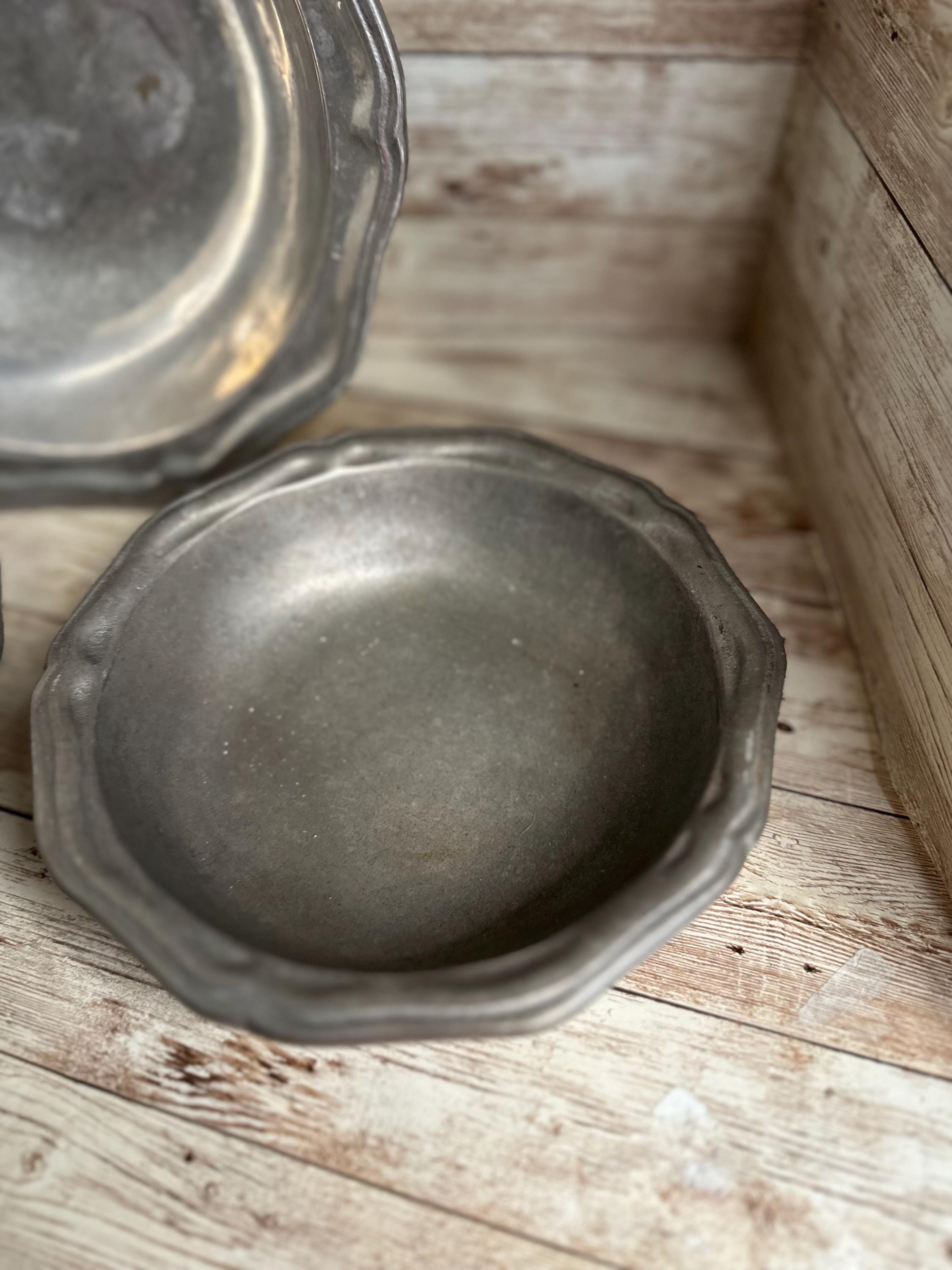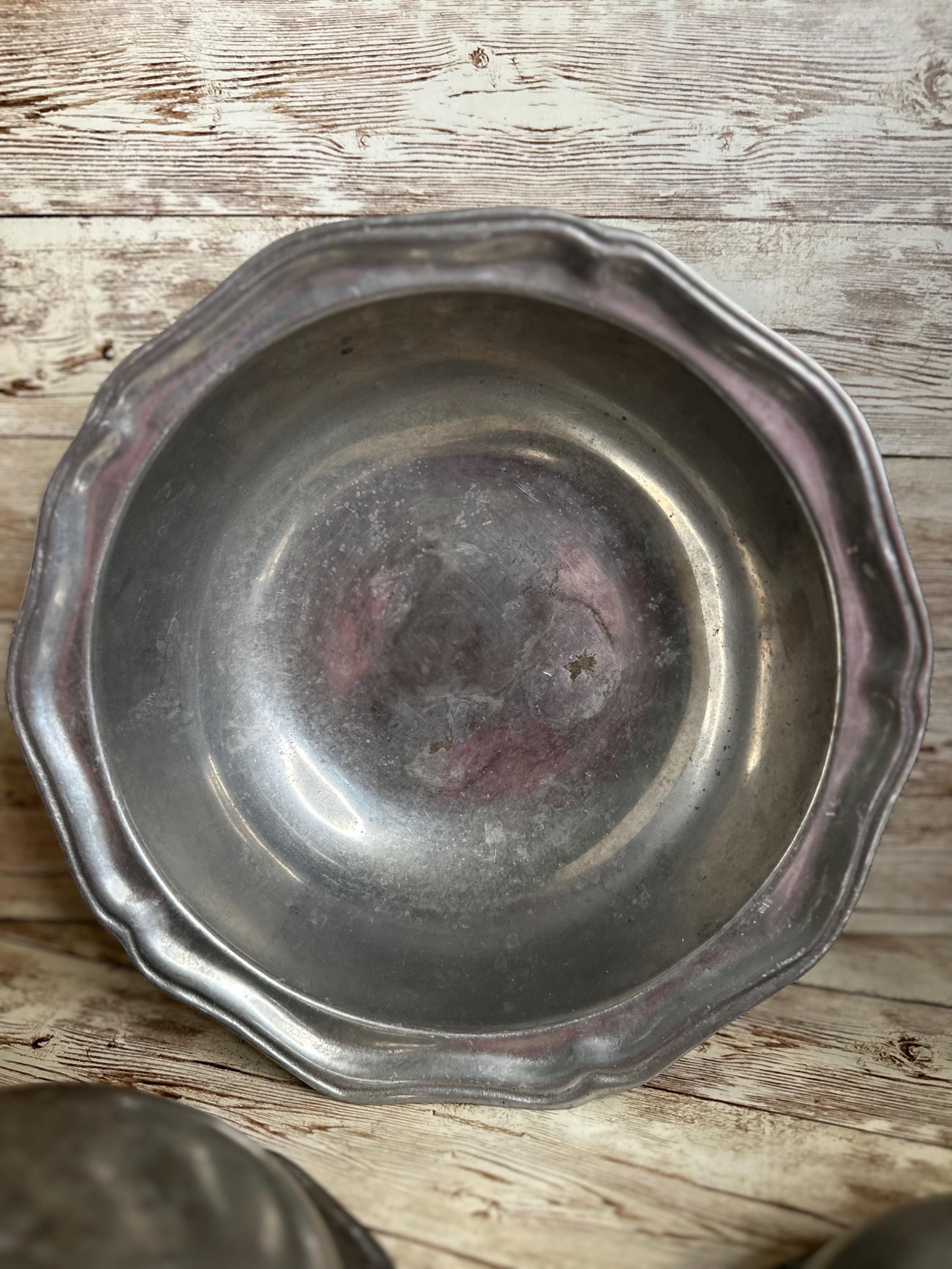 The product is a vintage Wilton Pewter Vegetable Serving Bowl measuring 9 inches, along with two additional 7-inch soup/cereal bowls. These items are made of pewter and were manufactured in the United States. They are not handmade or modified in any way. The set is ideal for serving vegetables or soups and cereals, adding a touch of vintage charm to any table setting.