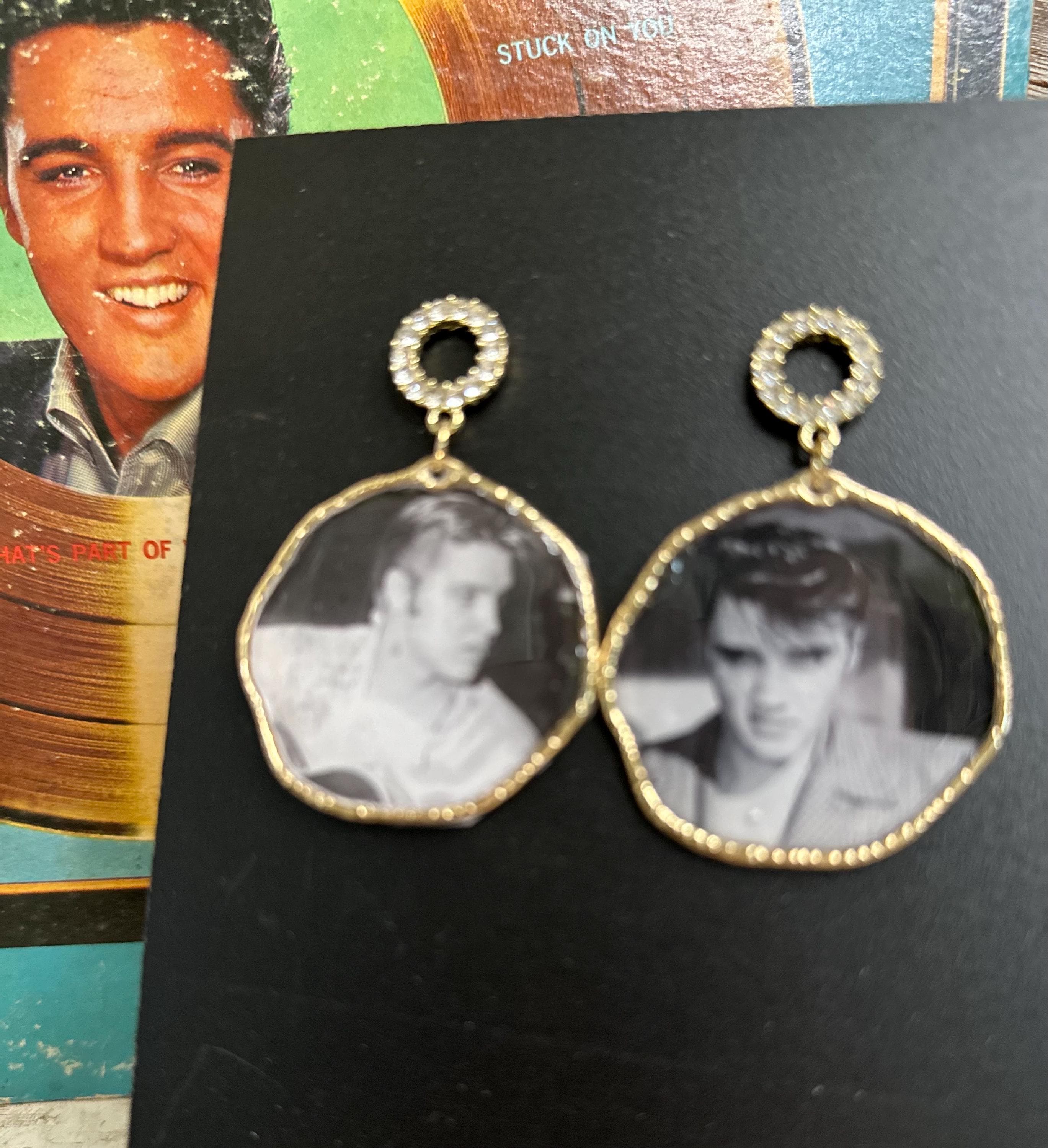 Step back in time with these one-of-a-kind statement earrings featuring iconic images from Elvis Presley's 1995 calendar. Each piece is handcrafted, showcasing handsome Elvis and set in a gold alloy bezel, The earrings are expertly covered in durable resin, providing both beauty and longevity. Finished with rhinestone circle post. Celebrate the King of Rock 'n' Roll while making a sustainable fashion statement!