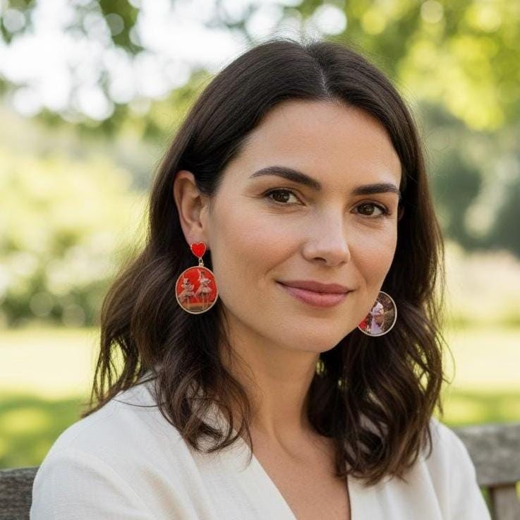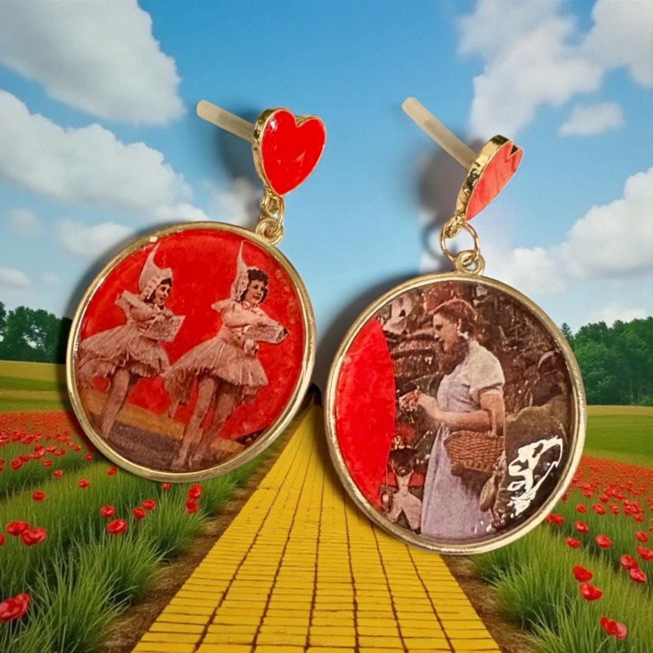 Introducing these charming earrings made from a vintage 1988 Wizard of Oz Valentine card, beautifully preserved in a gold alloy bezel. Each piece is carefully set under a glossy layer of resin, ensuring the intricate details and vibrant colors are protected and showcased from both the front and back, The earrings are finished with Gold heart stud findings, making them a perfect blend of nostalgia and whimsy. These unique earrings are ideal for anyone looking to add a romantic flair to their accessory collection!