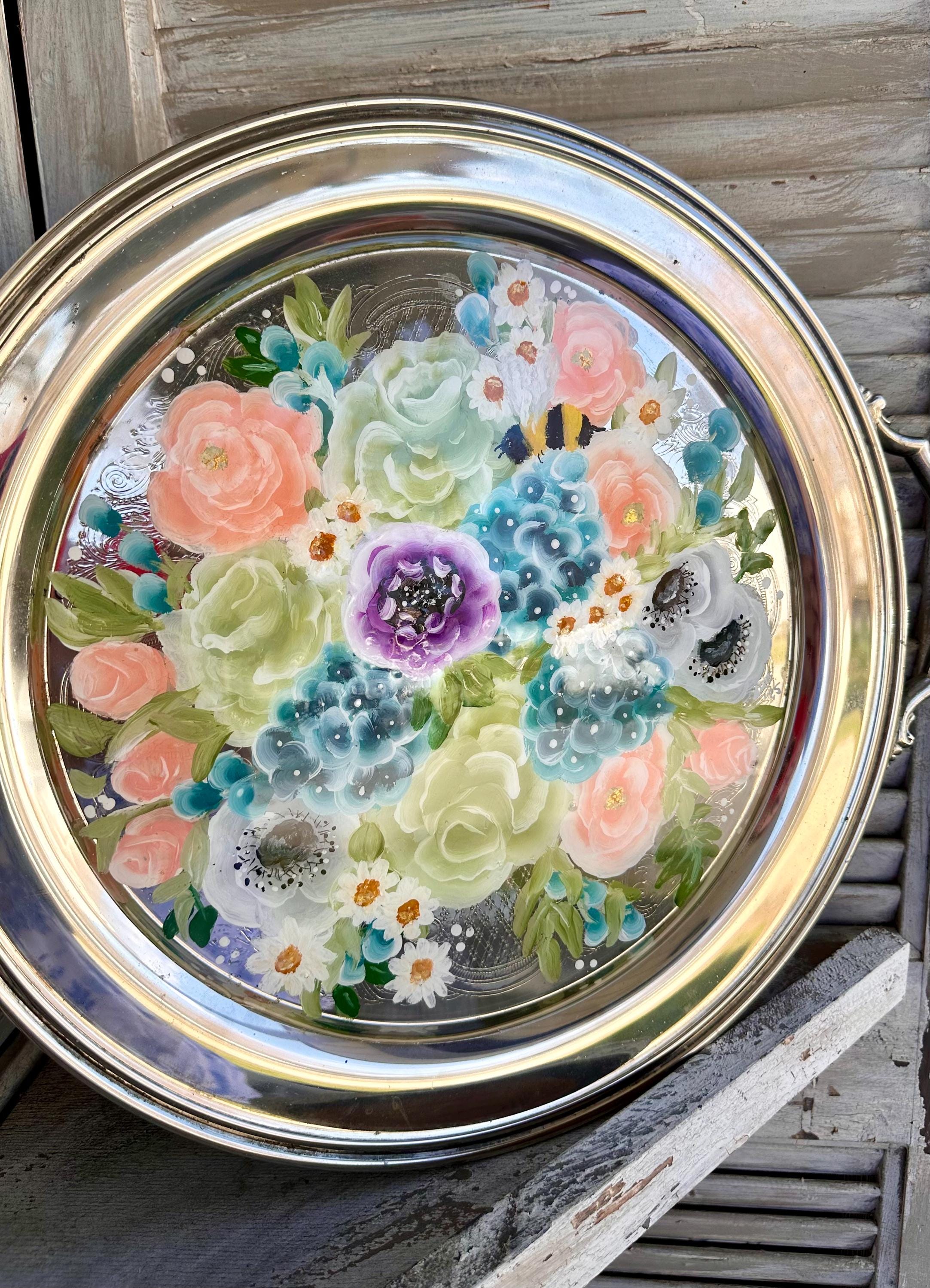 **Key Features:** - Hand-painted with vibrant spring florals - Food-grade resin coating for safe serving - Vintage sterling silver finish for timeless elegance - Perfect for gatherings, special occasions, and everyday use