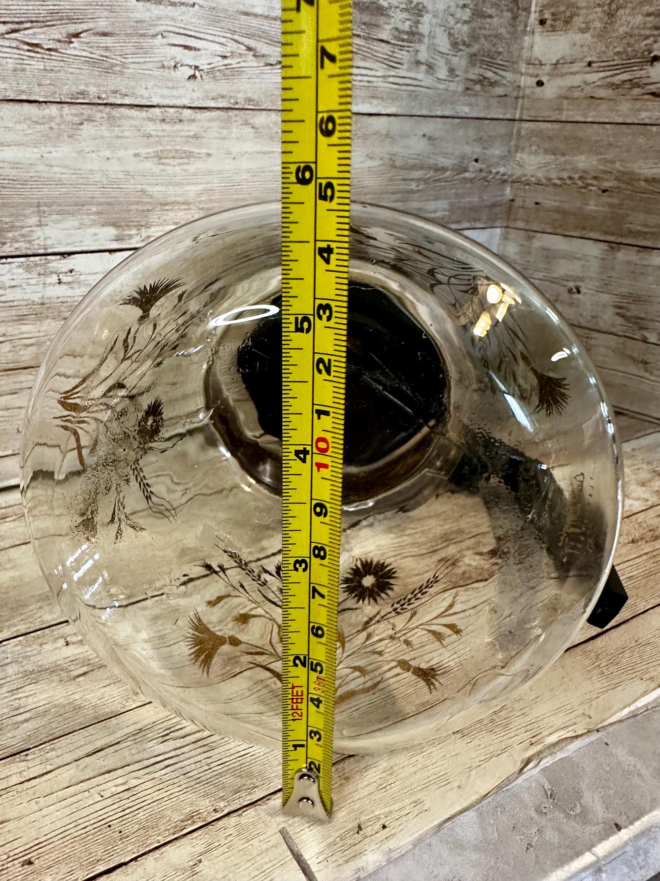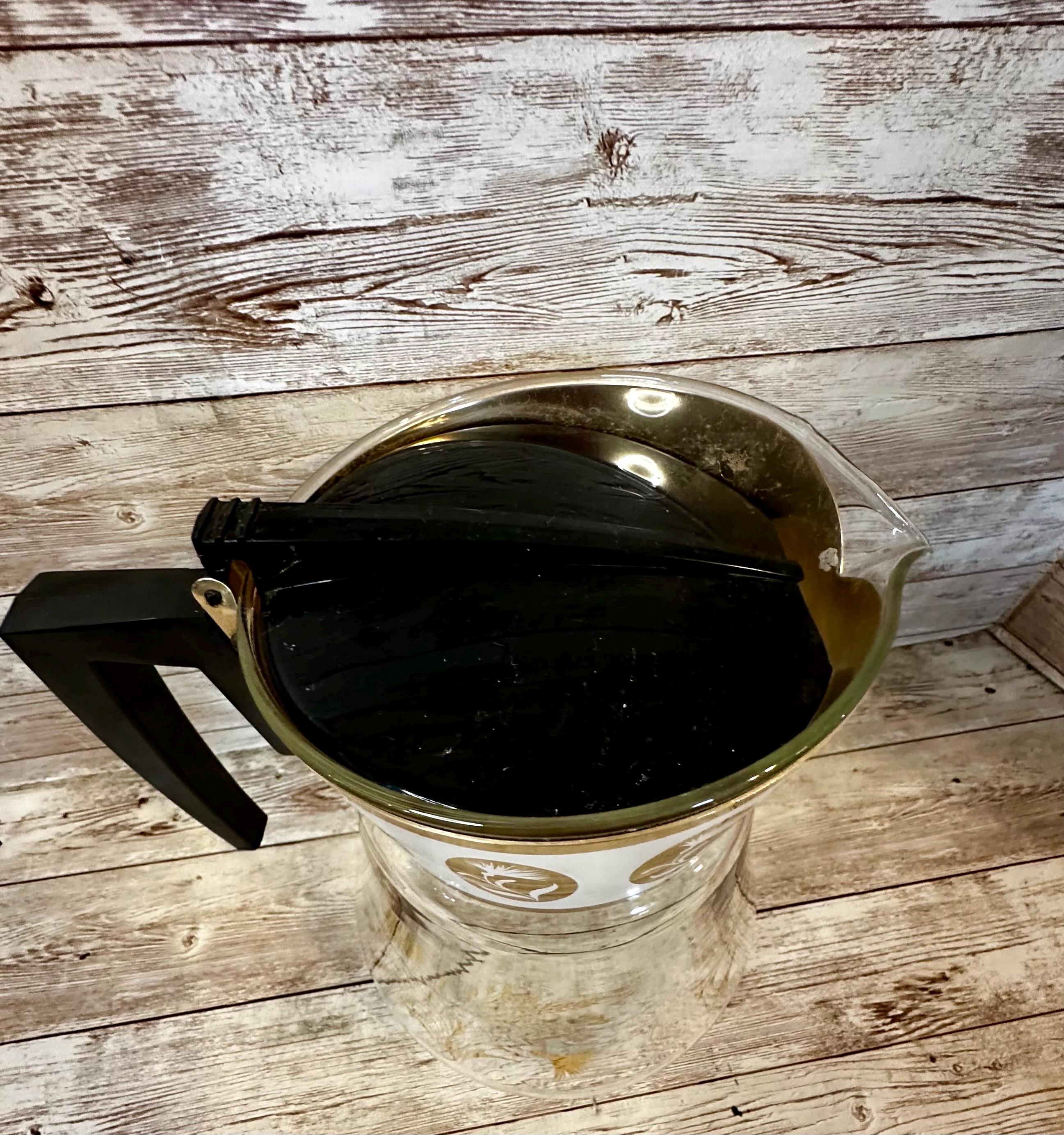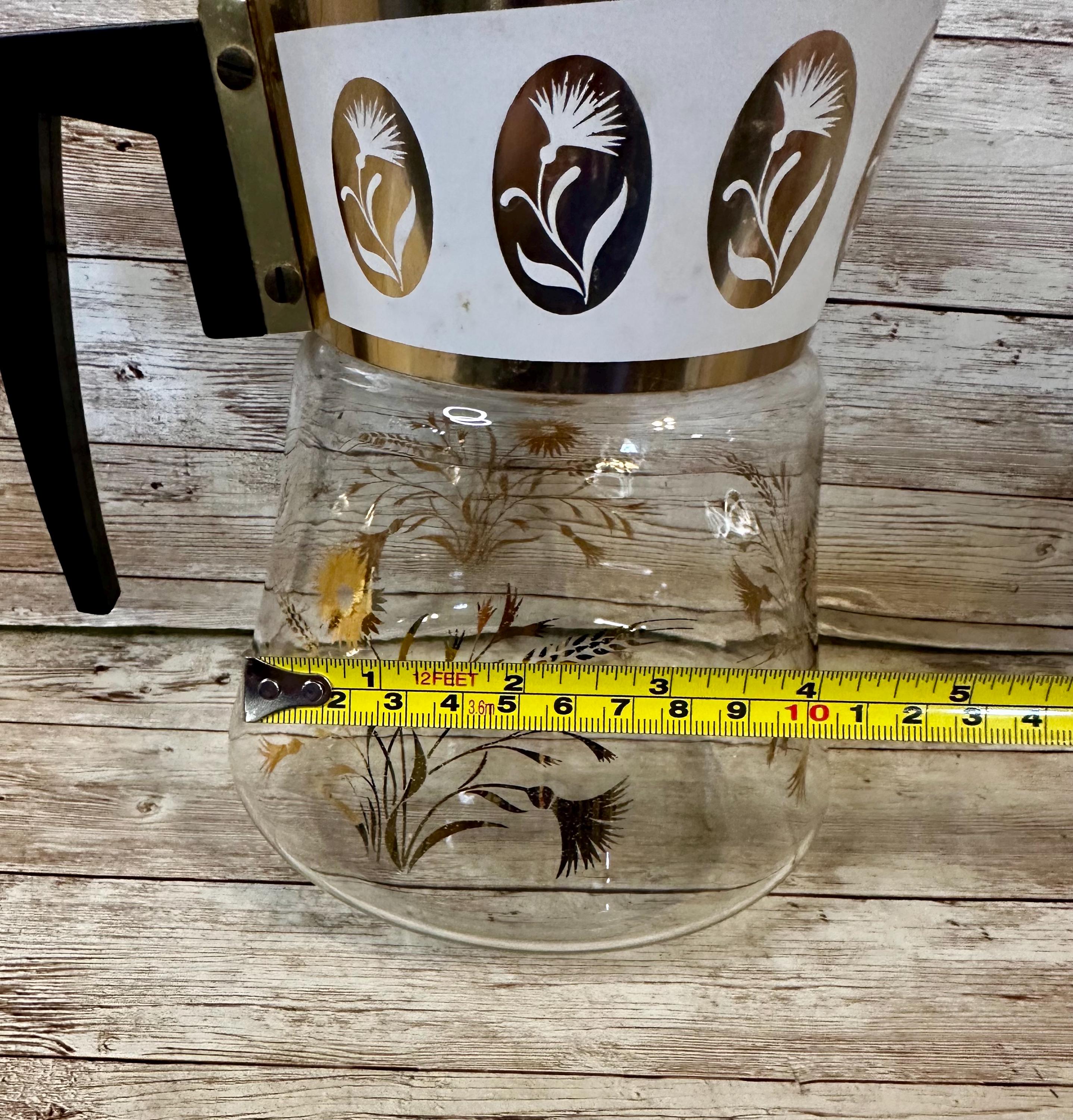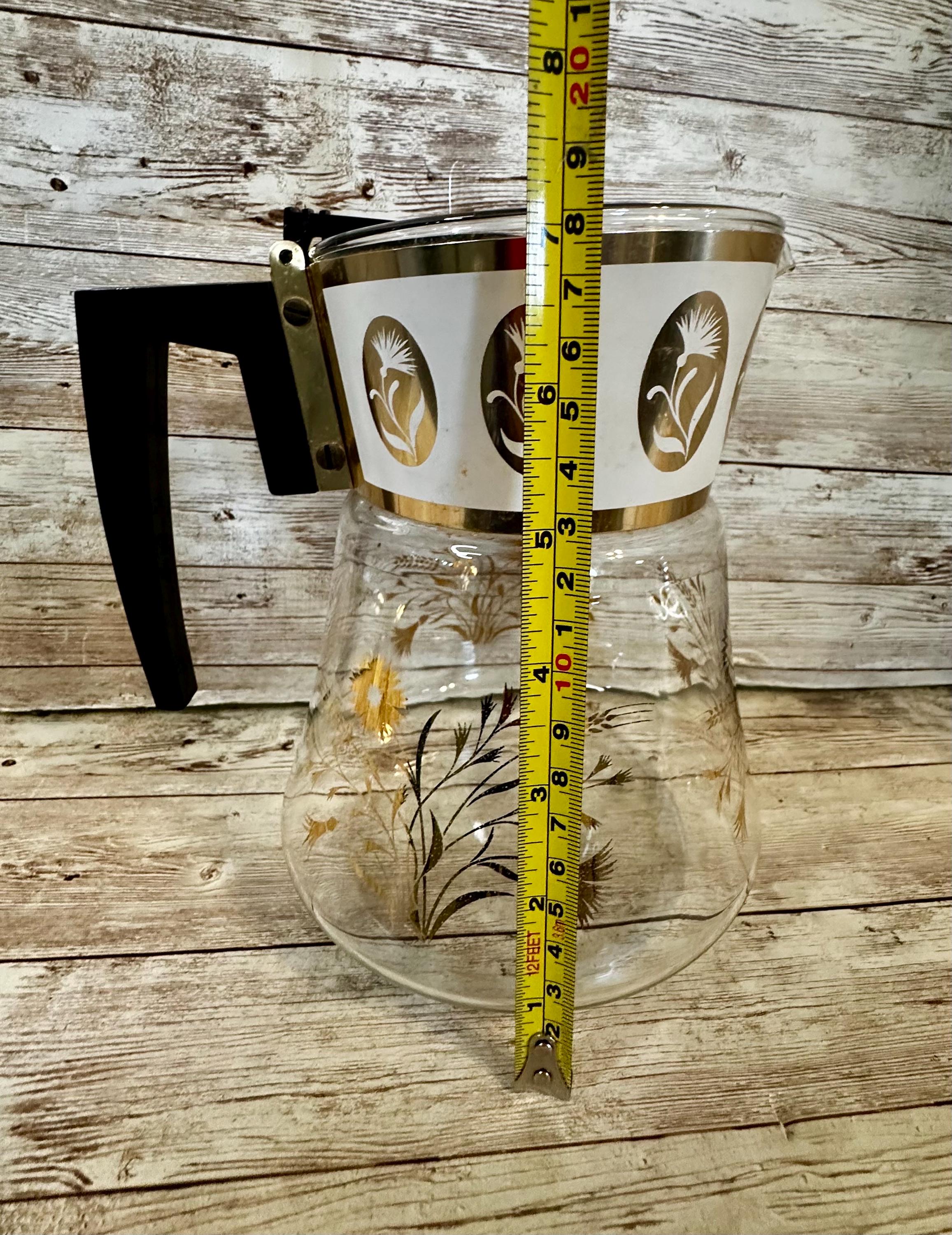 This vintage David Douglas Flameproof Glass Coffee Pot is a mid-century modern piece featuring a striking gold floral pattern. The carafe is designed for brewing coffee and has a bean/coffee capacity suitable for multiple servings. Made of durable glass, this original piece from the 1960s boasts a unique atomic design that adds a touch of retro charm to any kitchen. The carafe's dimensions can be seen in the photos provided, showcasing its height, width, and depth.