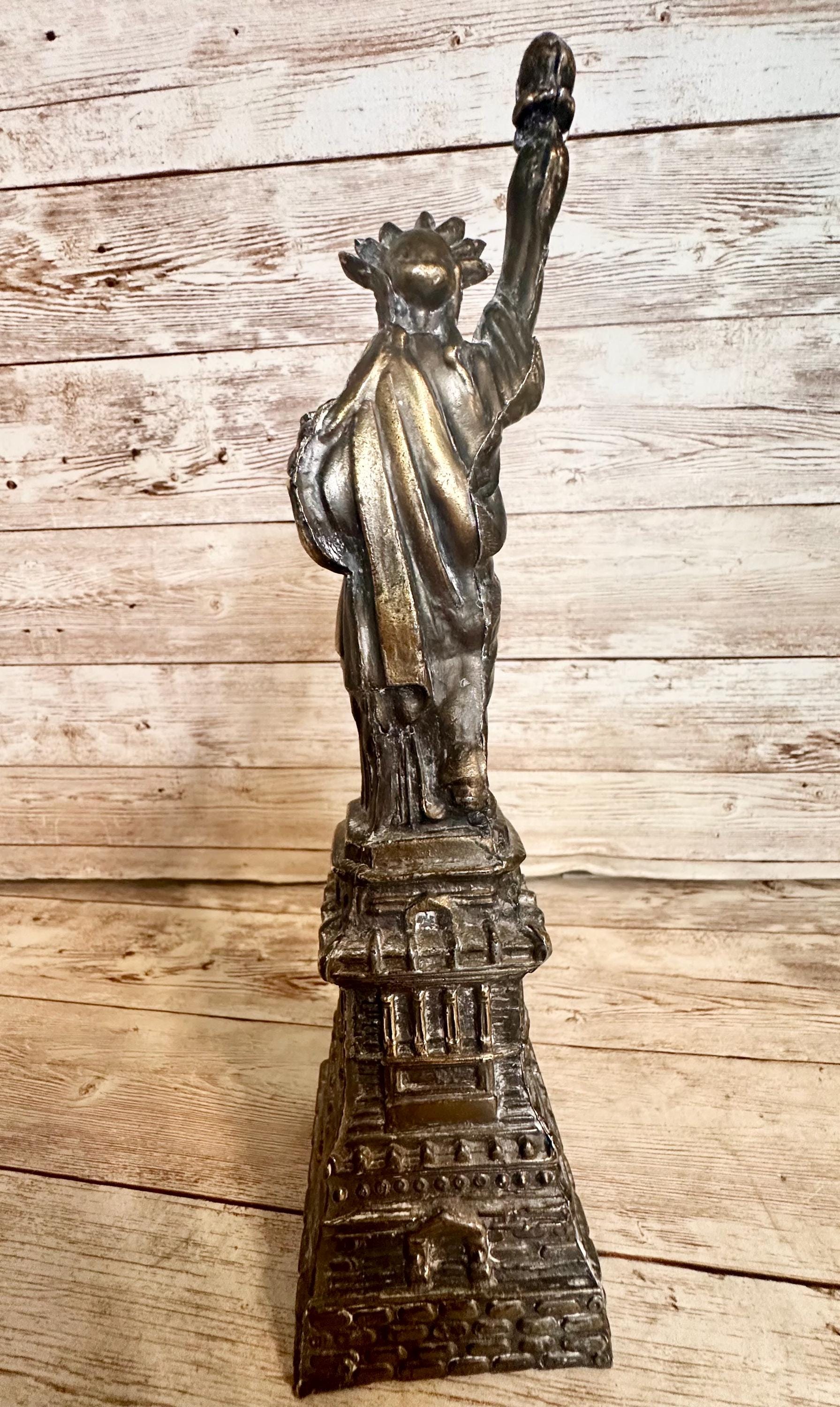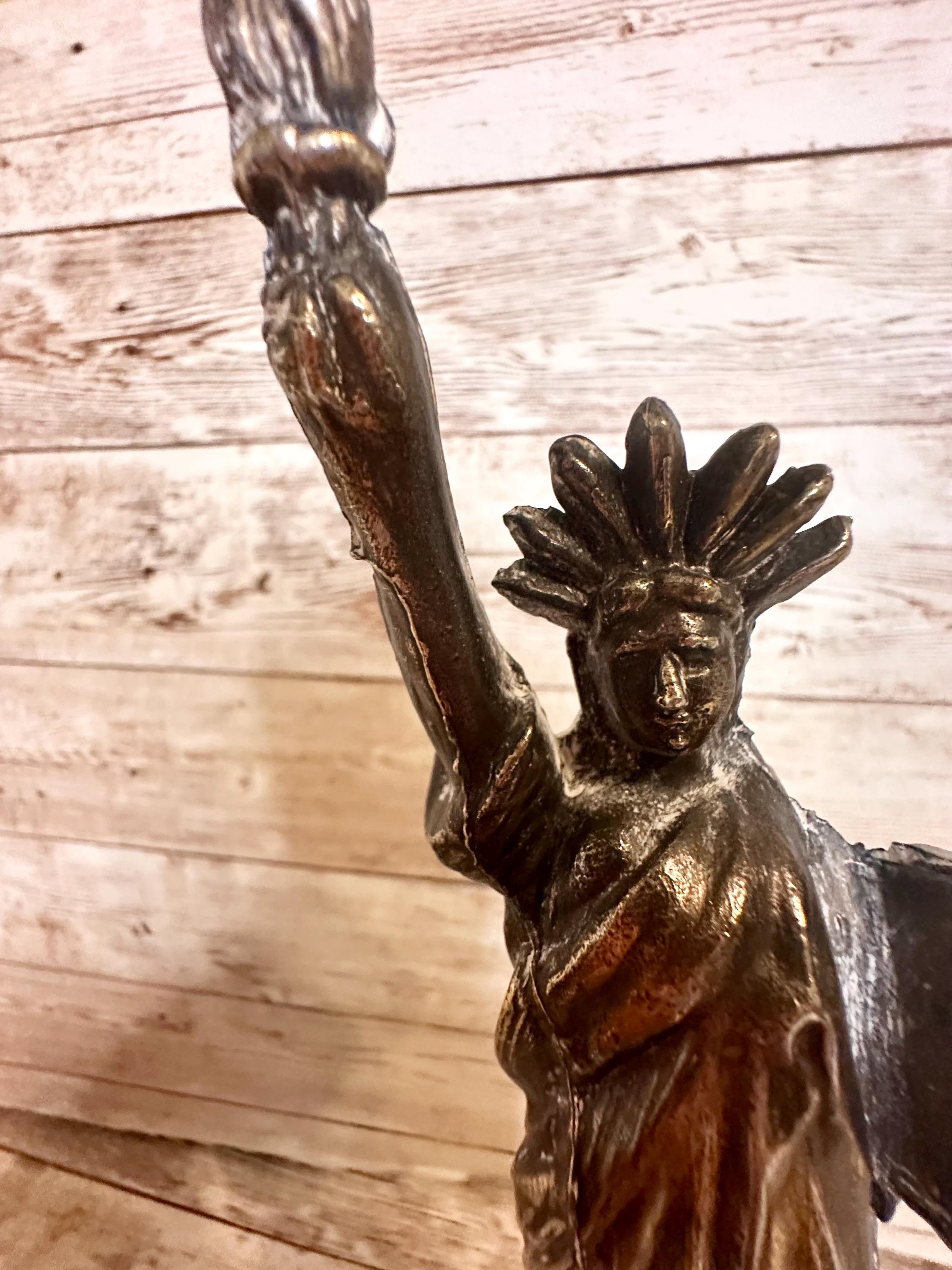 This is a small figurine of the Statue of Liberty, measuring 9 3/4 inches tall and made of cast aluminum with a brass finish. The figurine is patriotic in theme and depicts a landmark, the Statue of Liberty, in a brass color. It was manufactured in Japan and is a decorative piece ideal for home decor.
